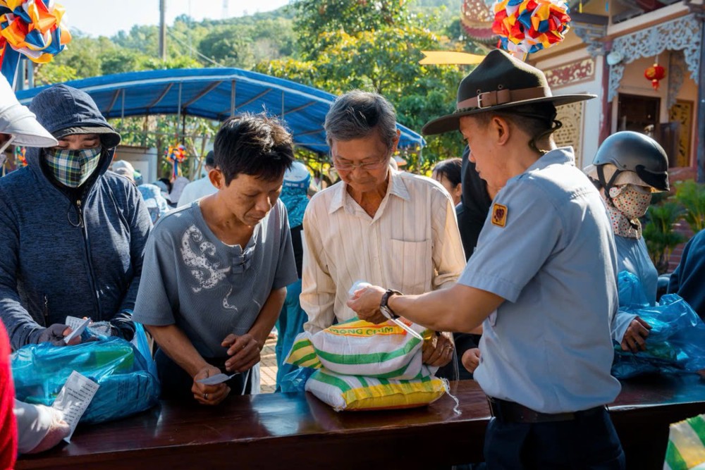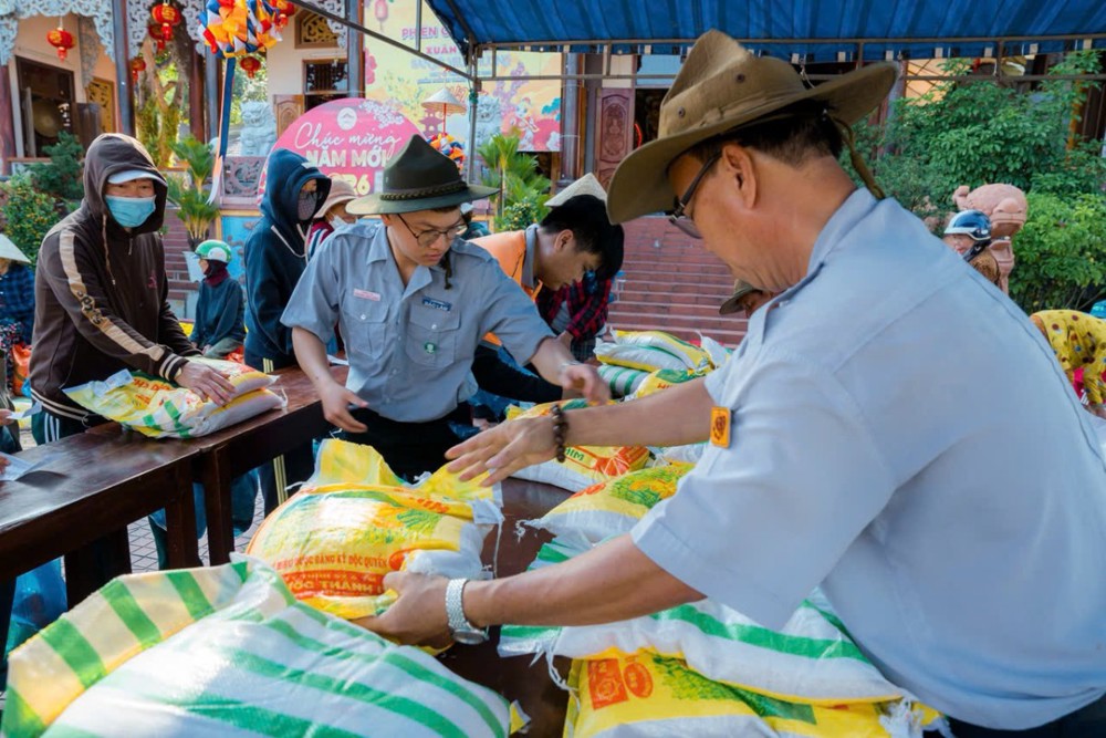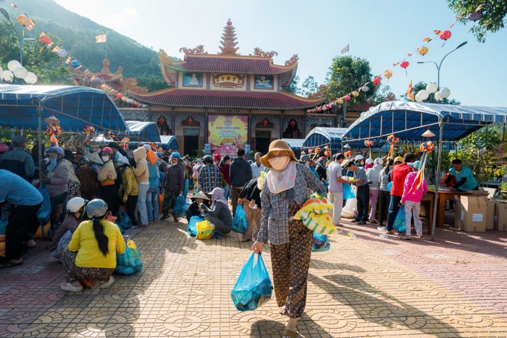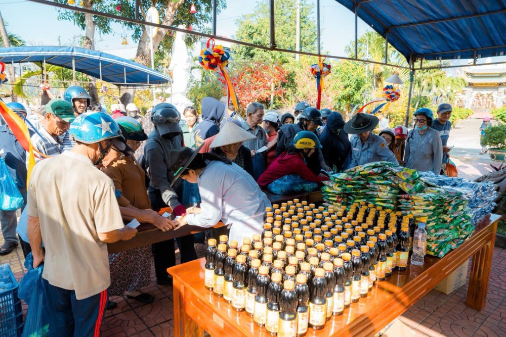 Ngay từ đầu giờ chiều, khuôn viên Tổ đình Bảo Lâm đã trở nên nhộn nhịp nhưng vẫn giữ được vẻ trang nghiêm, thanh tịnh vốn có của chốn thiền môn. Những gian hàng được bố trí gọn gàng, đầy ắp các nhu yếu phẩm thiết yếu như gạo, mì, dầu ăn, nước mắm, bánh kẹo, quần áo, cùng nhiều vật dụng sinh hoạt hằng ngày. Mỗi gian hàng không đơn thuần là nơi trao tặng vật phẩm, mà còn là nơi trao gửi sự quan tâm, tình thương và tinh thần tương thân tương ái.