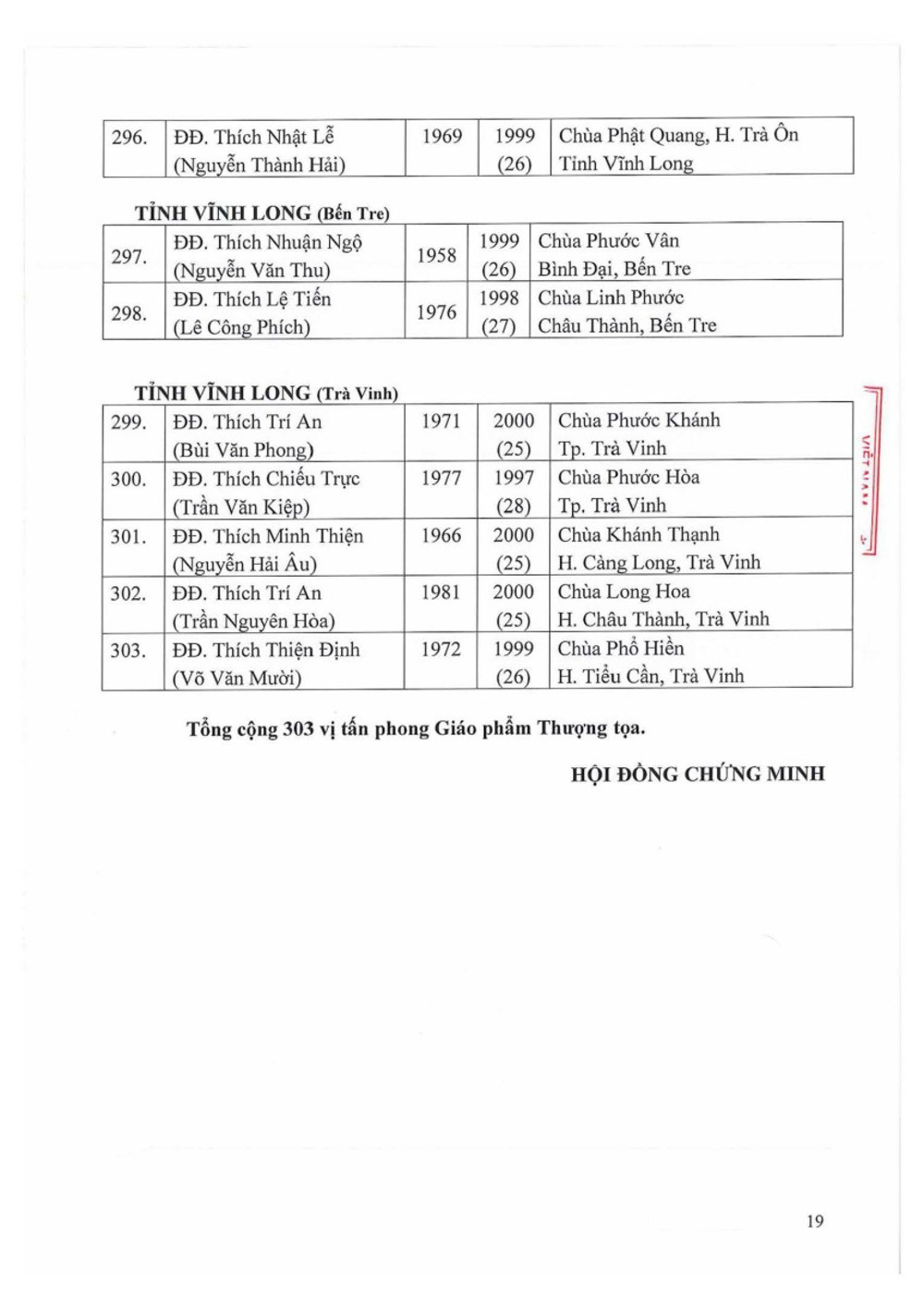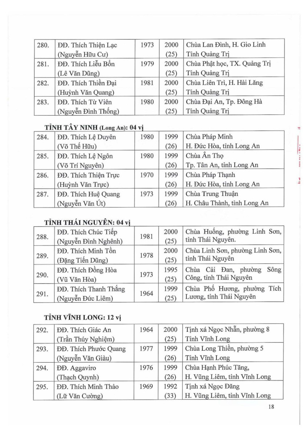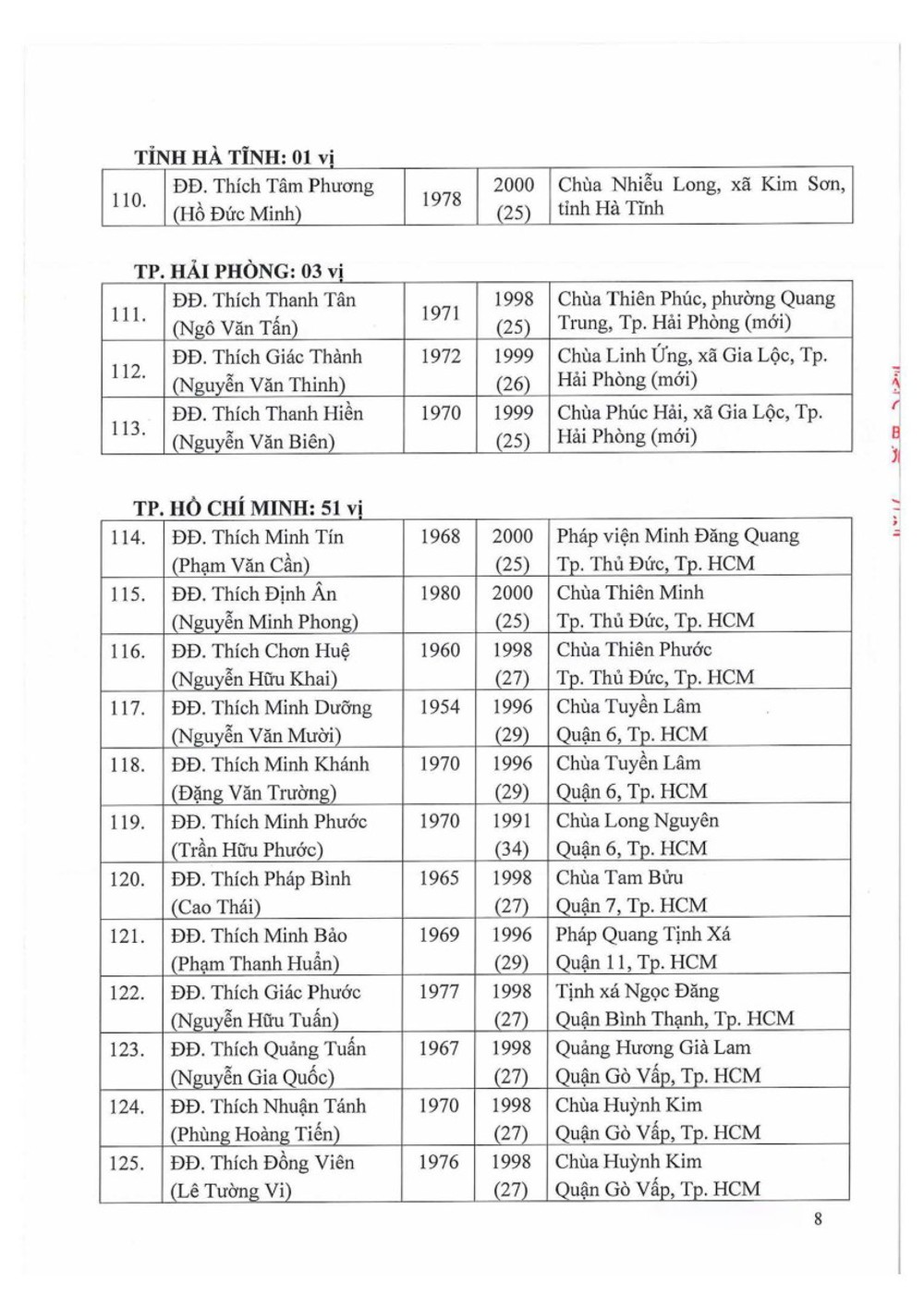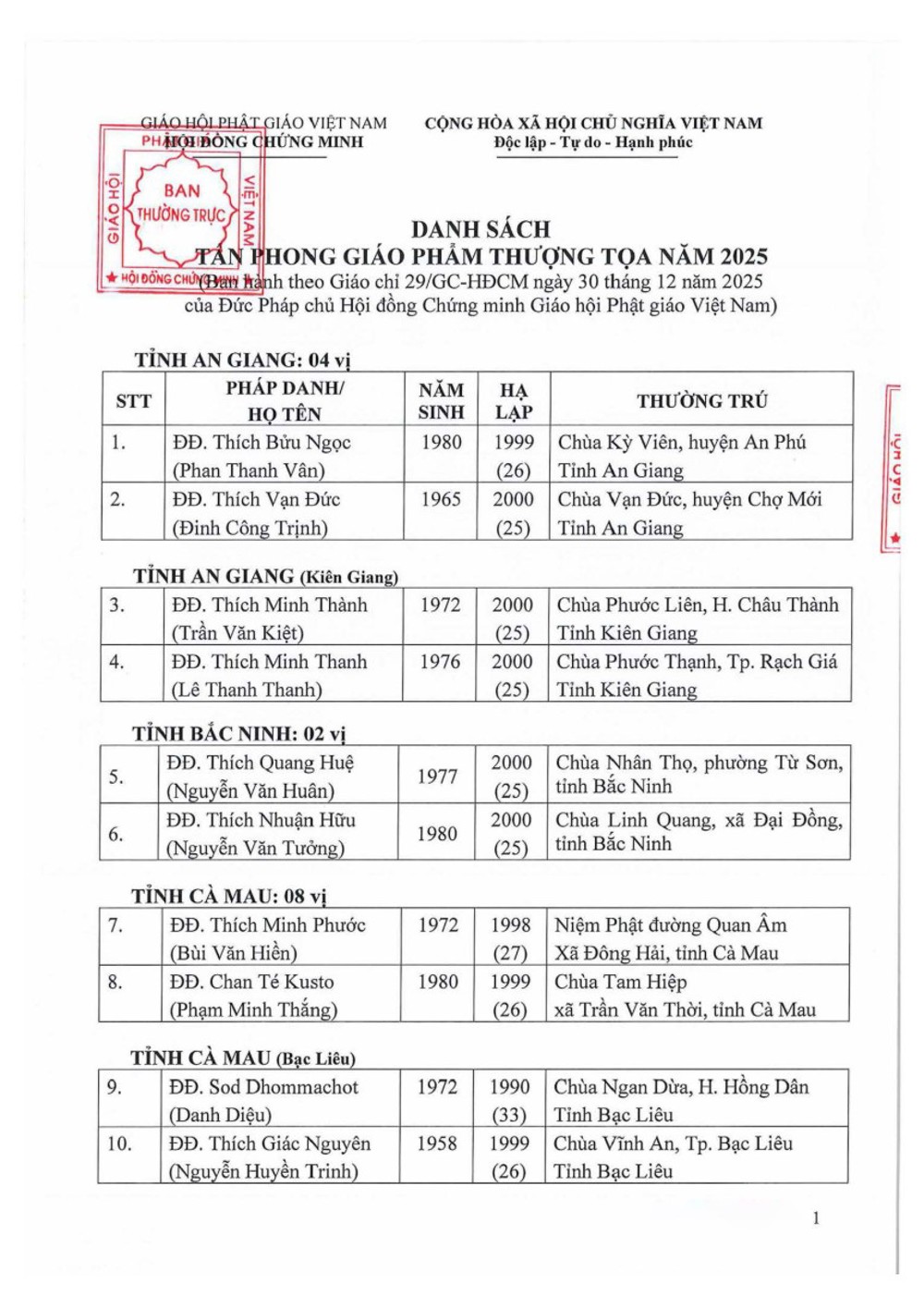 Danh sách tấn phong giáo phẩm Thượng tọa năm 2025 gồm 303 vị. Cụ thể: tỉnh An Giang có 4 vị, tỉnh Bắc Ninh 2 vị, tỉnh Cà Mau 8 vị, TP.Cần Thơ 11 vị, TP. Đà Nẵng 32 vị, tỉnh Đắk lắk 6 vị, tỉnh Đồng Nai 14 vị, tỉnh Đồng Tháp 8 vị, tỉnh Gia Lai 12 vị, TP. Hà Nội 12 vị, tỉnh Hà Tĩnh 1 vị, TP. Hải Phòng 3 vị, TP.HCM 51 vị, TP.Huế 45 vị, tỉnh Hưng Yên 6 vị, tỉnh Khánh Hòa 11 vị, tỉnh Lâm Đồng 25 vị, tỉnh Ninh Bình 8 vị, tỉnh Phú Thọ 2 vị, tỉnh Quảng Ninh 2 vị, tỉnh Quảng Ngãi 9 vị, tỉnh Quảng Trị 11 vị, tỉnh Tây Ninh 4 vị, tỉnh Thái Nguyên 4 vị, tỉnh Vĩnh Long 12 vị.