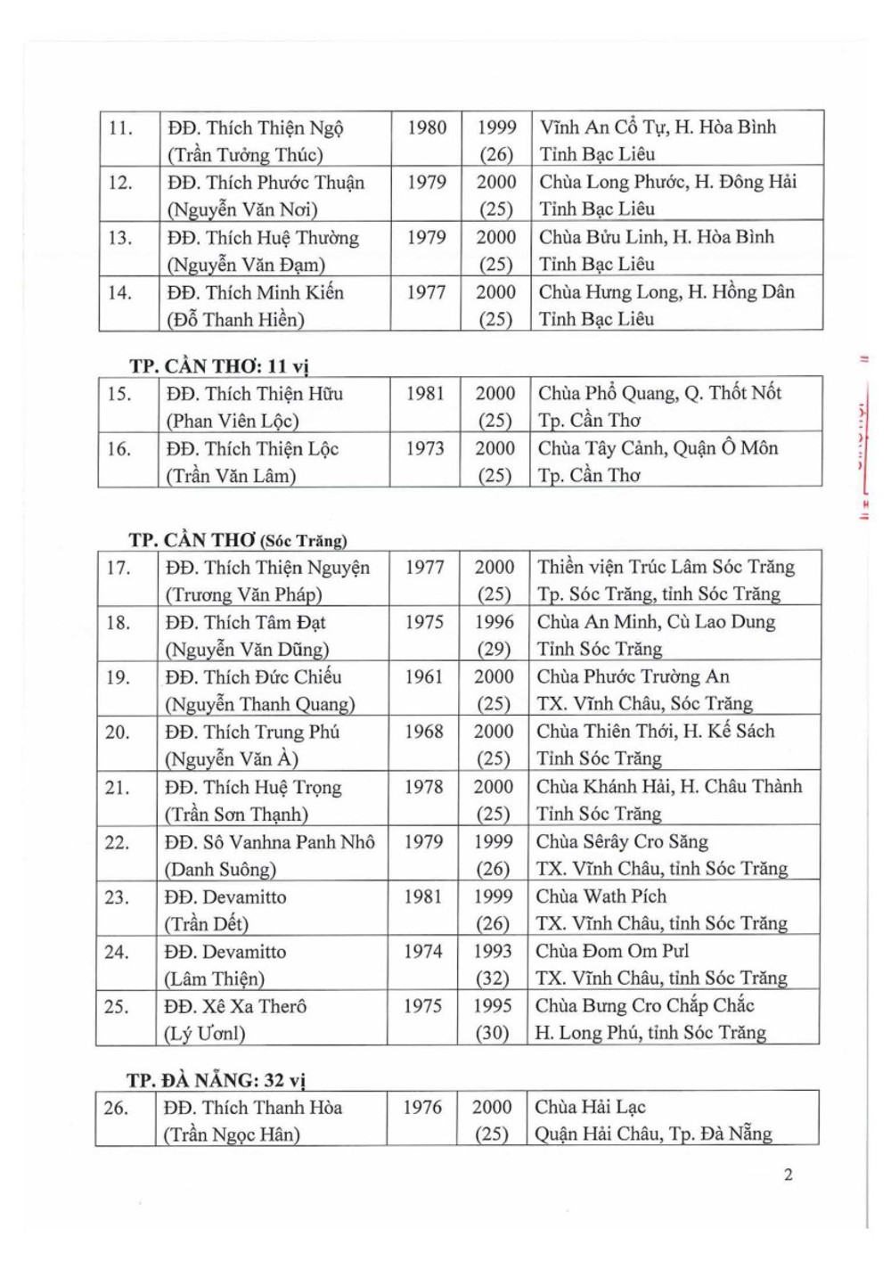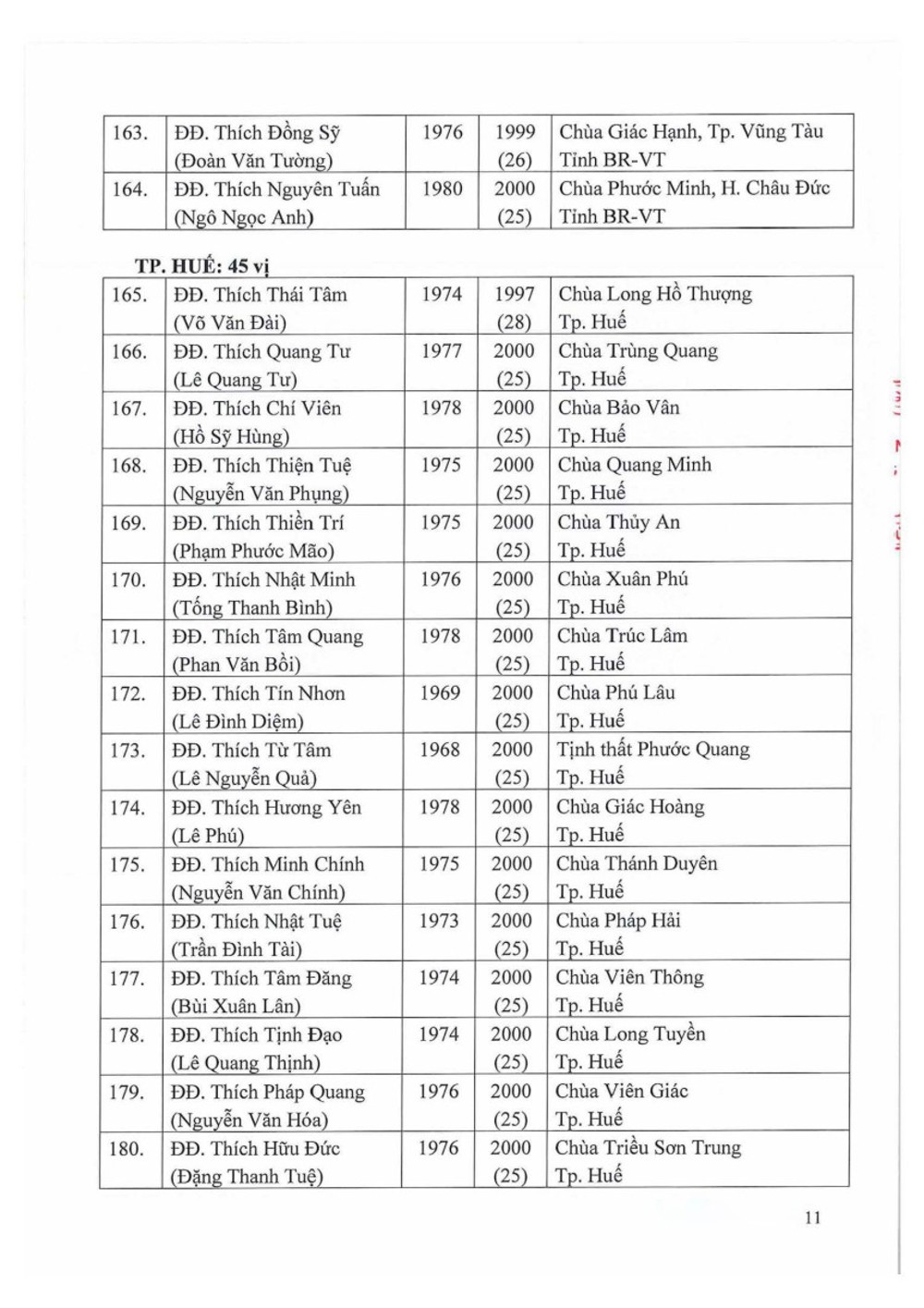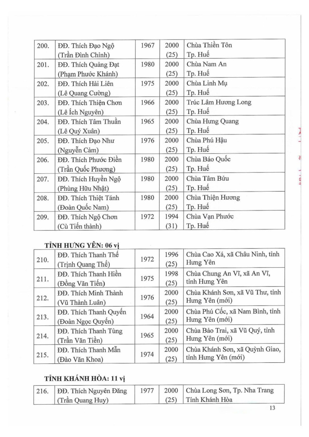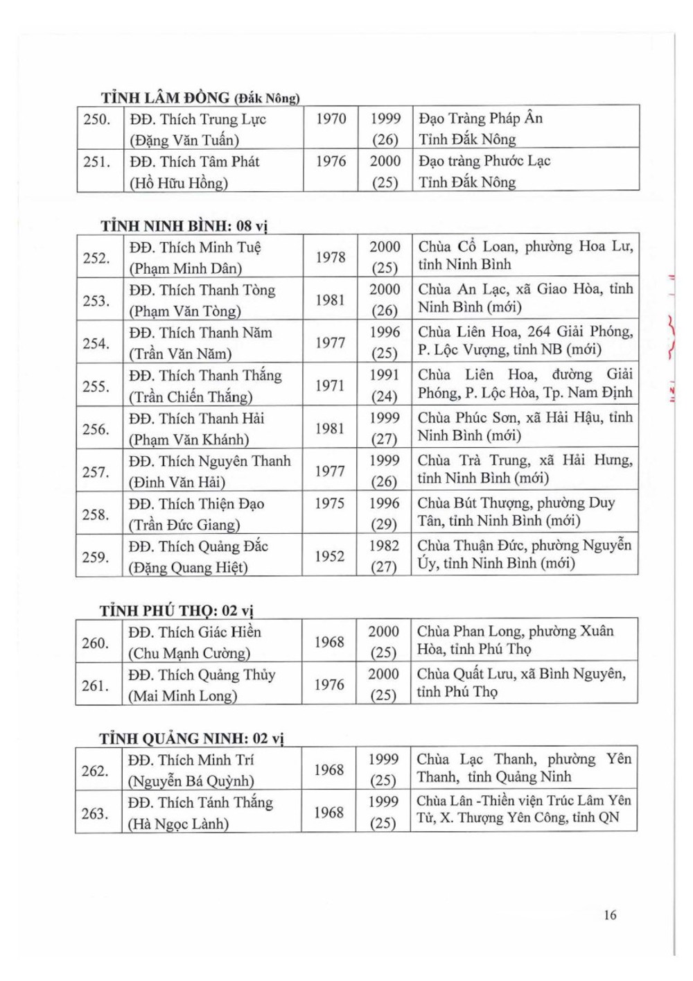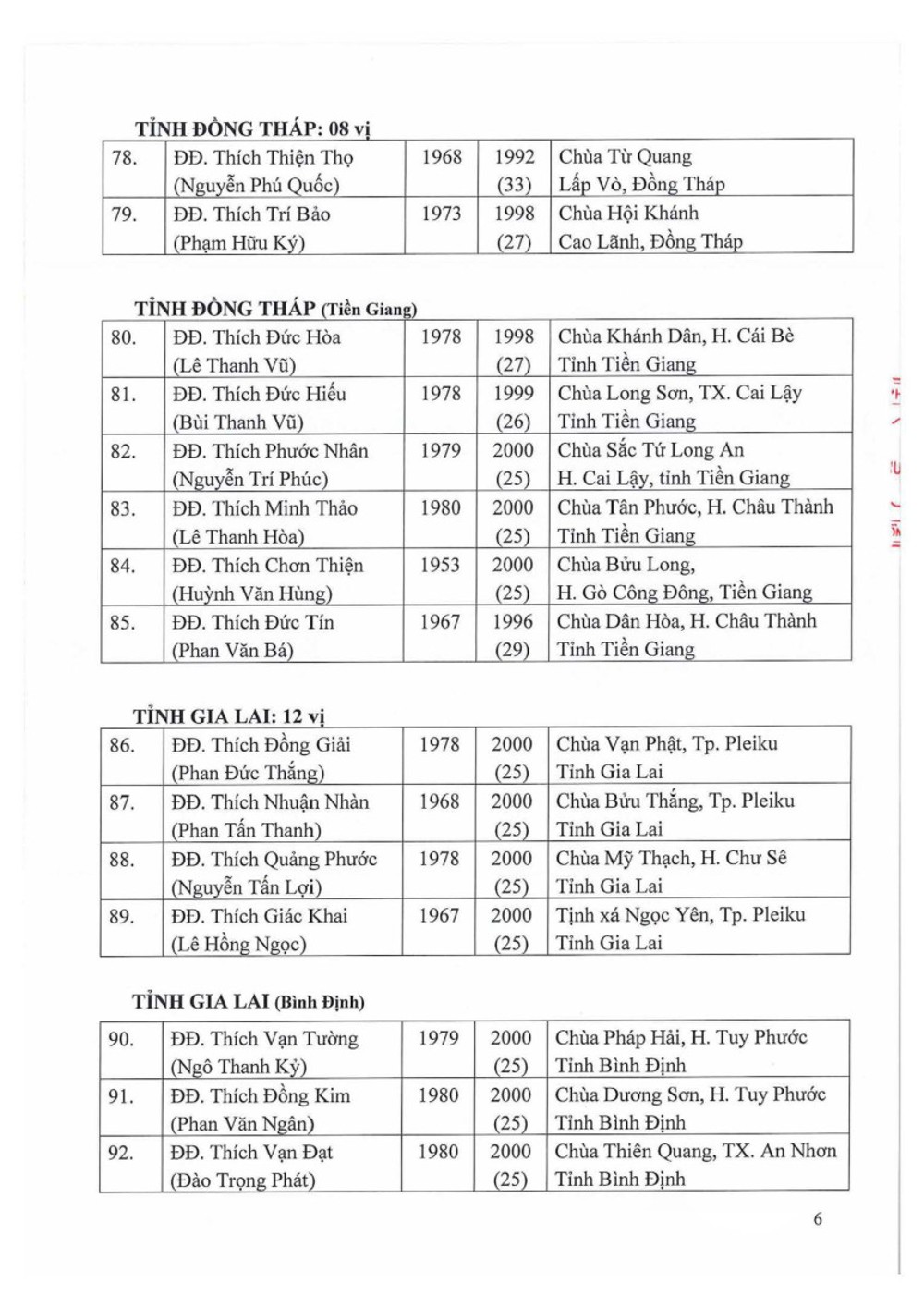 Danh sách tấn phong giáo phẩm Thượng tọa năm 2025 gồm 303 vị. Cụ thể: tỉnh An Giang có 4 vị, tỉnh Bắc Ninh 2 vị, tỉnh Cà Mau 8 vị, TP.Cần Thơ 11 vị, TP. Đà Nẵng 32 vị, tỉnh Đắk lắk 6 vị, tỉnh Đồng Nai 14 vị, tỉnh Đồng Tháp 8 vị, tỉnh Gia Lai 12 vị, TP. Hà Nội 12 vị, tỉnh Hà Tĩnh 1 vị, TP. Hải Phòng 3 vị, TP.HCM 51 vị, TP.Huế 45 vị, tỉnh Hưng Yên 6 vị, tỉnh Khánh Hòa 11 vị, tỉnh Lâm Đồng 25 vị, tỉnh Ninh Bình 8 vị, tỉnh Phú Thọ 2 vị, tỉnh Quảng Ninh 2 vị, tỉnh Quảng Ngãi 9 vị, tỉnh Quảng Trị 11 vị, tỉnh Tây Ninh 4 vị, tỉnh Thái Nguyên 4 vị, tỉnh Vĩnh Long 12 vị.