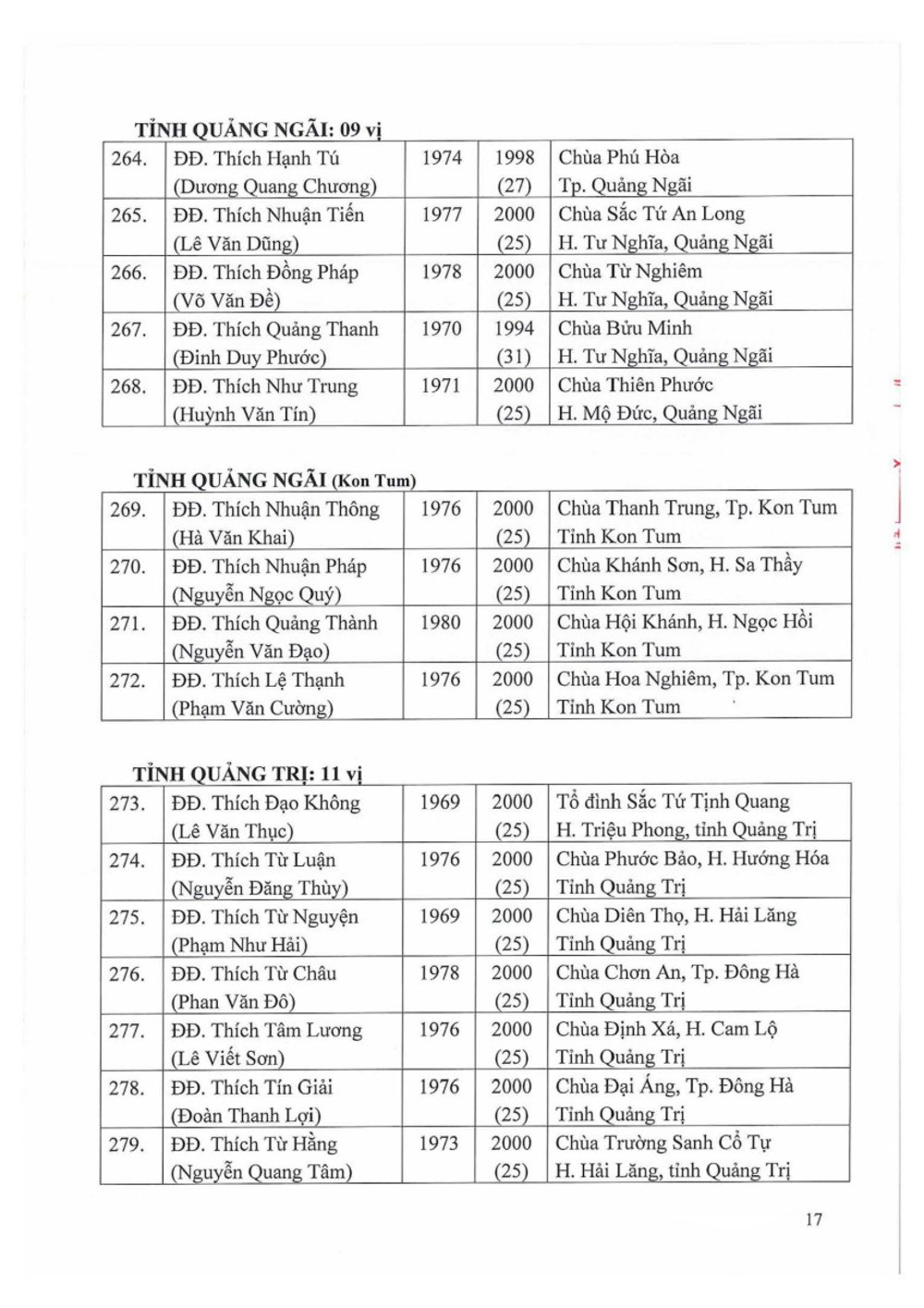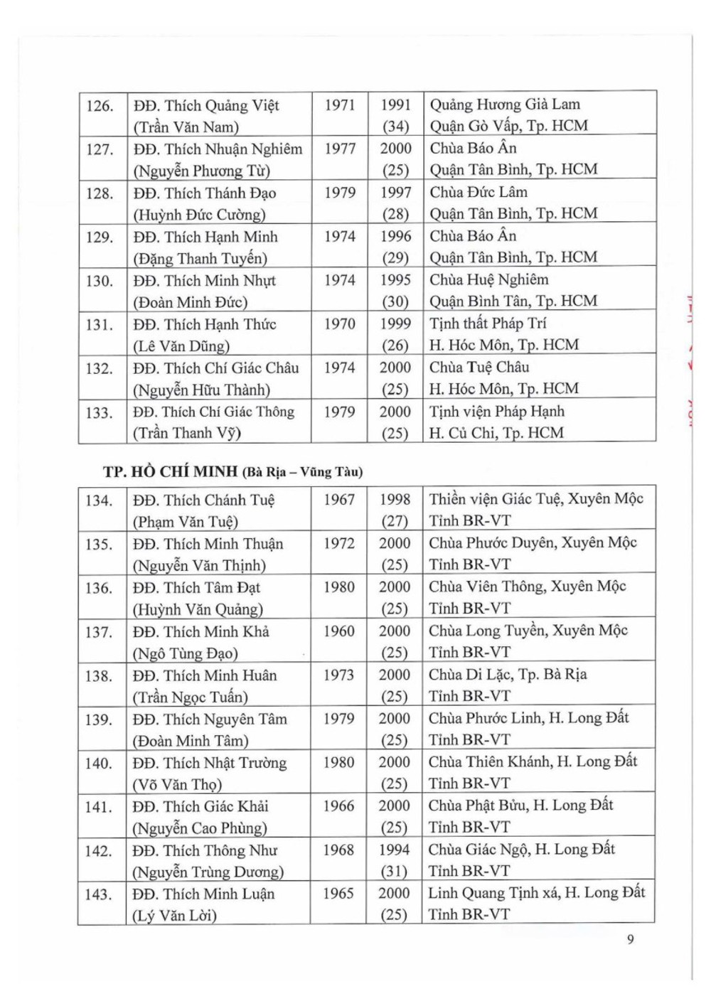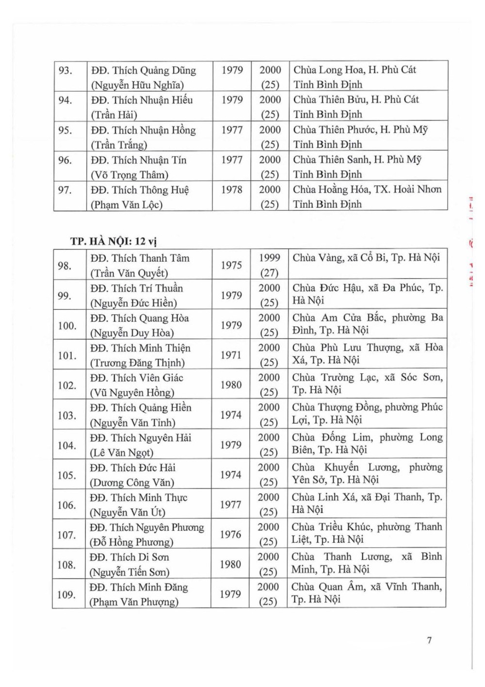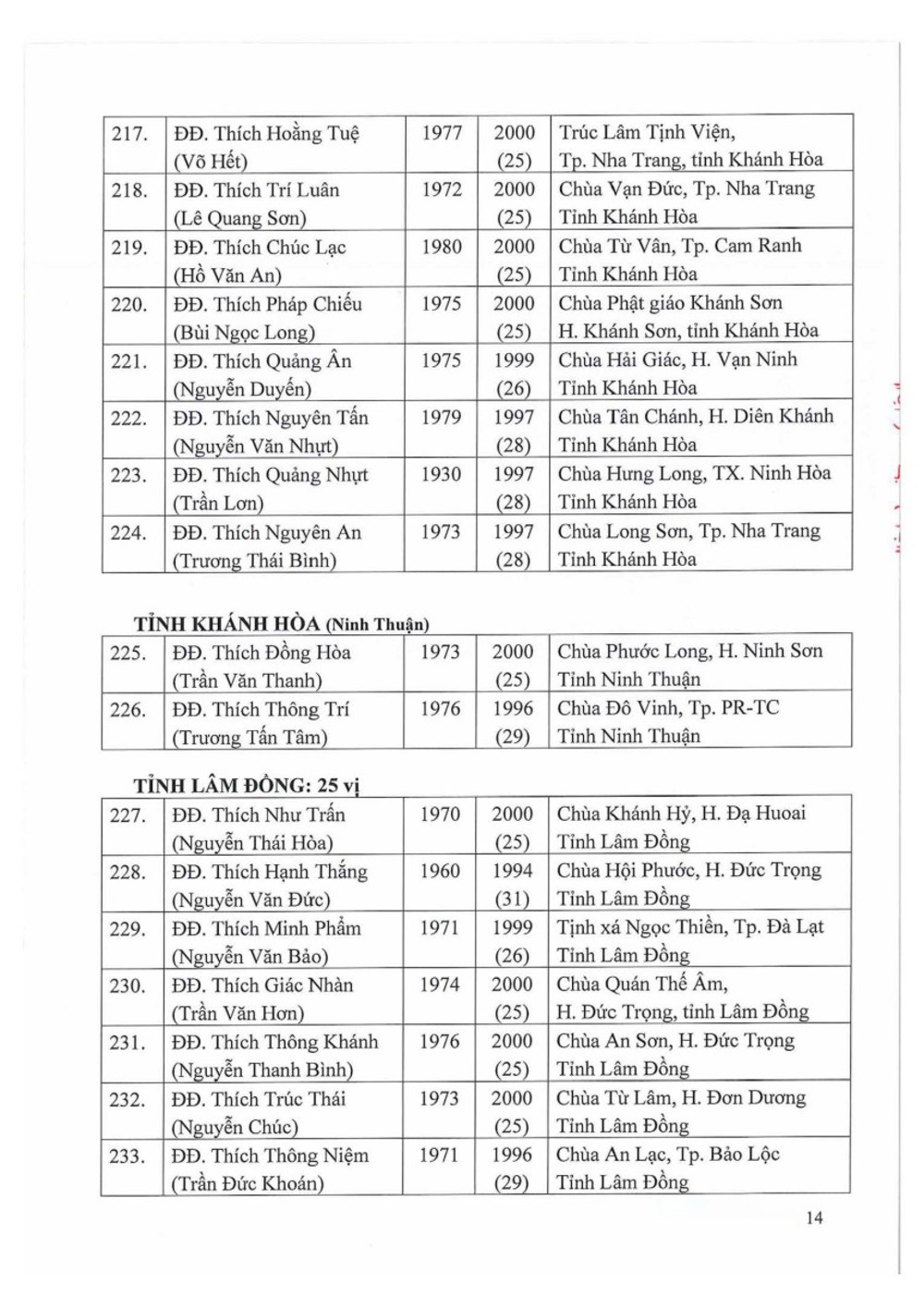 Danh sách tấn phong giáo phẩm Thượng tọa năm 2025 gồm 303 vị. Cụ thể: tỉnh An Giang có 4 vị, tỉnh Bắc Ninh 2 vị, tỉnh Cà Mau 8 vị, TP.Cần Thơ 11 vị, TP. Đà Nẵng 32 vị, tỉnh Đắk lắk 6 vị, tỉnh Đồng Nai 14 vị, tỉnh Đồng Tháp 8 vị, tỉnh Gia Lai 12 vị, TP. Hà Nội 12 vị, tỉnh Hà Tĩnh 1 vị, TP. Hải Phòng 3 vị, TP.HCM 51 vị, TP.Huế 45 vị, tỉnh Hưng Yên 6 vị, tỉnh Khánh Hòa 11 vị, tỉnh Lâm Đồng 25 vị, tỉnh Ninh Bình 8 vị, tỉnh Phú Thọ 2 vị, tỉnh Quảng Ninh 2 vị, tỉnh Quảng Ngãi 9 vị, tỉnh Quảng Trị 11 vị, tỉnh Tây Ninh 4 vị, tỉnh Thái Nguyên 4 vị, tỉnh Vĩnh Long 12 vị.