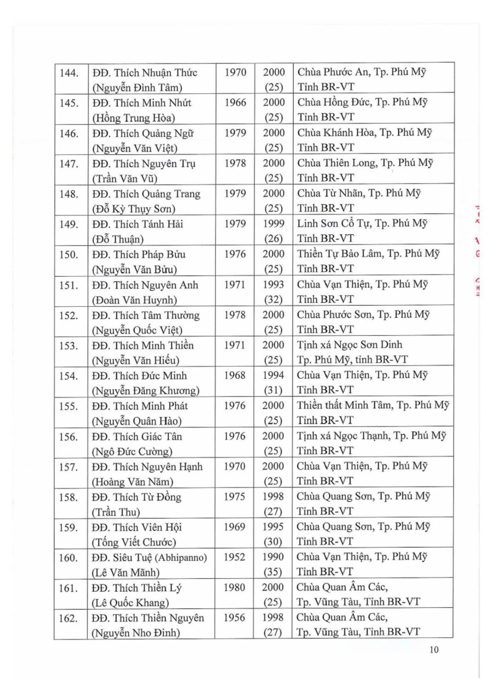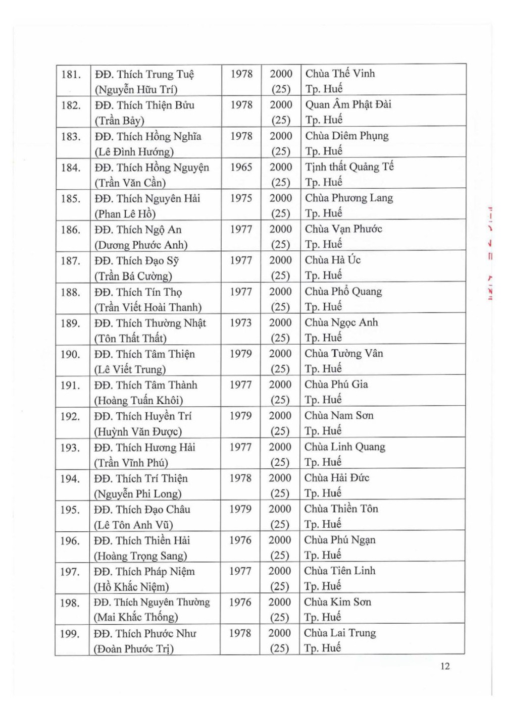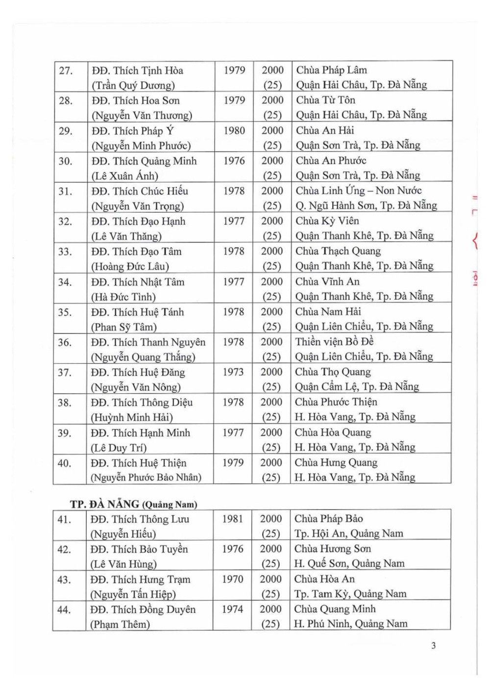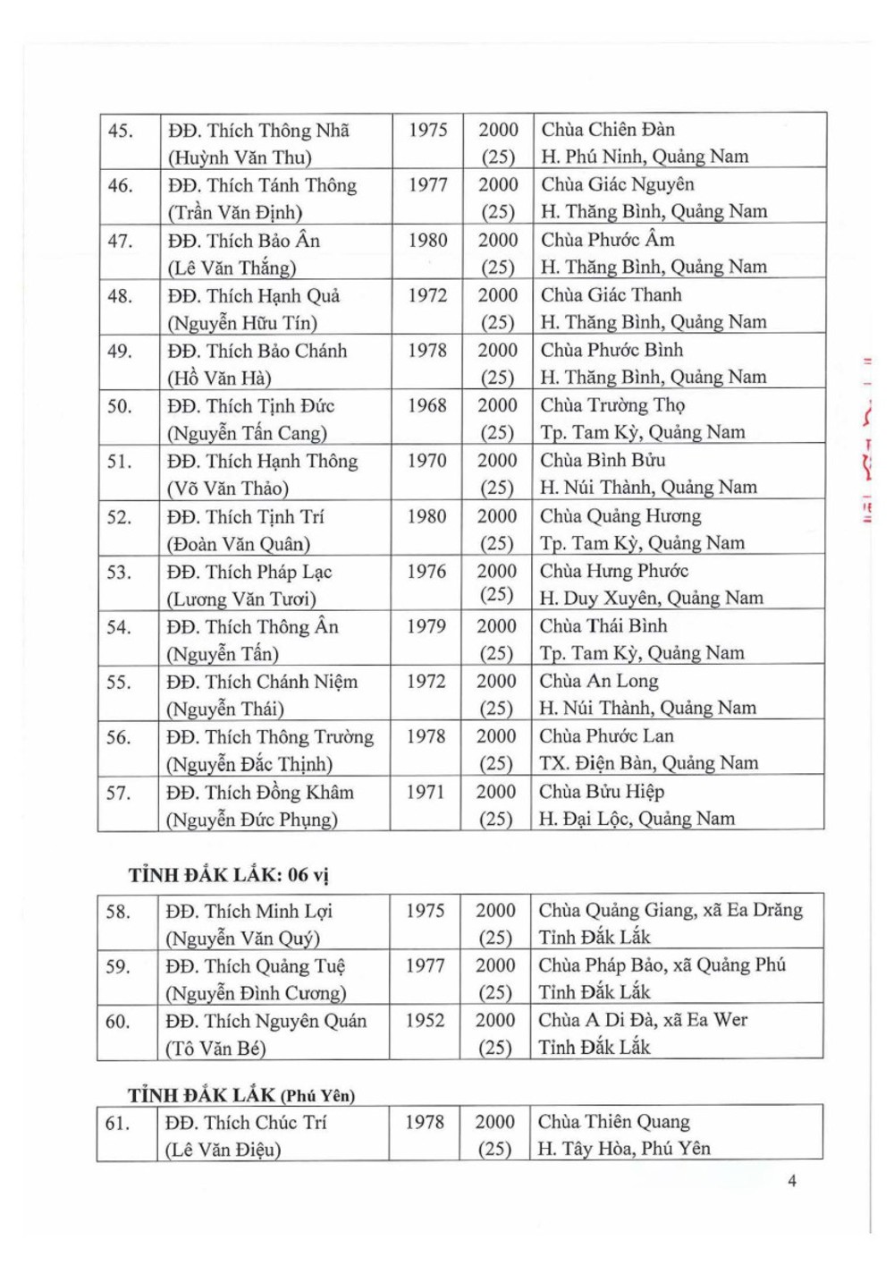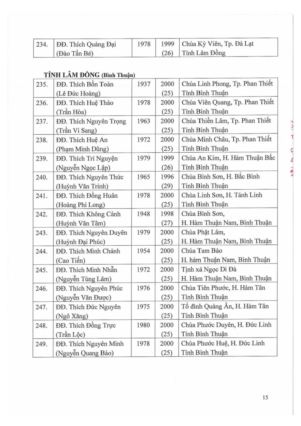 Danh sách tấn phong giáo phẩm Thượng tọa năm 2025 gồm 303 vị. Cụ thể: tỉnh An Giang có 4 vị, tỉnh Bắc Ninh 2 vị, tỉnh Cà Mau 8 vị, TP.Cần Thơ 11 vị, TP. Đà Nẵng 32 vị, tỉnh Đắk lắk 6 vị, tỉnh Đồng Nai 14 vị, tỉnh Đồng Tháp 8 vị, tỉnh Gia Lai 12 vị, TP. Hà Nội 12 vị, tỉnh Hà Tĩnh 1 vị, TP. Hải Phòng 3 vị, TP.HCM 51 vị, TP.Huế 45 vị, tỉnh Hưng Yên 6 vị, tỉnh Khánh Hòa 11 vị, tỉnh Lâm Đồng 25 vị, tỉnh Ninh Bình 8 vị, tỉnh Phú Thọ 2 vị, tỉnh Quảng Ninh 2 vị, tỉnh Quảng Ngãi 9 vị, tỉnh Quảng Trị 11 vị, tỉnh Tây Ninh 4 vị, tỉnh Thái Nguyên 4 vị, tỉnh Vĩnh Long 12 vị.