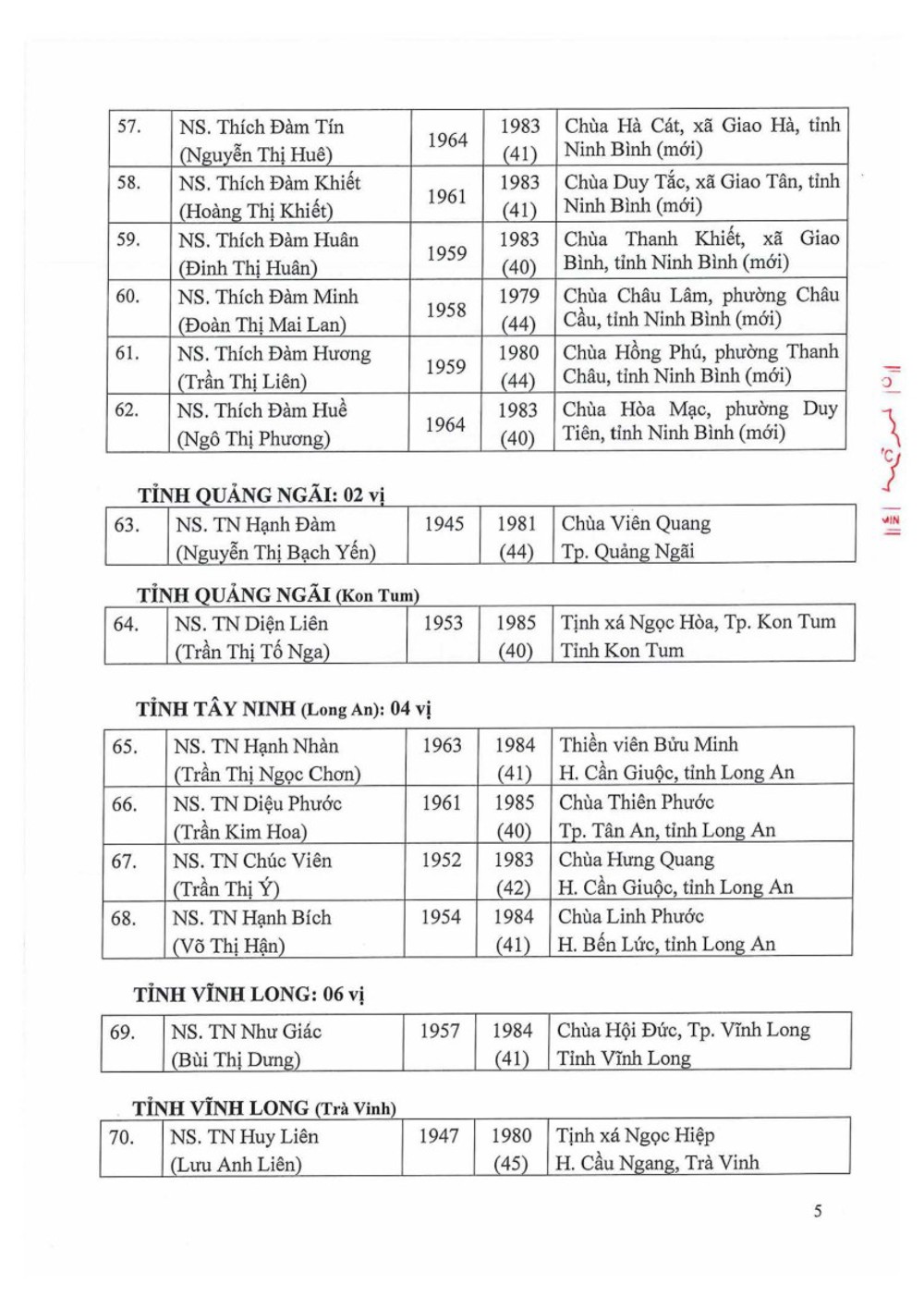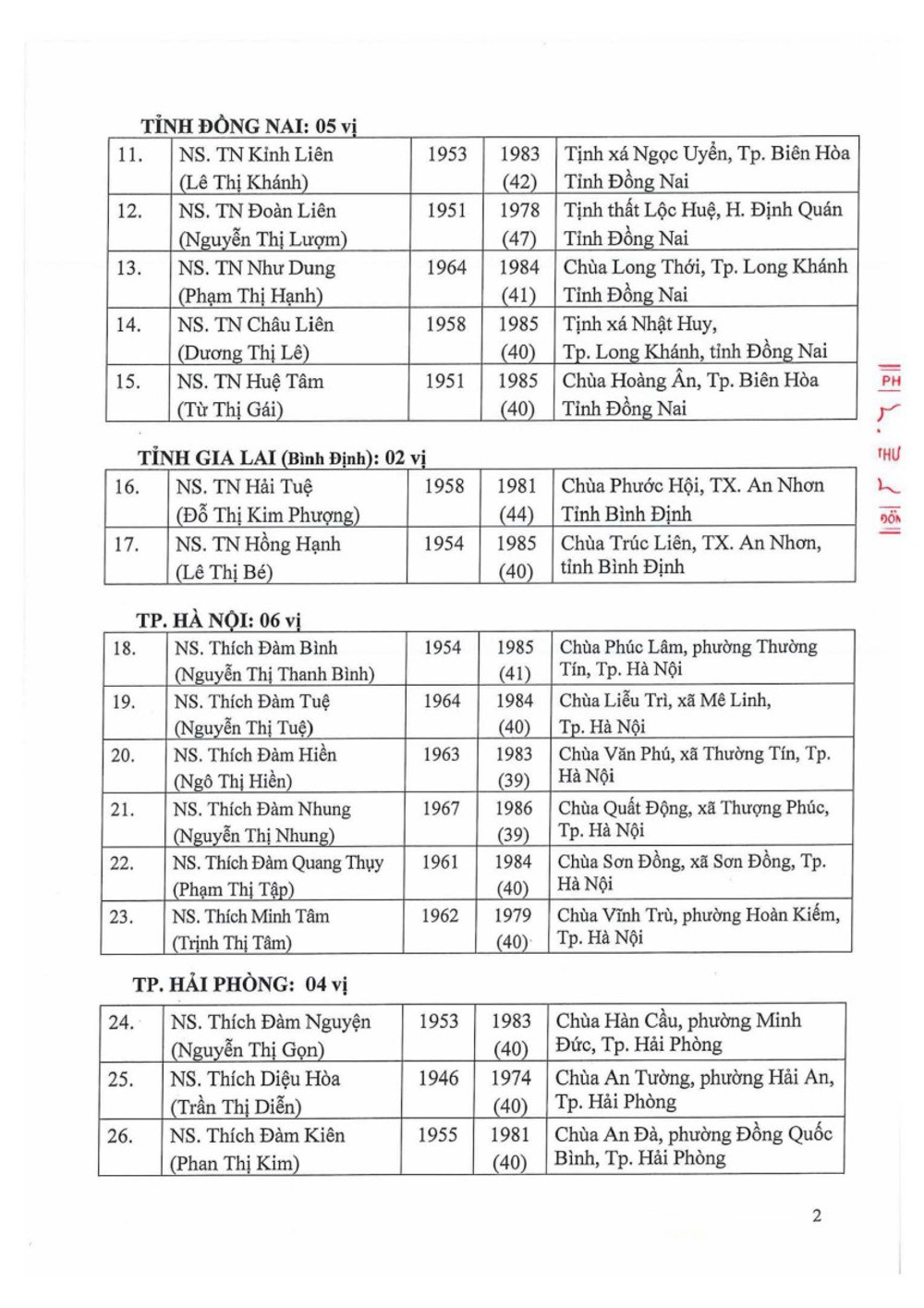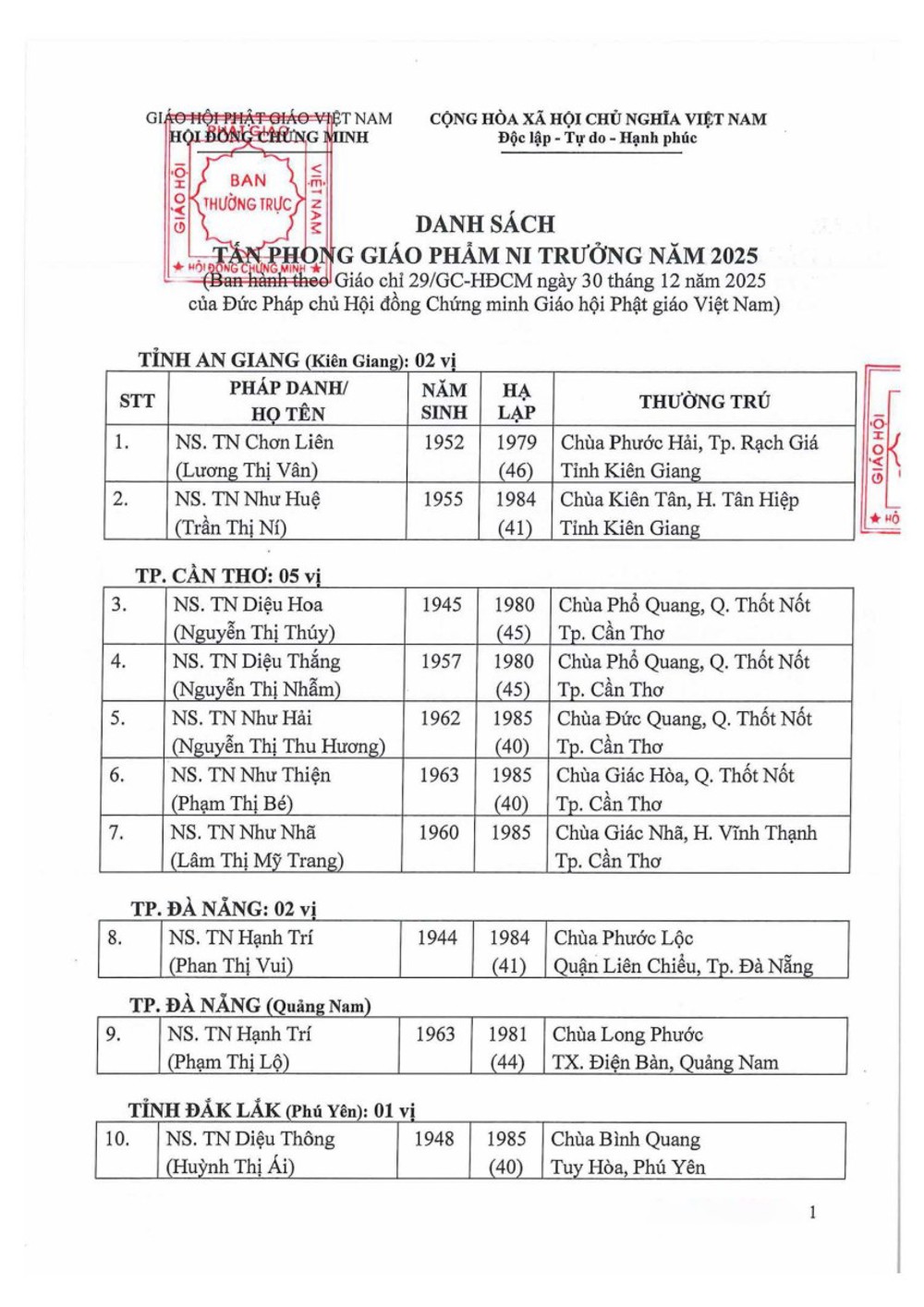 Danh sách tấn phong giáo phẩm Ni trưởng năm 2025 như sau: tỉnh An Giang có 2 vị, TP.Cần Thơ 5 vị, TP.Đà Nẵng 2 vị, tỉnh Đắk Lắk 1 vị, tỉnh Đồng Nai 5 vị, tỉnh Gia Lai 2 vị, TP.Hà Nội 6 vị, TP.Hải Phòng 4 vị, TP.HCM 20 vị, TP.Huế 1 vị, tỉnh Khánh Hòa 2 vị, tỉnh Lâm Đồng 2 vị, tỉnh Ninh Bình 10 vị, tỉnh Quảng Ngãi 2 vị, tỉnh Tây Ninh 4 vị, tỉnh Vĩnh Long 6 vị.
