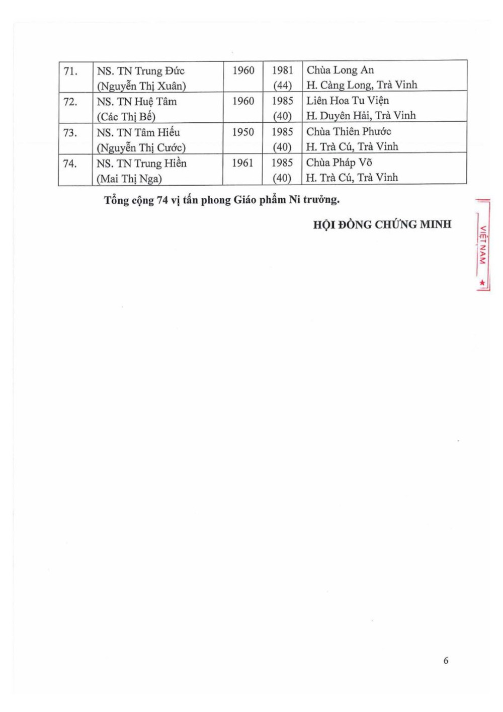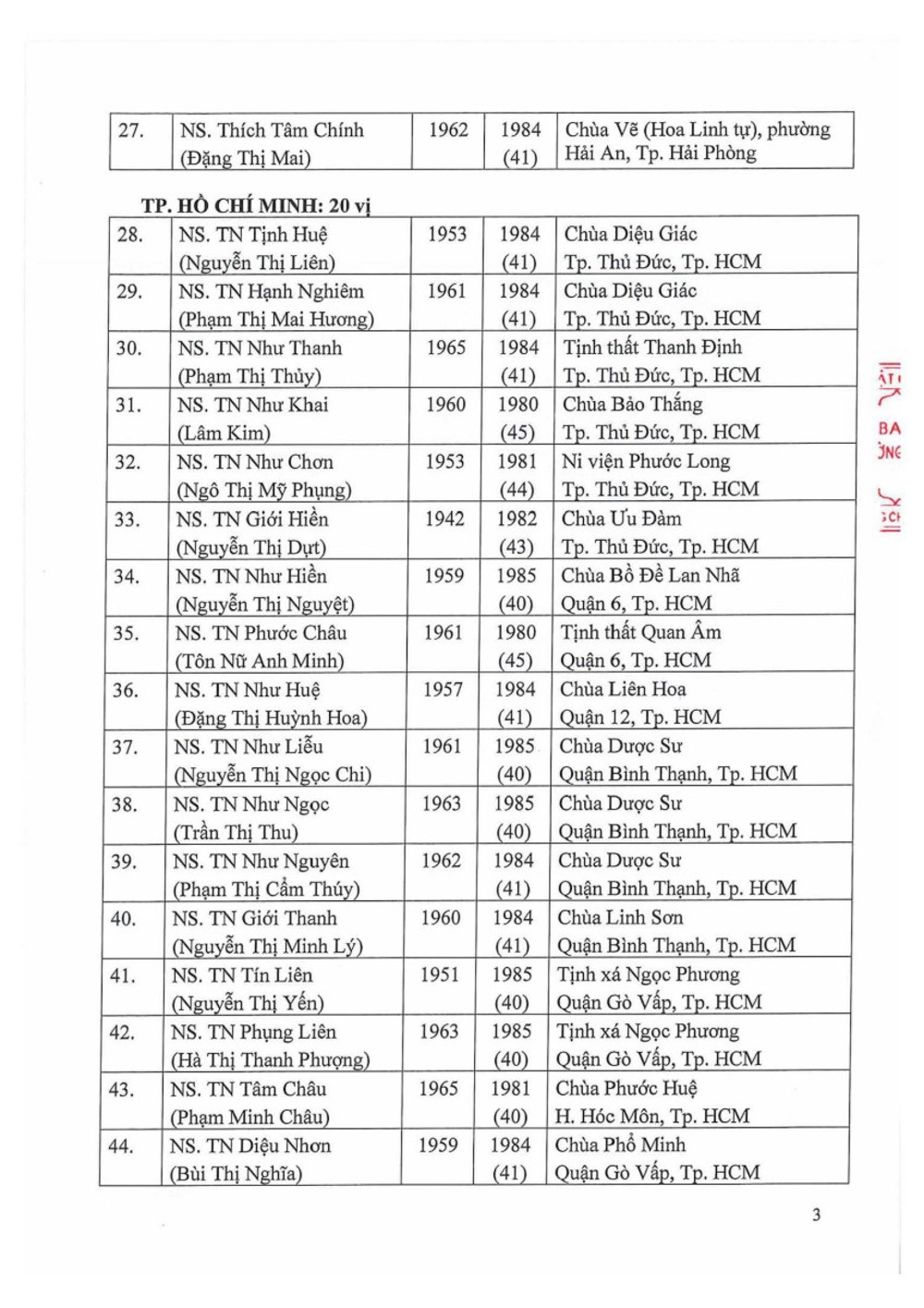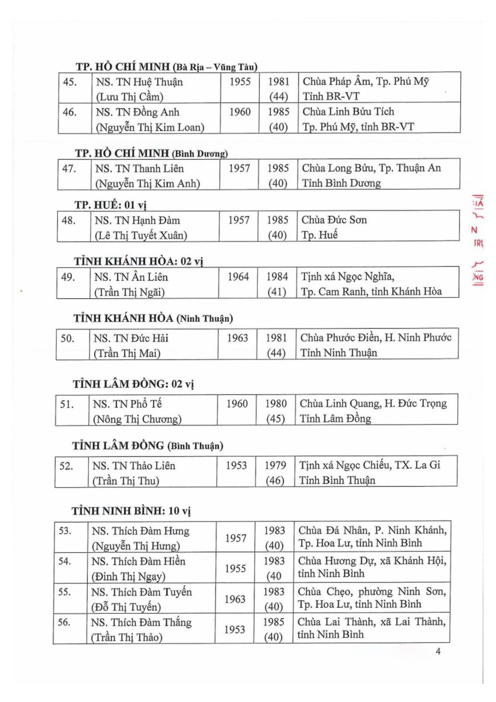 Danh sách tấn phong giáo phẩm Ni trưởng năm 2025 như sau: tỉnh An Giang có 2 vị, TP.Cần Thơ 5 vị, TP.Đà Nẵng 2 vị, tỉnh Đắk Lắk 1 vị, tỉnh Đồng Nai 5 vị, tỉnh Gia Lai 2 vị, TP.Hà Nội 6 vị, TP.Hải Phòng 4 vị, TP.HCM 20 vị, TP.Huế 1 vị, tỉnh Khánh Hòa 2 vị, tỉnh Lâm Đồng 2 vị, tỉnh Ninh Bình 10 vị, tỉnh Quảng Ngãi 2 vị, tỉnh Tây Ninh 4 vị, tỉnh Vĩnh Long 6 vị.