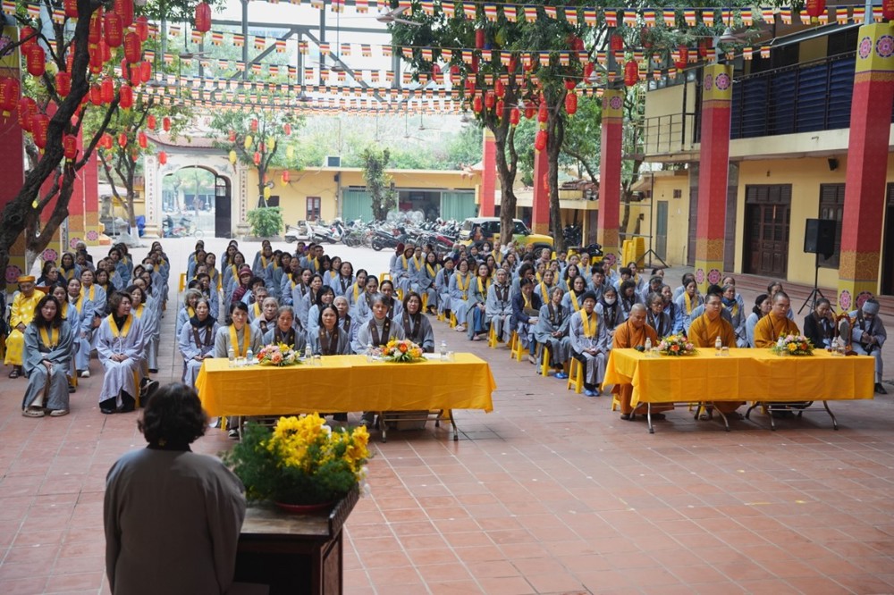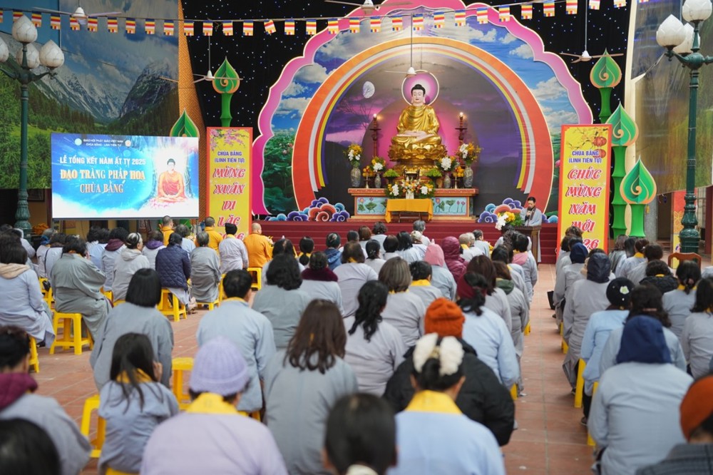 Báo cáo hoạt động Phật sự năm 2025, Phật tử Hoa Đức Hà – Chúng trưởng Đạo tràng Pháp Hoa chùa Bằng cho biết, Đạo tràng hiện có 700 Phật tử đang sinh hoạt; với 240 Phật tử Y vàng, 217 Phật tử Y nâu và 148 Phật tử y mở. Năm qua, Đạo tràng hân hoan chào đón gần 86 đạo hữu mới thọ Y. Tuổi trung bình của toàn Đạo tràng hiện nay là 65 tuổi, trong đó có 17 Phật tử từ 90 tuổi trở lên – Các vị chính là tấm gương sống động về lòng tinh tiến cho lớp trẻ noi theo. Trong năm 2025, Đạo tràng phát tâm cúng dường Tam bảo hơn 2,2 tỷ đồng và từ thiện hơn 450 triệu đồng. Các tổ, ban trực thuộc Đạo tràng trong năm qua đều đã cống hiến hết mình, đoàn kết hoạt động. Về hoằng pháp, với tinh thần “Phụng sự chúng sinh là thiết thực cúng dàng chư Phật”, Đạo tràng đã tổ chức nhiều chương trình cúng dàng các trường hạ, thực hiện nhiều Phật sự ý nghĩa nhân ngày Đức Phật đản sinh như diễu hành xe đạp, đặc biệt là cúng dàng xe hoa lên Đức Từ Phụ nhân sự kiện cung rước xá lợi Phật. Riêng về từ thiện, đạo tràng Pháp Hoa chùa Bằng đã mang hơi ấm đến trẻ em Viện huyết học truyền máu Trung ương, trao gửi yêu thương tới bà con vùng lũ tại tỉnh Lạng Sơn và thành phố Huế trong đợt lũ lụt,…