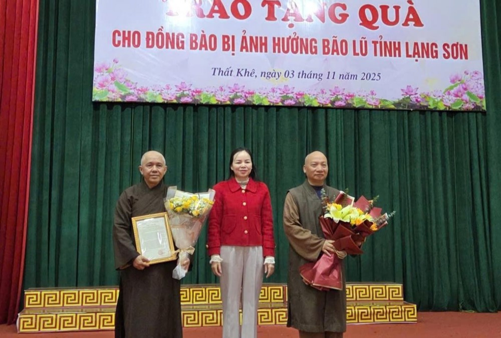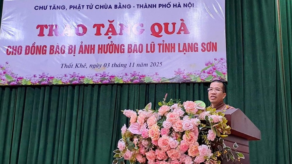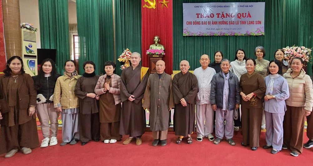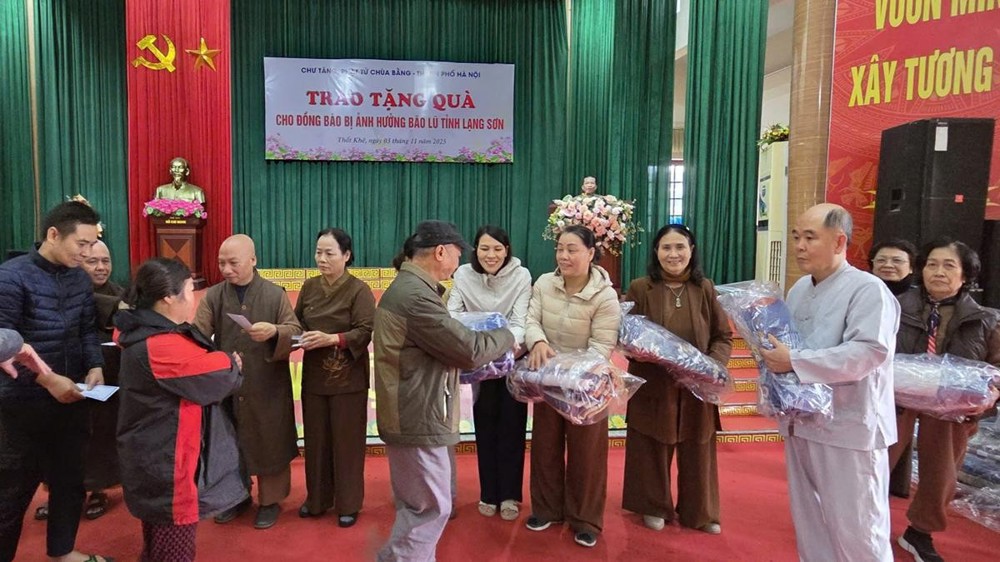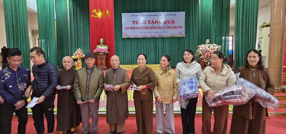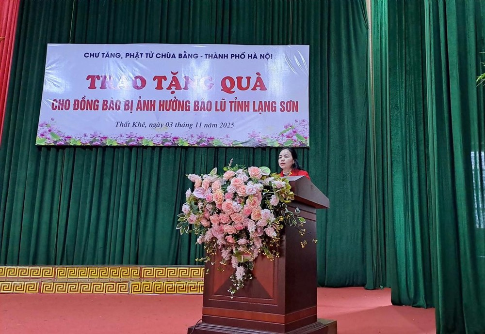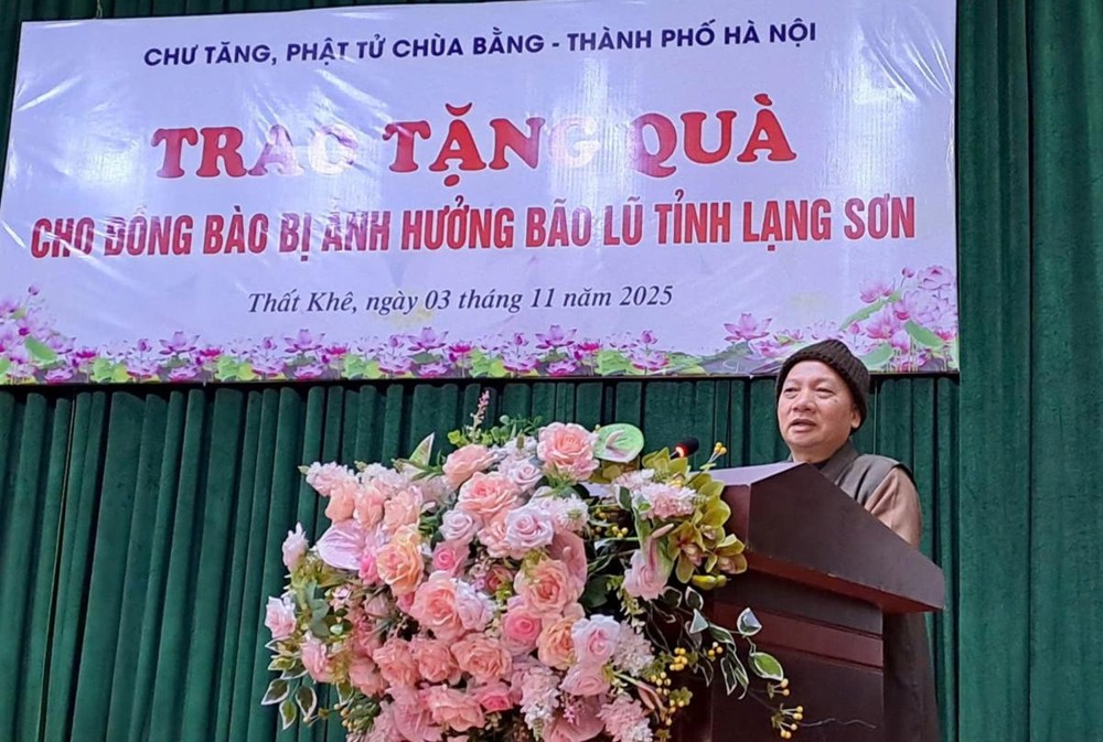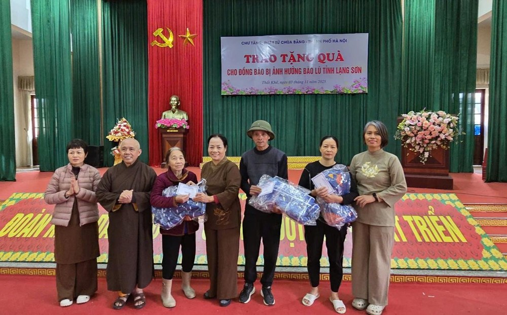 Vâng theo sự chỉ dạy của Hòa thượng Ân sư Thích Bảo Nghiêm - Phó chủ tịch HĐTS, Trưởng Ban Hoằng pháp TƯ GHPGVN, ngày 3/11, dưới sự hỗ trợ của BTS GHPGVN tỉnh Lạng Sơn, Thượng tọa Thích Chiếu Tuệ – Ủy viên HĐTS, Phó Trưởng Ban Thường trực Ban Hoằng pháp TW và Thượng tọa Thích Tâm Thuần – Phó Ban Hoằng pháp TW đã dẫn đoàn Phật tử Đạo tràng Pháp Hoa chùa Bằng tới trao tặng những phần quà ý nghĩa với tổng trị giá hơn 200 triệu đồng đến bà con vùng lũ xã Thất Khê nơi đây.