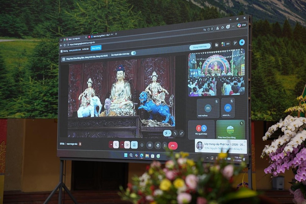 Trong không khí thanh tân của buổi sớm đầu xuân, Đạo tràng Pháp Hoa không chỉ hội tụ trong không gian chùa Bằng – Linh Tiên tự, mà còn lan tỏa đạo tình qua những nhịp cầu kết nối. Nhân ngày đầu năm mới, Đạo tràng đã tổ chức buổi sinh hoạt trực tuyến, kết nối qua Zoom với Đạo tràng Pháp Hoa tại các tỉnh, thành phía Bắc. Ở mỗi không gian khác nhau, nhưng chung một thời khắc, chung một niềm hướng về Tam Bảo, Phật tử gần xa đều được cùng nhau lễ Phật đầu năm, cùng nhau lắng lòng nghe pháp, mở đầu cho một năm mới tràn đầy hỷ lạc.