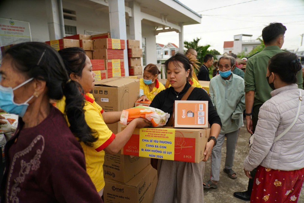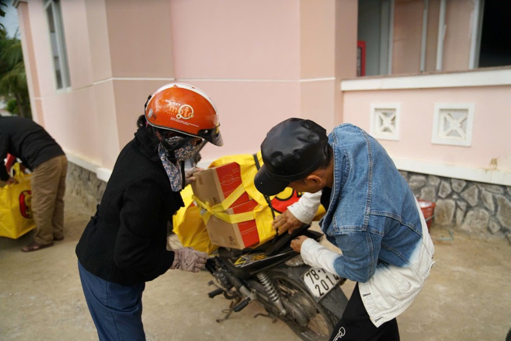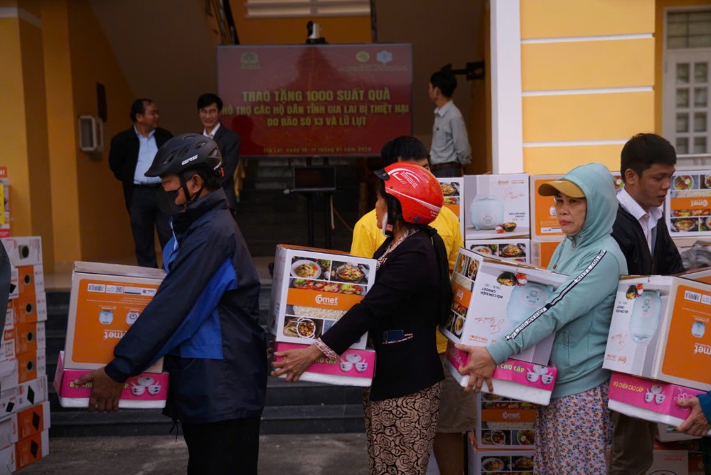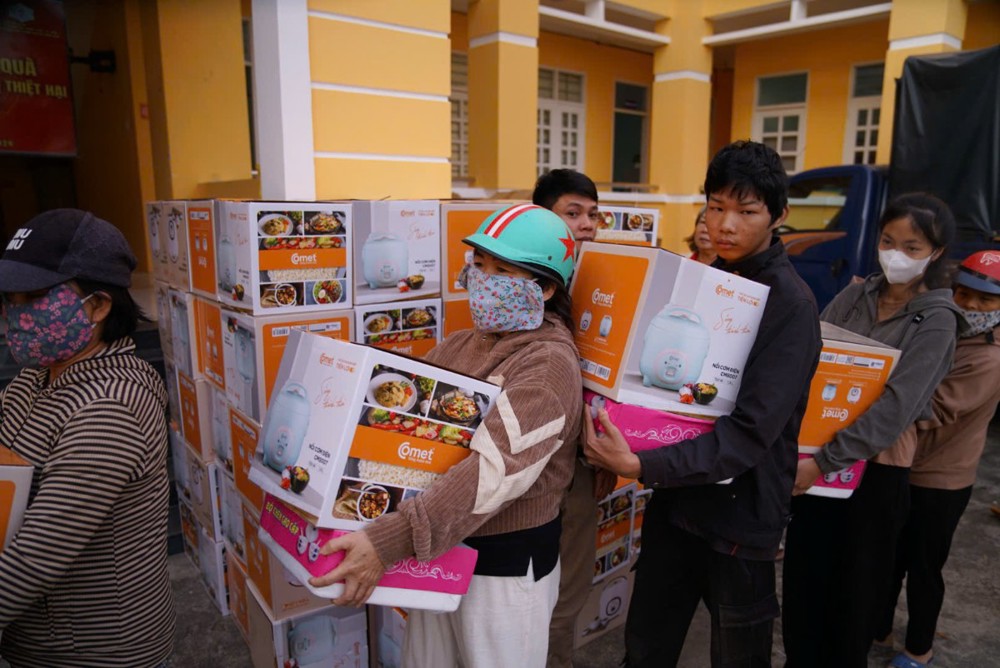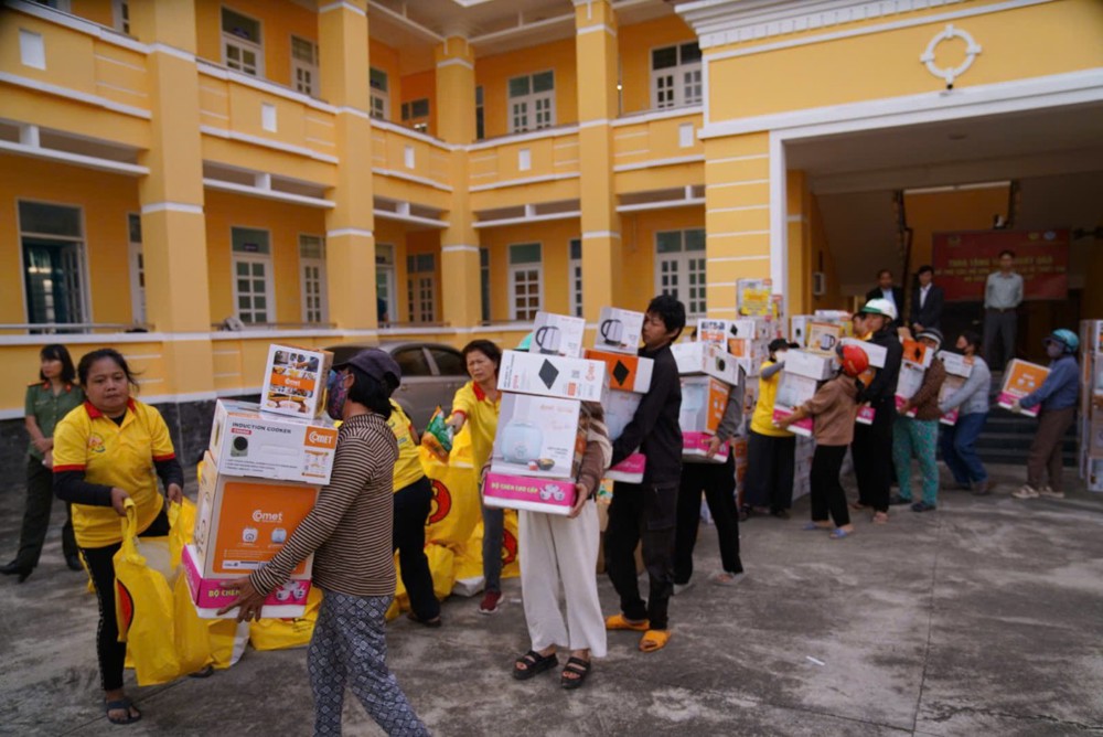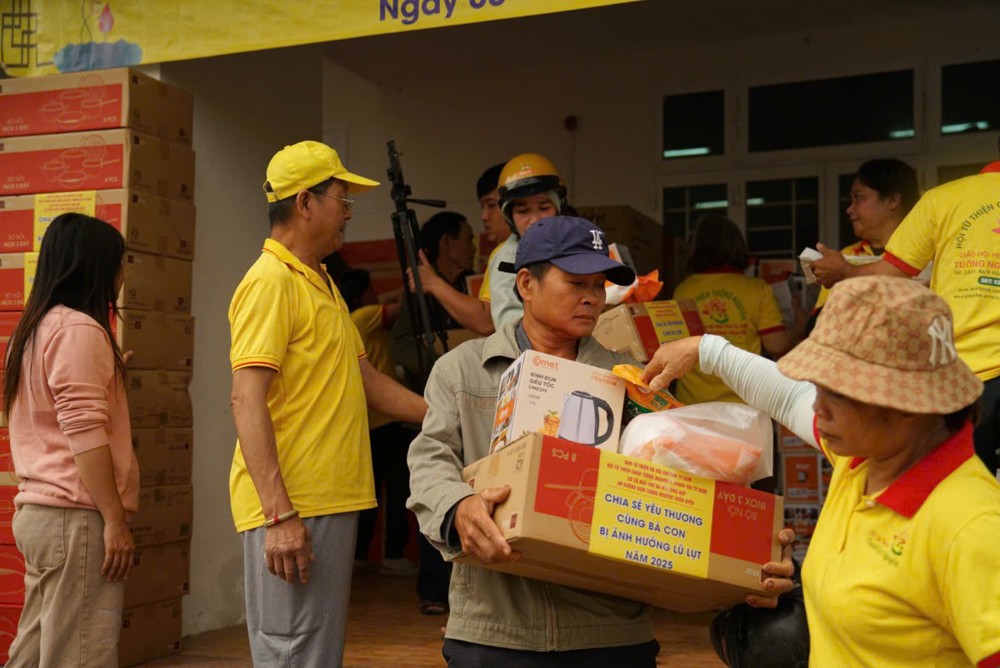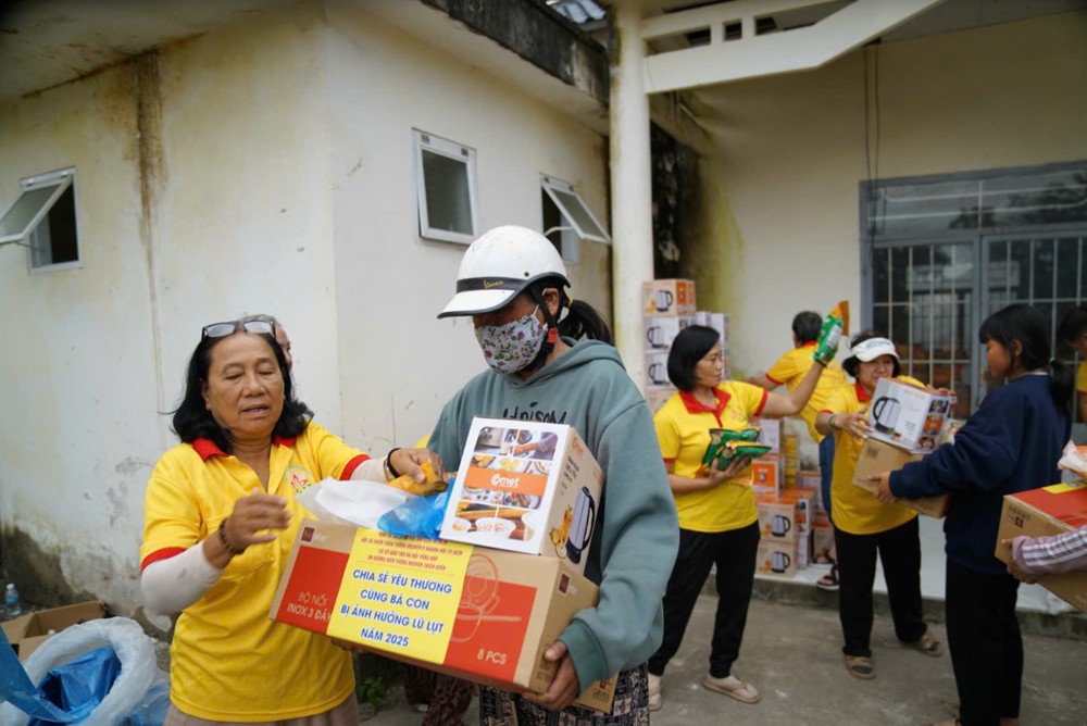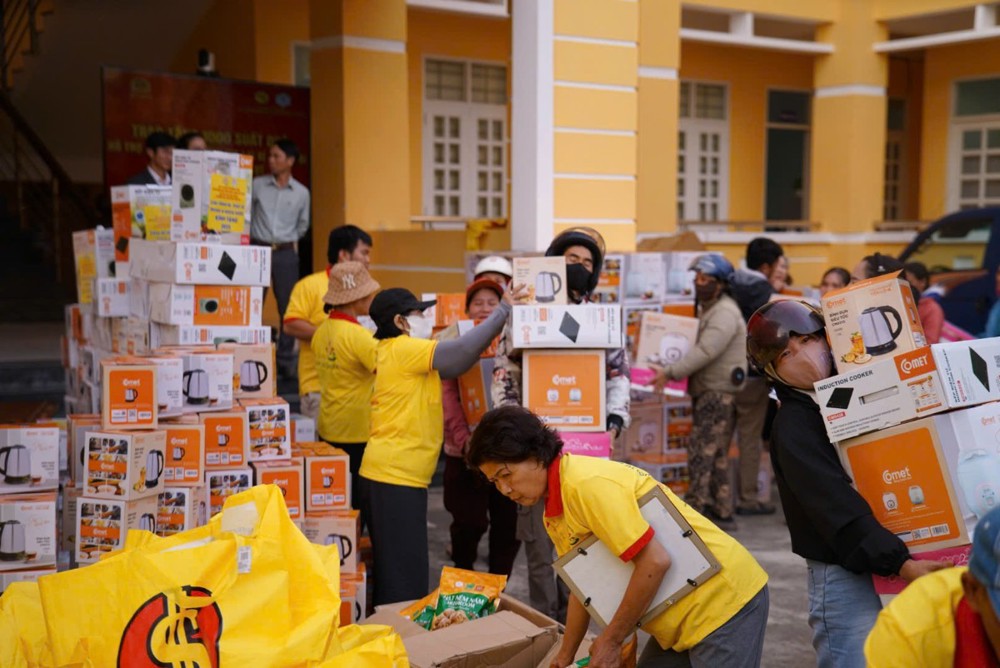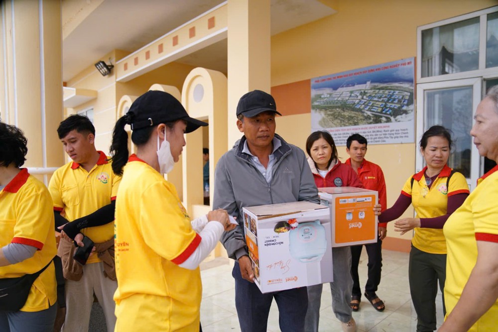 Mỗi phần quà trị giá 1.800.000 đồng, gồm bộ xoong nồi inox chất lượng cao, ấm siêu tốc, gạo, hạt nêm và các nhu yếu phẩm thiết yếu phục vụ sinh hoạt hằng ngày – những vật dụng đã bị cuốn trôi sau thiên tai. Tổng kinh phí chương trình tại Khánh Hòa là 902 triệu đồng.