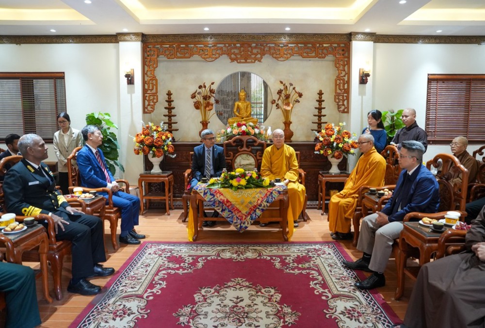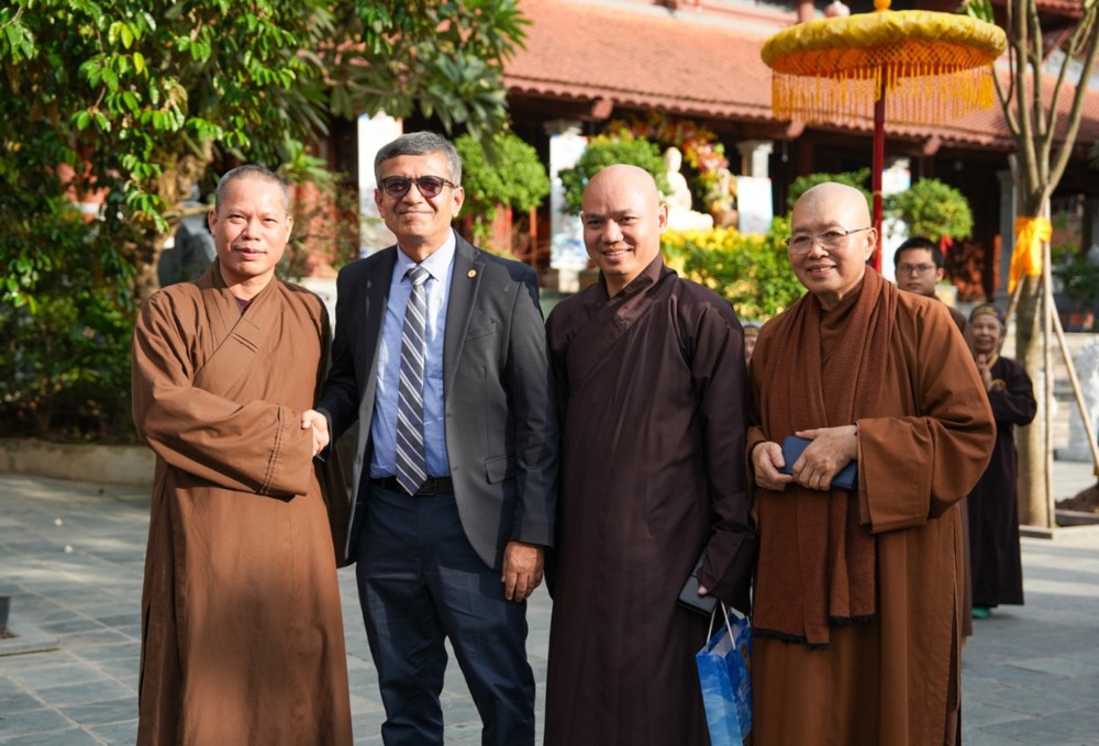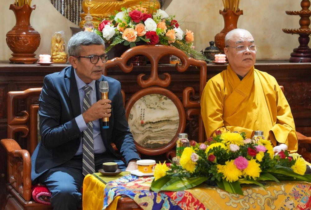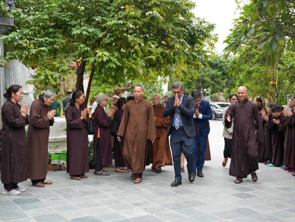 Tại đây, Trưởng lão Hòa thượng Thích Thanh Nhiễu - Ủy viên Thường trực Hội đồng Chứng minh, Phó Chủ tịch Thường trực Hội đồng Trị sự GHPGVN đã hoan hỷ chào mừng phái đoàn Bộ Quốc phòng Ấn Độ đến thăm chùa Pháp Vân. Hòa thượng nhấn mạnh, mối quan hệ hữu nghị giữa Phật giáo Việt Nam và Ấn Độ ngày càng được củng cố thông qua nhiều hoạt động giao lưu văn hóa, tâm linh và lễ hội quốc tế. Hàng năm, Việt Nam đều có các đoàn hành hương chiêm bái thánh tích tại Ấn Độ, trong khi các Đại sứ và quan chức Ấn Độ cũng thường xuyên đến thăm các tự viện Việt Nam. Hòa thượng tin tưởng rằng, chuyến thăm lần này sẽ góp phần thắt chặt tình hữu nghị giữa hai quốc gia nói chung và đạo Phật giáo nói riêng, cùng hướng đến hòa bình và an lạc cho nhân loại.