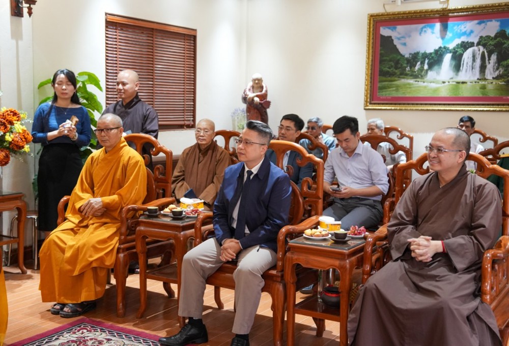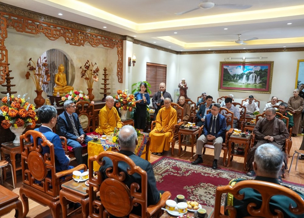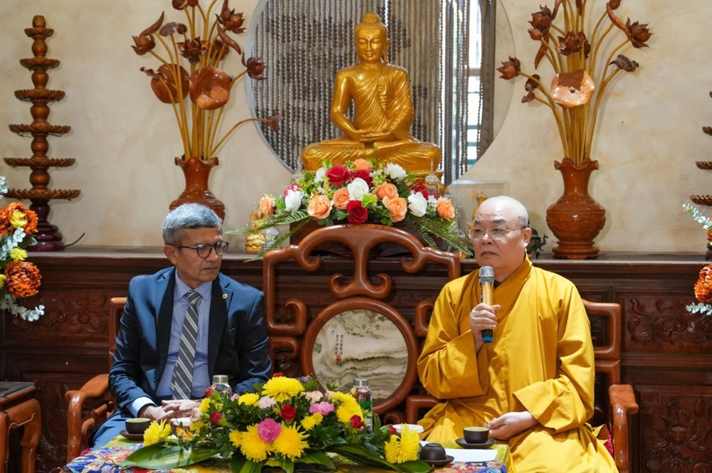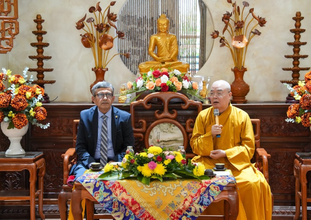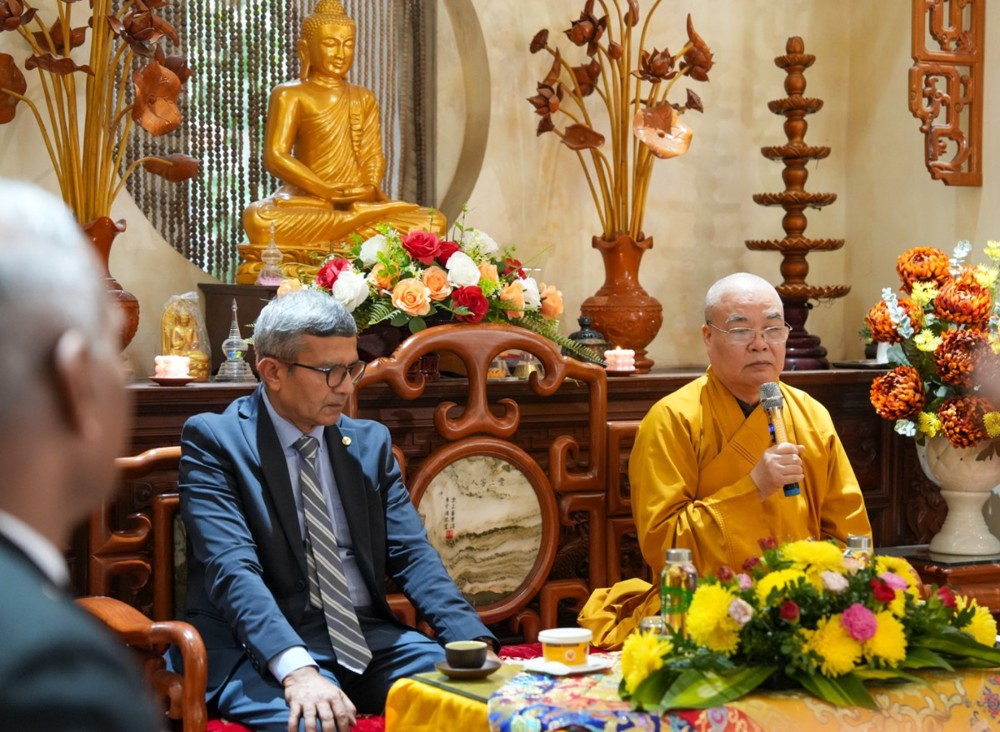 Tại đây, Trưởng lão Hòa thượng Thích Thanh Nhiễu - Ủy viên Thường trực Hội đồng Chứng minh, Phó Chủ tịch Thường trực Hội đồng Trị sự GHPGVN đã hoan hỷ chào mừng phái đoàn Bộ Quốc phòng Ấn Độ đến thăm chùa Pháp Vân. Hòa thượng nhấn mạnh, mối quan hệ hữu nghị giữa Phật giáo Việt Nam và Ấn Độ ngày càng được củng cố thông qua nhiều hoạt động giao lưu văn hóa, tâm linh và lễ hội quốc tế. Hàng năm, Việt Nam đều có các đoàn hành hương chiêm bái thánh tích tại Ấn Độ, trong khi các Đại sứ và quan chức Ấn Độ cũng thường xuyên đến thăm các tự viện Việt Nam. Hòa thượng tin tưởng rằng, chuyến thăm lần này sẽ góp phần thắt chặt tình hữu nghị giữa hai quốc gia nói chung và đạo Phật giáo nói riêng, cùng hướng đến hòa bình và an lạc cho nhân loại.
