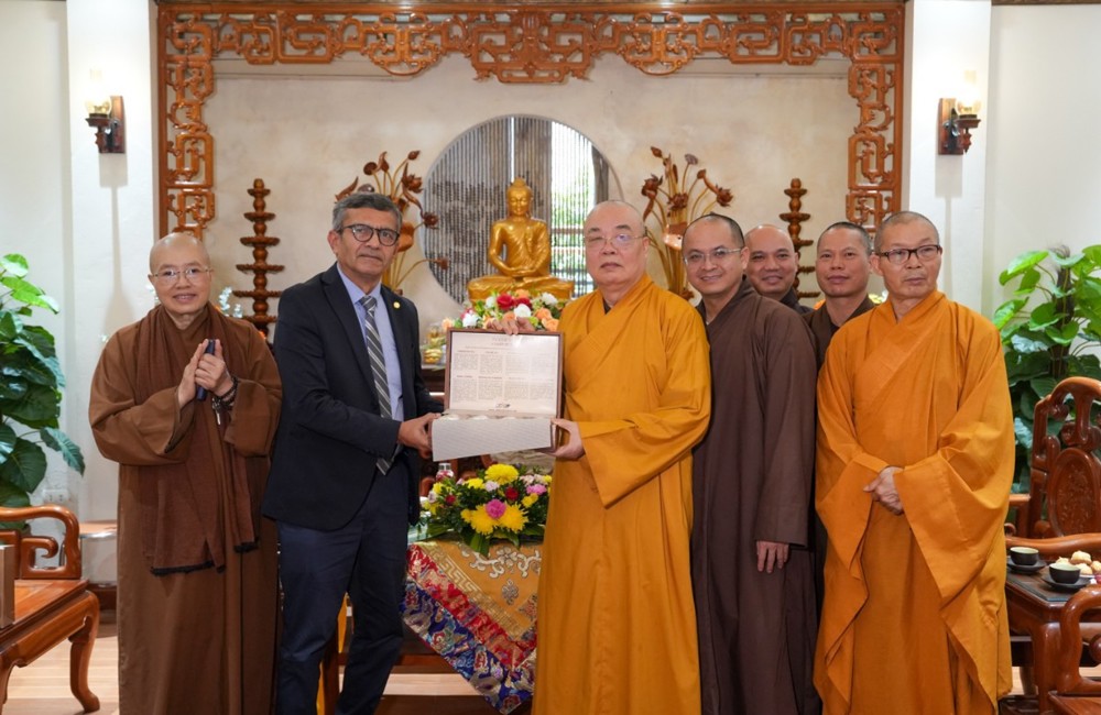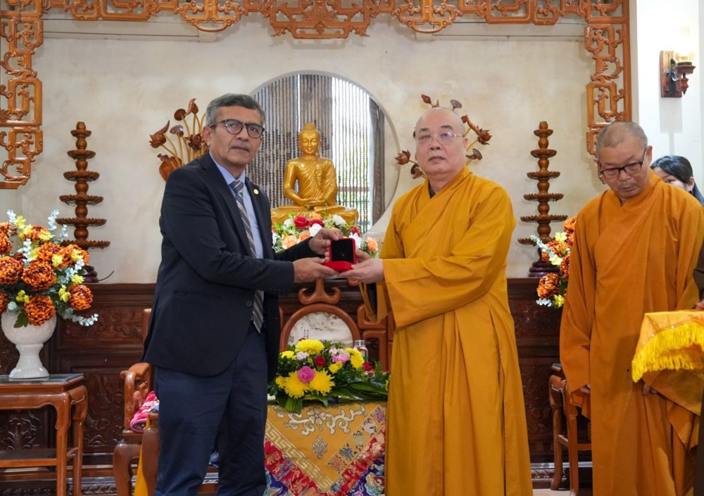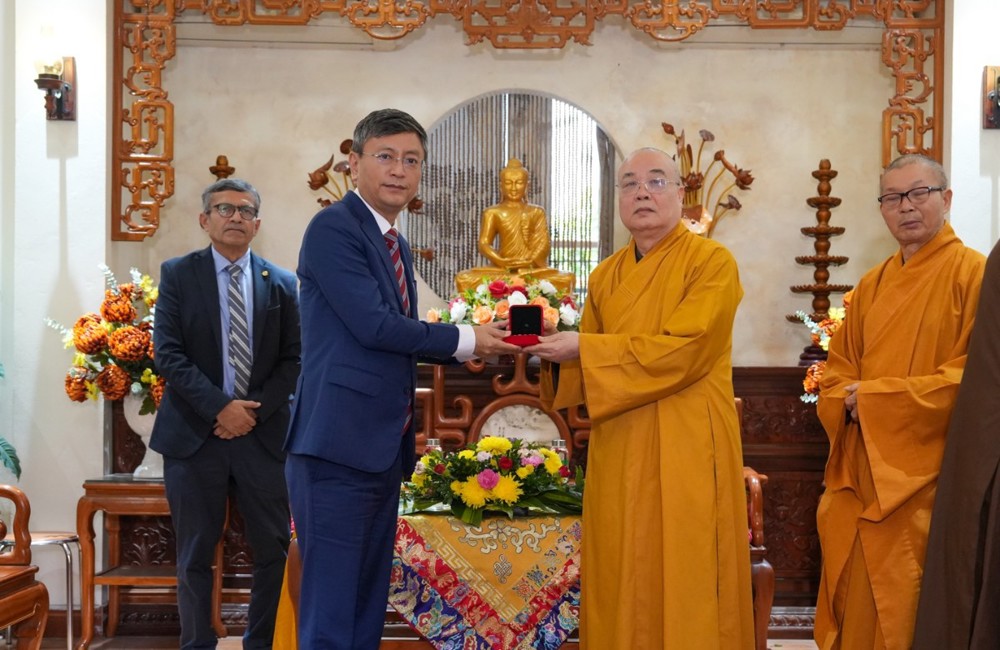 Nhân dịp này, Trưởng lão Hòa thượng Thích Thanh Nhiễu cùng Hòa thượng Thích Nguyên Hạnh đã thay mặt GHPGVN trân trọng trao phần quà lưu niệm đặc biệt tới ngài Rajesh Kumar Singh - Thư ký Quốc phòng Ấn Độ và ngài Tshering W. Sherpa - Đại sứ Ấn Độ mới được bổ nhiệm. Trong không khí trang trọng, thấm đượm tình hữu nghị, đoàn cấp cao Bộ Quốc phòng Ấn Độ đã gửi tặng món quà lưu niệm tới chư Tôn đức lãnh đạo GHPGVN.