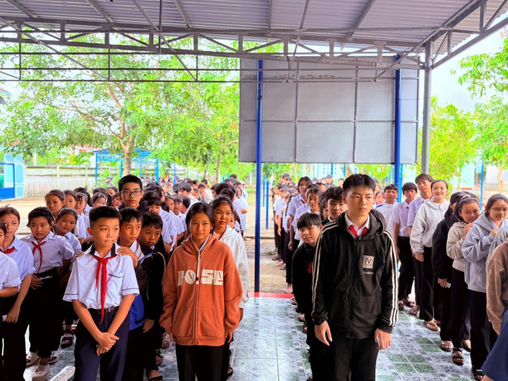 Đến 15 giờ cùng ngày, đoàn tiếp tục hướng đến Trường THCS Phạm Văn Đồng, xã Hòa Mỹ, tỉnh Đắk Lắk (Phú Yên cũ) và trao tặng 200 suất quà cho các em học sinh có hoàn cảnh gia đình bị thiệt hại do lũ lụt. Mỗi suất quà trị giá 450.000 đồng, bao gồm: lì xì 200.000 đồng, ba lô, áo khoác ấm và bánh, sữa… Đoàn cũng ủng hộ quỹ khuyến học của nhà trường 5.000.000 đồng.
