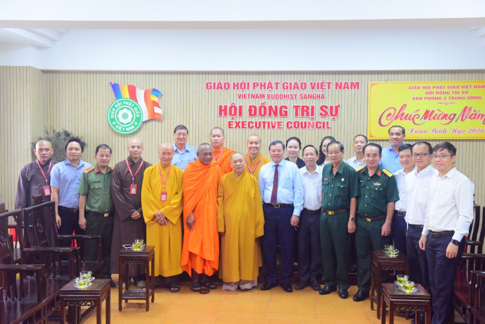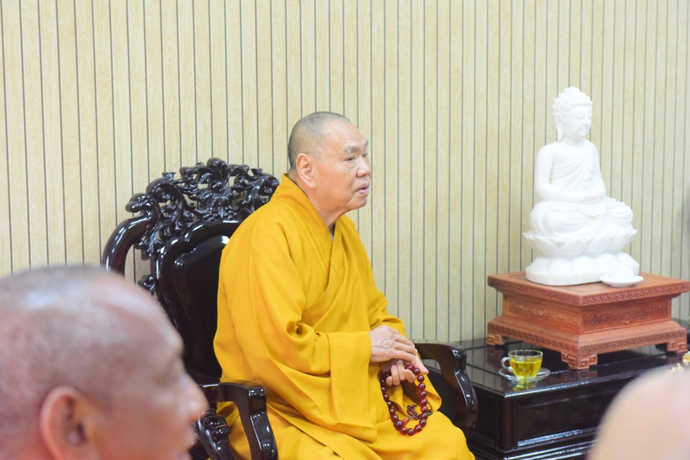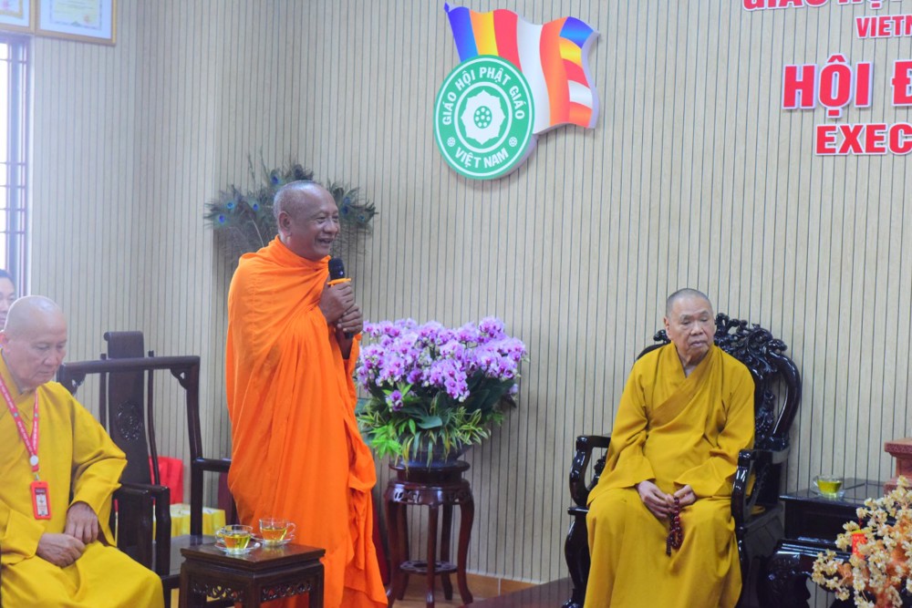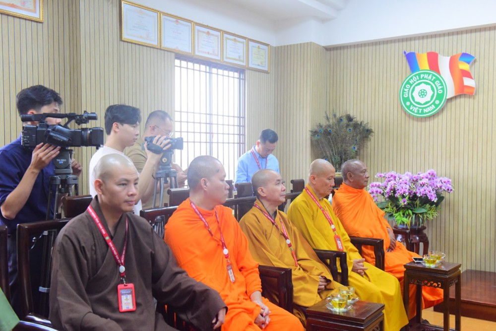 Tiếp thân mật đoàn có Trưởng lão HT. Thích Thiện Pháp - Uỷ viên Thường trực HĐCM, Phó Chủ tịch Thường trực HĐTS; HT. Danh Lung - Uỷ viên Thư ký HĐTS, Phó Trưởng Ban Văn hoá T.Ư; chư tôn đức Văn phòng 2 Trung ương: TT. Thích Phước Nghiêm; TT. Thích Đạo Phước; ĐĐ. Thích Minh Ân; ĐĐ. Châu Hoài Thái.