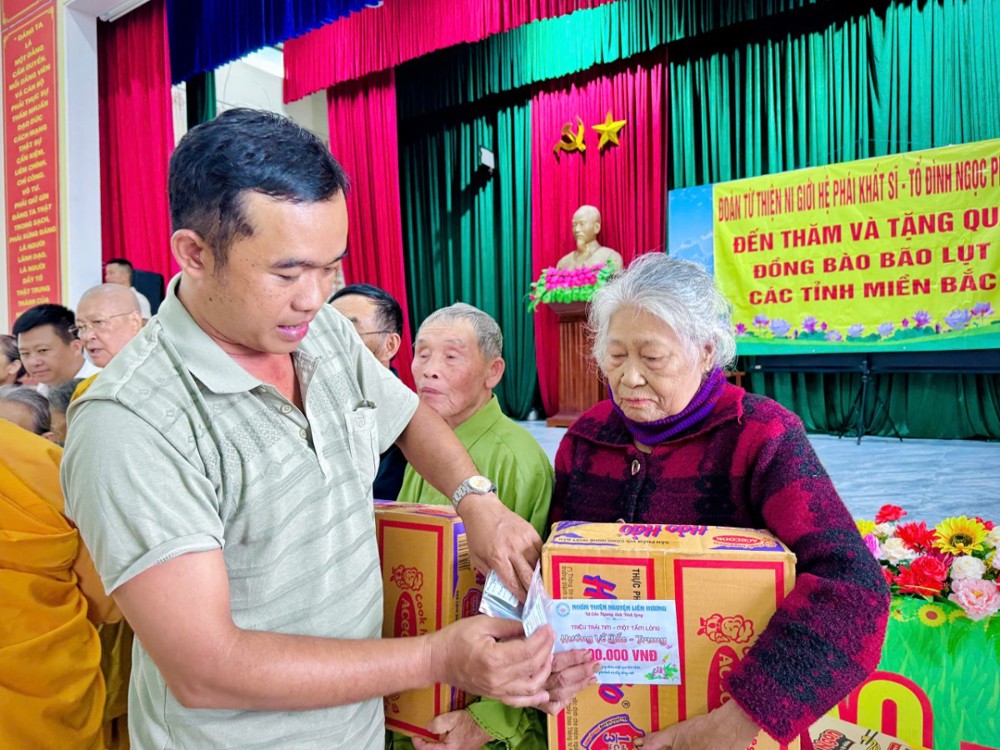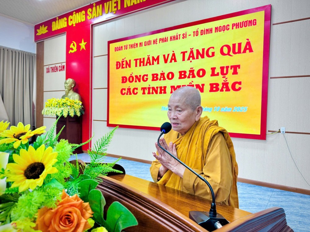 “Nhìn thấy đồng bào chịu nhiều thiệt hại sau cơn lũ, chúng tôi vô cùng cảm thông. Với tinh thần từ bi của người con Phật, đoàn Ni giới Hệ phái Khất sĩ xin gửi chút tấm lòng nhỏ, cầu mong đồng bào sớm ổn định cuộc sống, thân tâm an lạc. Đồng thời, đoàn xin tri ân công đức của quý Ni trưởng, Ni sư, Sư cô các miền tịnh xá, cùng chư Phật tử gần xa đã phát tâm cúng dường, đóng góp tịnh tài, tịnh vật cho chuyến đi – thể hiện tinh thần ‘lá lành đùm lá rách’, ‘một miếng khi đói bằng một gói khi no.”