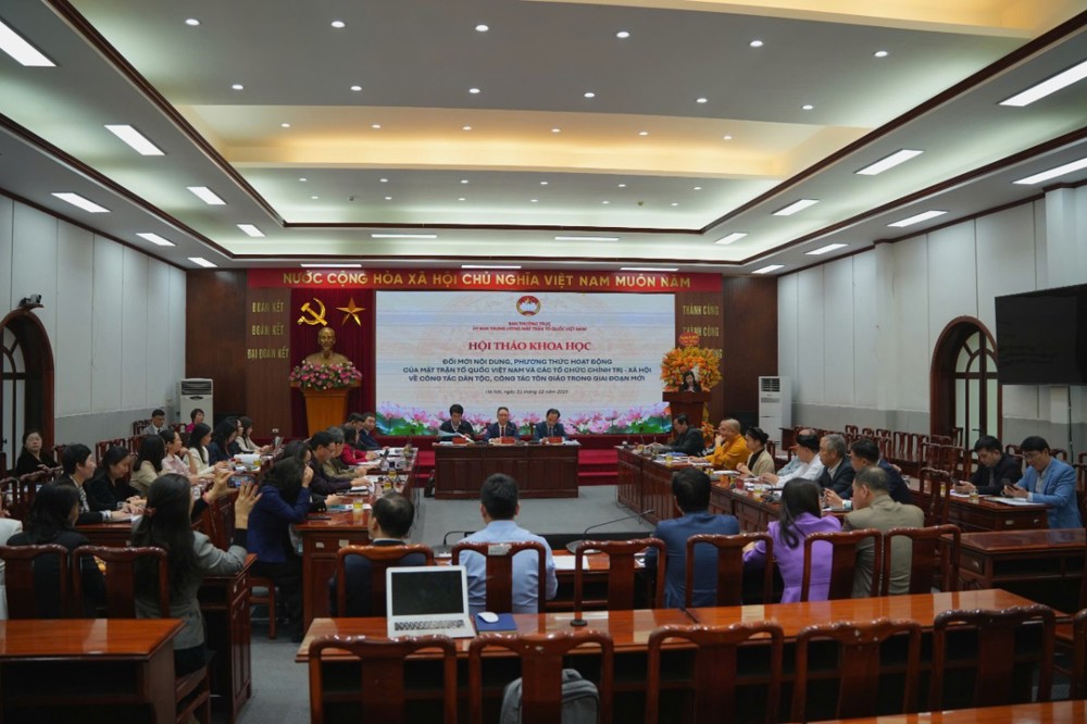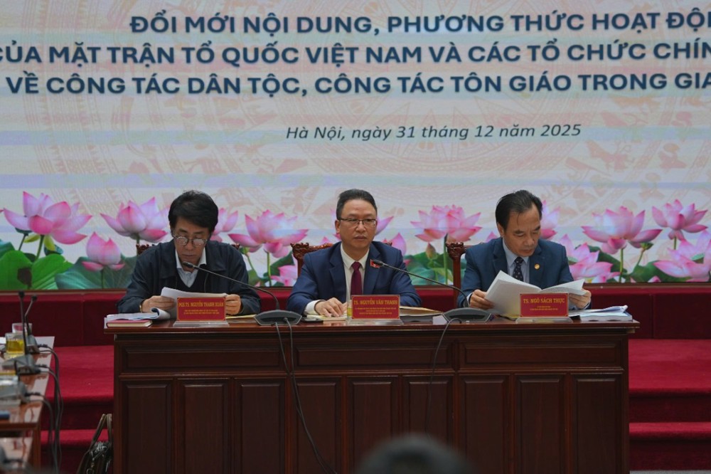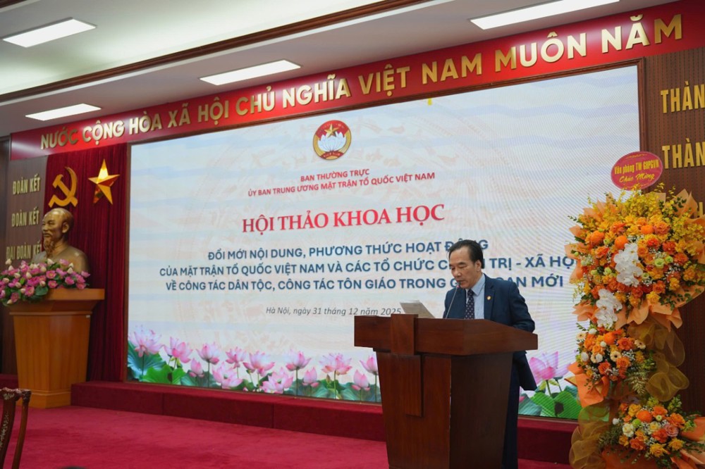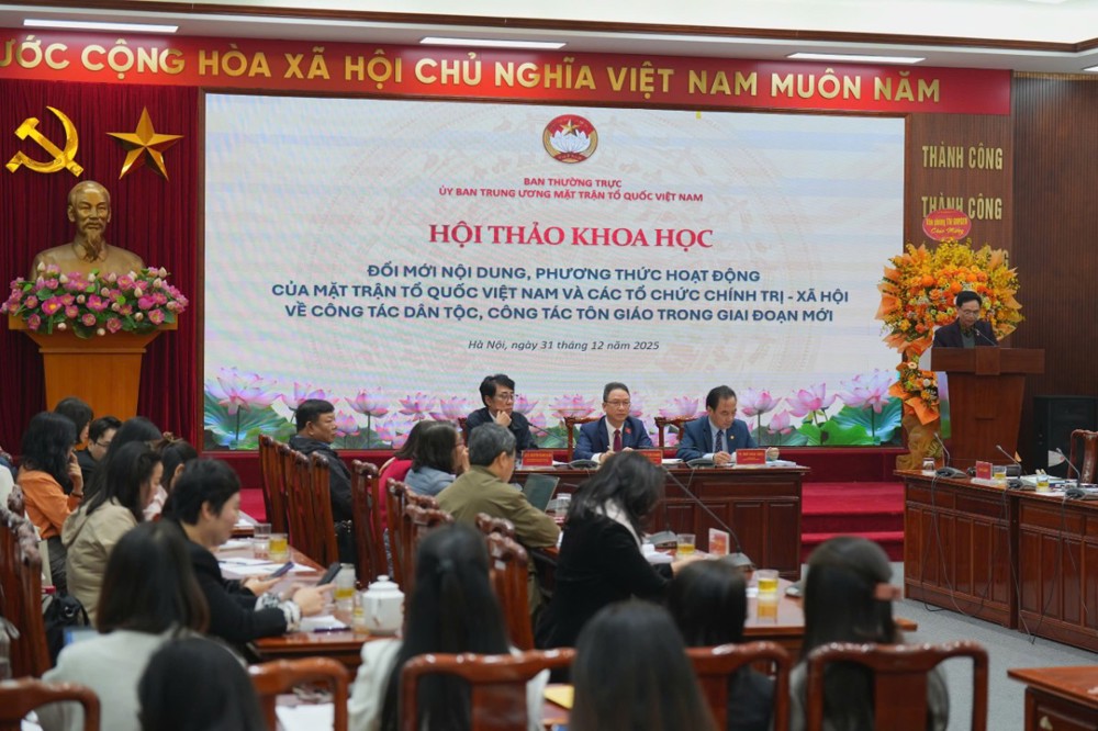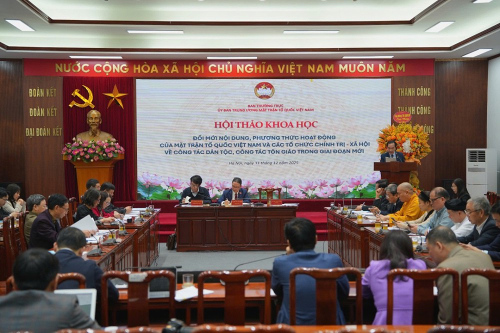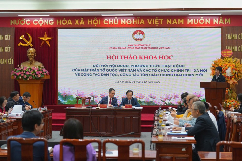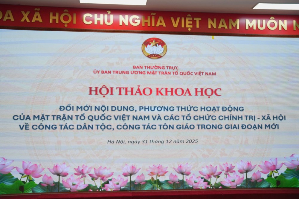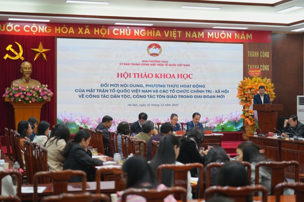 PSO - Sáng ngày 31/12/2025, Ban Thường trực UBTƯ MTTQVN đã tổ chức hội thảo “Đổi mới nội dung, phương thức hoạt động của MTTQ VN, các tổ chức chính trị – xã hội đối với công tác dân tộc, công tác tôn giáo trong giai đoạn mới” tại trụ sở UBTƯ MTTQVN, 46 Tràng Thi, Hà Nội. Hội thảo đã nhận được nhiều bài tham luận, đóng góp ý kiến chất lượng của các đại biểu, chuyên gia, nhà khoa học về dân tộc và tôn giáo.