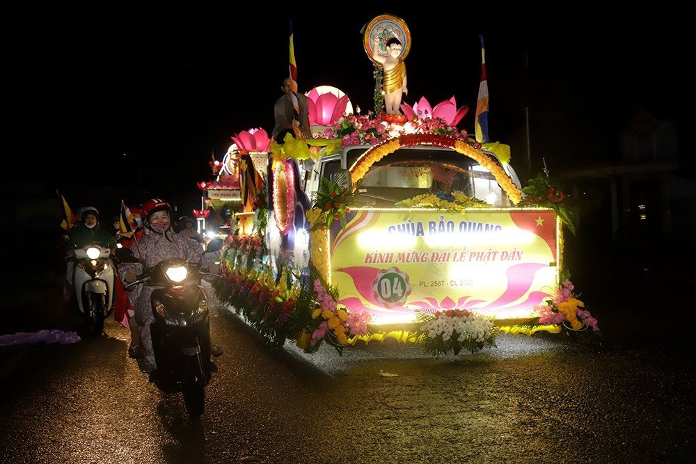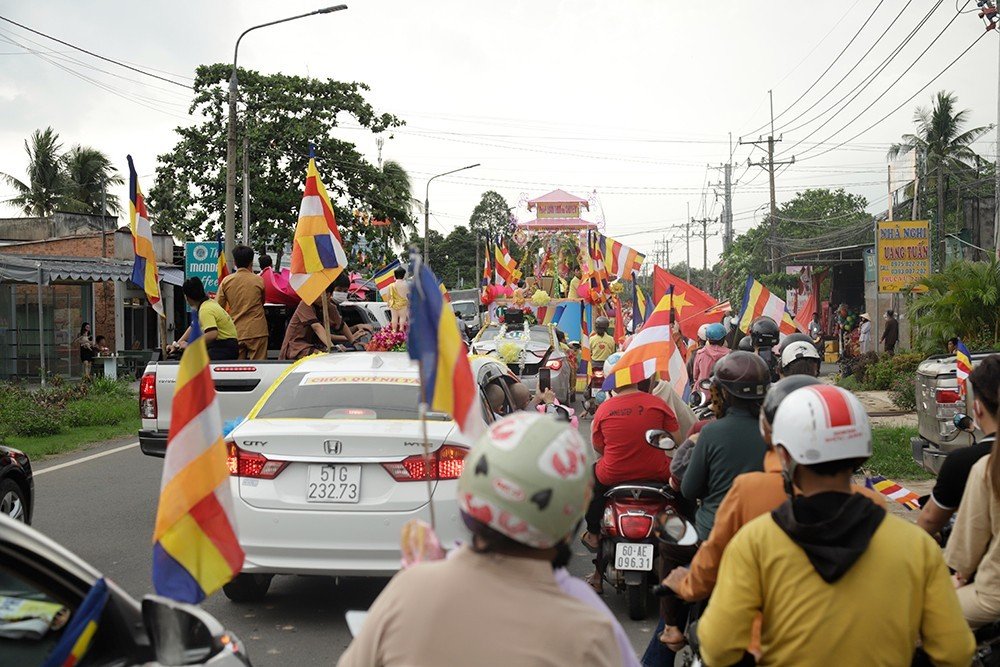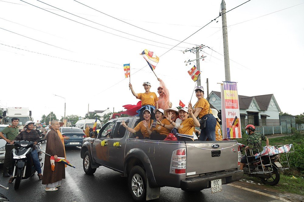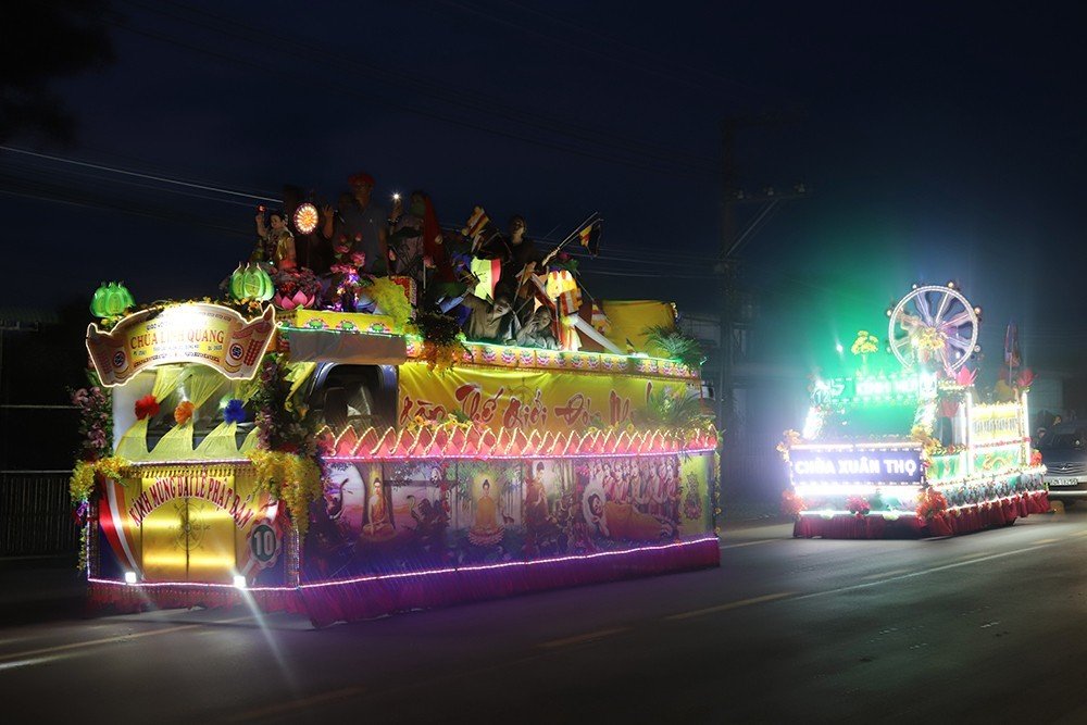 Trong niềm hoan hỷ vô biên đón mừng Phật đản, đoàn diễu hành có sự tham dự của Ban Tổ chức, Ban Điều hành xe hoa, xe chư Tăng Ni. Và sự hưởng ứng nồng nhiệt và thành kính của các GĐPT, các Đạo tràng Phật tử bằng xe mô tô, xe gắn máy, xe đạp được trang trí cờ, hoa,…rực rỡ kéo đài hơn 02km với số lượng gần 1000 người tham dự khiến cho cả đoạn đường dài lung linh tràn ngập hoa đèn, hoà vui theo ca khúc Kính mừng Phật Đản. Trên các tuyến đường các tự viện và các tư gia Phật tử cầm cờ hoa ra đón và chấp tay thành kính trong niềm tôn kính vô biên.
