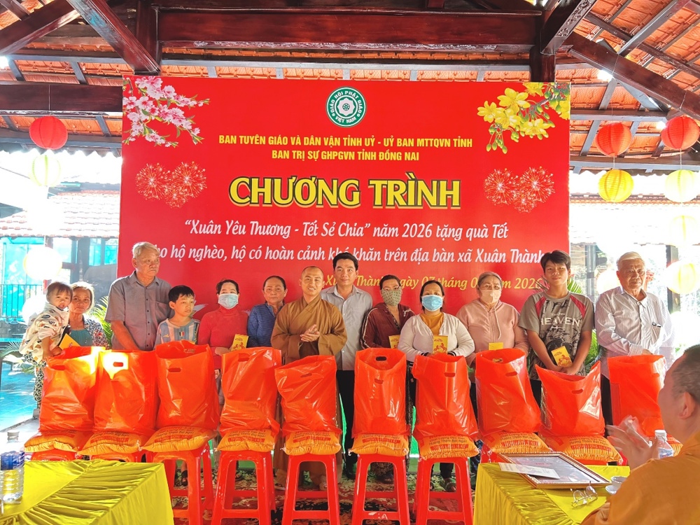 PSO - Trong không khí hân hoan đón Xuân Bính Ngọ và hướng tới Đại hội Đại biểu Phật giáo tỉnh Đồng Nai, chiều ngày 20 tháng Chạp, Ban Trị sự GHPGVN tỉnh Đồng Nai phối hợp cùng Ban Tuyên giáo và Dân vận Tỉnh ủy, Ủy ban MTTQ Việt Nam tỉnh Đồng Nai, và chính quyền địa phương đã trang trọng tổ chức “Phiên chợ 0 đồng”, trao tặng 300 phần quà đến bà con có hoàn cảnh khó khăn tại xã Xuân Lộc (200 phần) và xã Xuân Thạnh (100 phần).