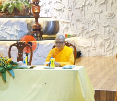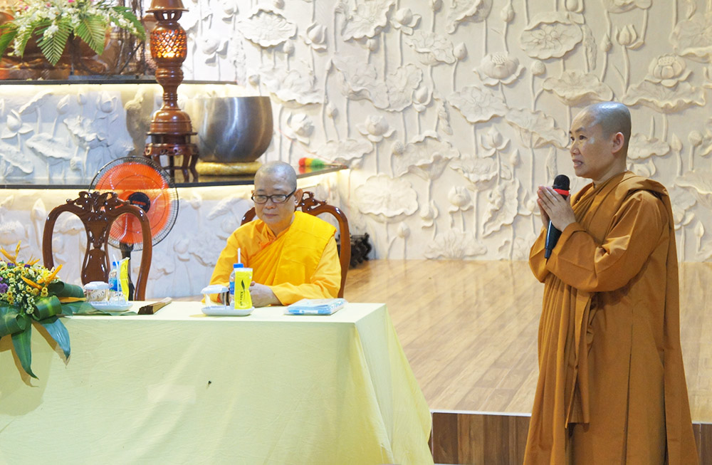 NS. Hằng Liên đại diện BTC có đôi lời phát biểu và chia sẻ một số kinh nghiệm khi tổ chức các khóa tu cho thiền sinh và sách tấn cho các chư Ni trẻ với tất cả những lời chia sẻ chân tình nhất. Đồng thời Ni sư cũng đại diện cho Đạo tràng Phật tử và Thiền sinh Hồng Trung Sơn và TT. Giác Khoan - Viện chủ Pháp Viện Thánh Sơn, kính cúng dường lên quý vị Ni trưởng, Ni sư cùng chư hành giả những phần phẩm vật và quà lưu niệm.