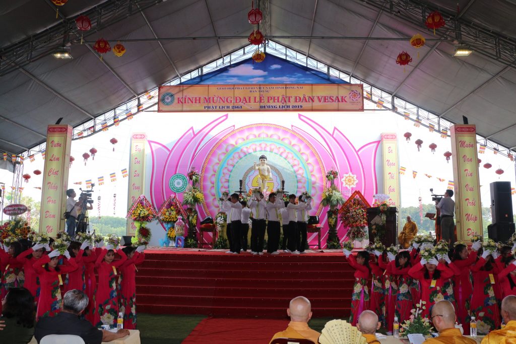 Sau phần tuyên bố lý do, cử Quốc ca, Đạo ca, HT. Thích Thiện Đạo đọc Thông điệp Phật đản Vesak của Tổng thư ký Liên Hợp Quốc, HT. Thích Nhật Quang đọc Thông điệp Phật đản PL.2563 của Đức Pháp chủ GHPGVN, Năm nay, hòa trong không khí hân hoan của cộng đồng Phật giáo trên toàn thế giới kỷ niệm ngày Vesak trọng đại, Giáo hội Phật giáo Việt Nam vô cùng vinh dự là nước chủ nhà đăng cai tổ chức Đại lễ Vesak Liên hợp quốc lần thứ 16, PL. 2563 – DL. 2019.. Đây là cơ hội quý báu để chúng ta cùng nhau tăng trưởng niềm tin vào chân lý giải thoát, phát huy giá trị những di sản mà Đức Thế tôn đã để lại cho nhân loại chúng ta trong hệ thống tư tưởng giáo lý vô giá về trí tuệ, lòng từ bi, triết lý vô ngã, tinh thần bất bạo động, những giá trị hòa bình và phát triển bền vững.