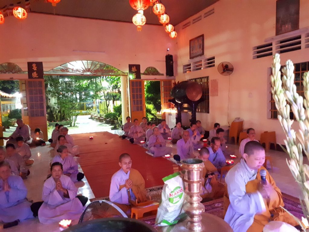 Trong không khí trang nghiêm của buổi lễ, lòng thành cung kính dâng hương tưởng niệm, Sư cô trụ trì và Ni chúng hướng dẫn quý Phật tử thiền hành, niệm danh hiệu đức Bổn sư Thích Ca Mâu Ni và xướng tụng bài kinh Lược sử Đức Phật Thích Ca để cúng dường lên Đức từ phụ, Thắp nến tri ân cầu nguyện cho thế giới hòa bình nhân dân an lạc. Tiếp theo đó, Sư cô Thích Nữ Huệ Hiếu có bài pháp thoại chia sẻ với đề tài “Ý nghĩa ngày Phật Thích Ca Xuất gia”, toàn thể đạo tràng trang nghiêm thanh tịnh nghe pháp trong niềm hoan hỷ.
