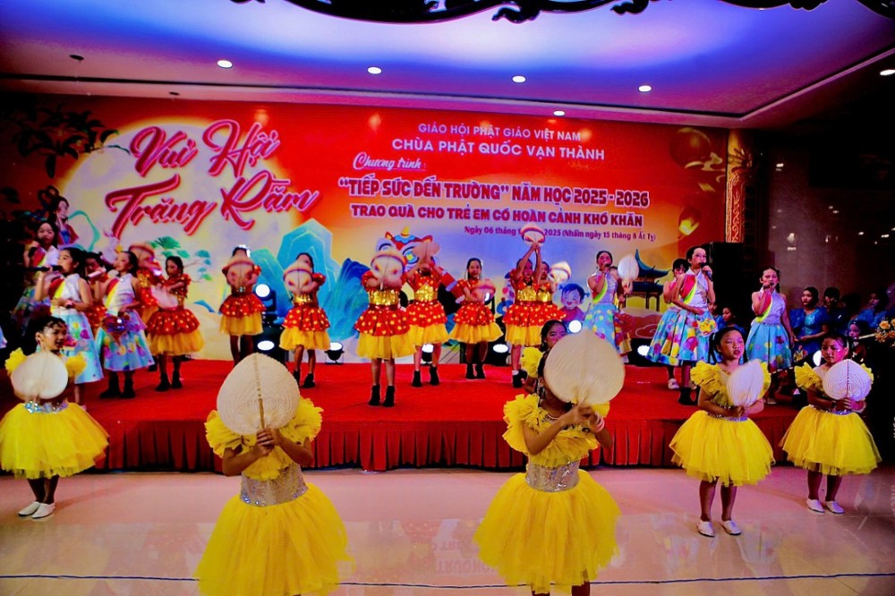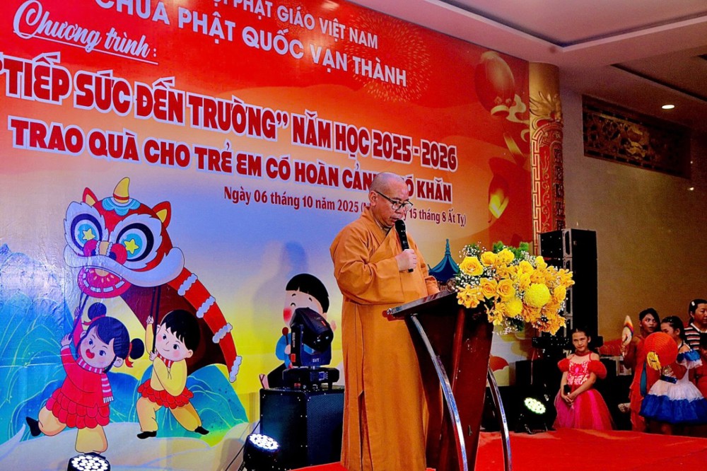 Tại đêm hội, Thượng tọa Thích Nguyên Hiếu – Trưởng Ban Tổ chức phát biểu khai mạc, nhấn mạnh: “Trẻ em hôm nay, thế giới ngày mai.” Đồng hành cùng xã hội trong việc chăm sóc mầm non của đất nước, chùa Phật Quốc Vạn Thành cùng với sự chung tay của các nhà hảo tâm đã tổ chức chương trình Trung thu và trao học bổng “Tiếp sức đến trường” cho các cháu thiếu nhi và thanh thiếu niên địa phương.