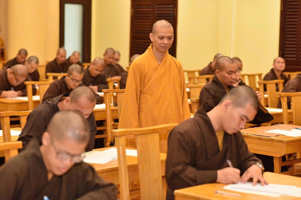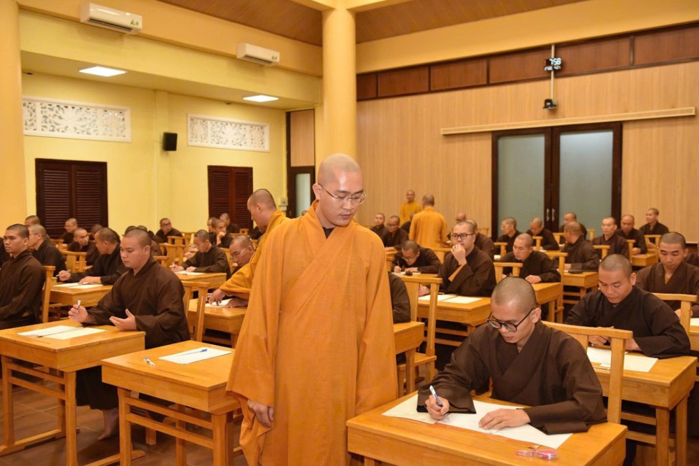 Tiếp đó, ĐĐ. Thích Thiện Trí, Phó Chủ nhiệm đọc nội quy phòng thi, Thượng tọa Phó Viện trưởng trao đề thi được niêm phong cho Đại đức Thích Đạt-Ma Quang Tuệ, Phó Chủ nhiệm Thường trực Lớp Cao đẳng. Sau khi kiểm tra niêm phong, đề thi được mở phát cho Tăng sinh làm bài môn đầu tiên.
