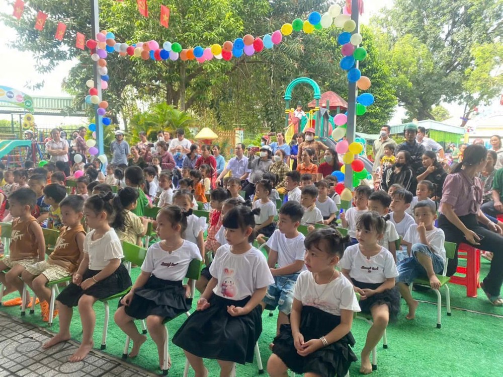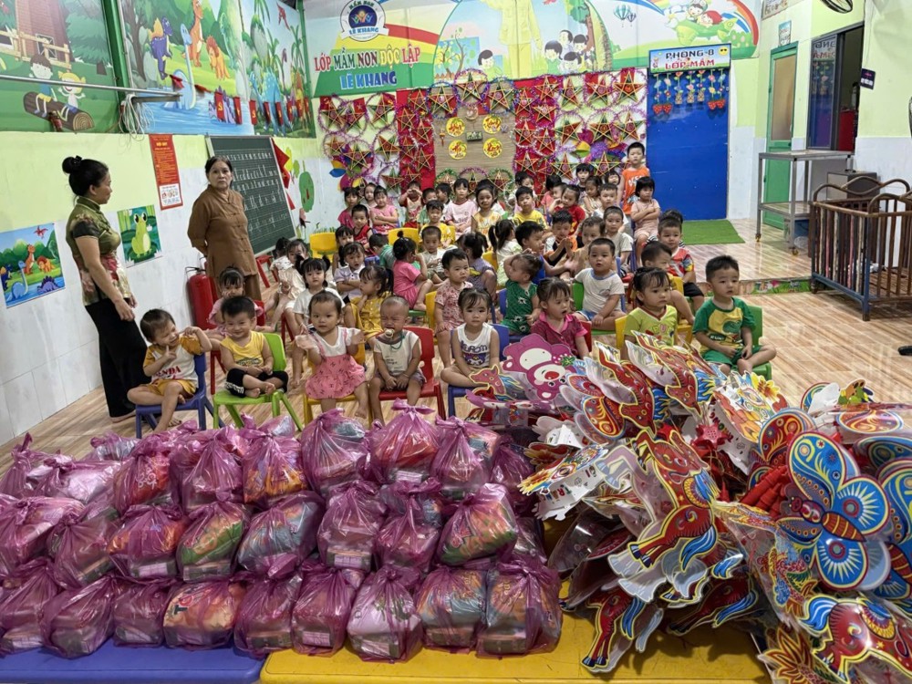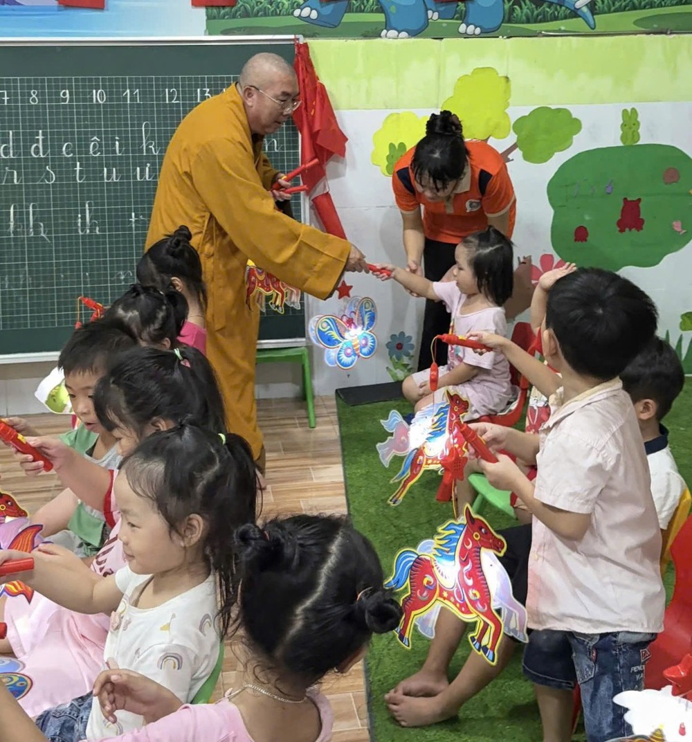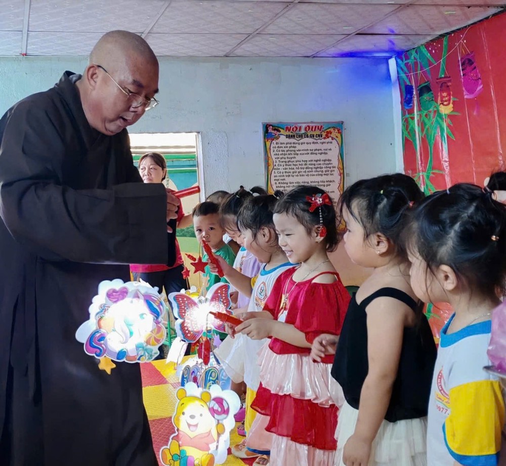 Tại Trường Tiểu học và Mẫu giáo Bình Hòa, Thượng tọa cùng Phật tử còn chuẩn bị 1.370 phần quà, vượt xa dự kiến ban đầu, để bảo đảm mọi em nhỏ đều có niềm vui đêm rằm.
