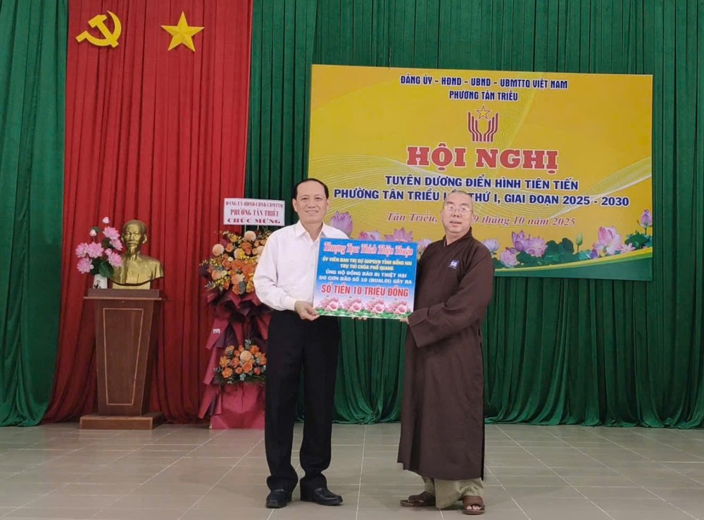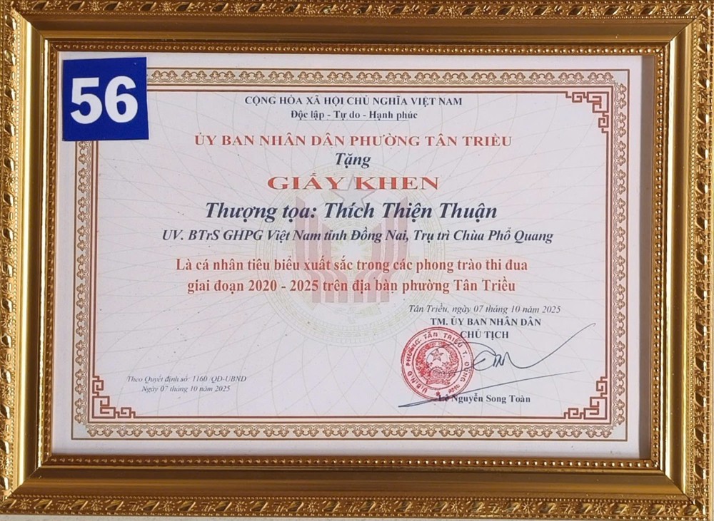 Ngày 9/10/2025, trong Hội nghị tổng kết phong trào thi đua yêu nước giai đoạn 2020–2025, UBND phường Tân Triều đã tuyên dương và trao Giấy khen cho Thượng tọa Thích Thiện Thuận vì những đóng góp nổi bật trong công tác xã hội.