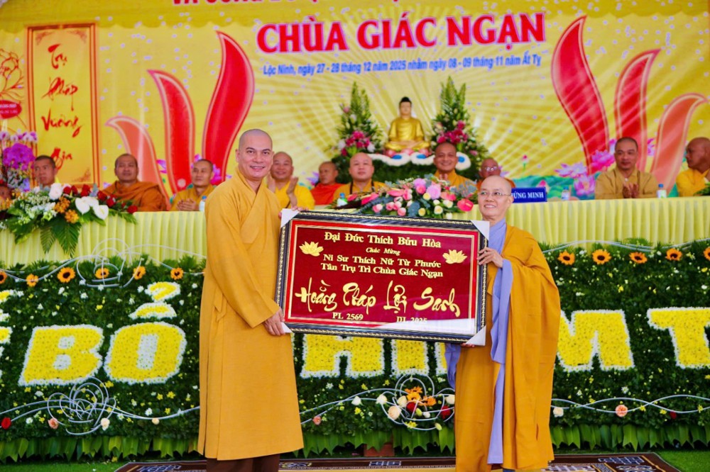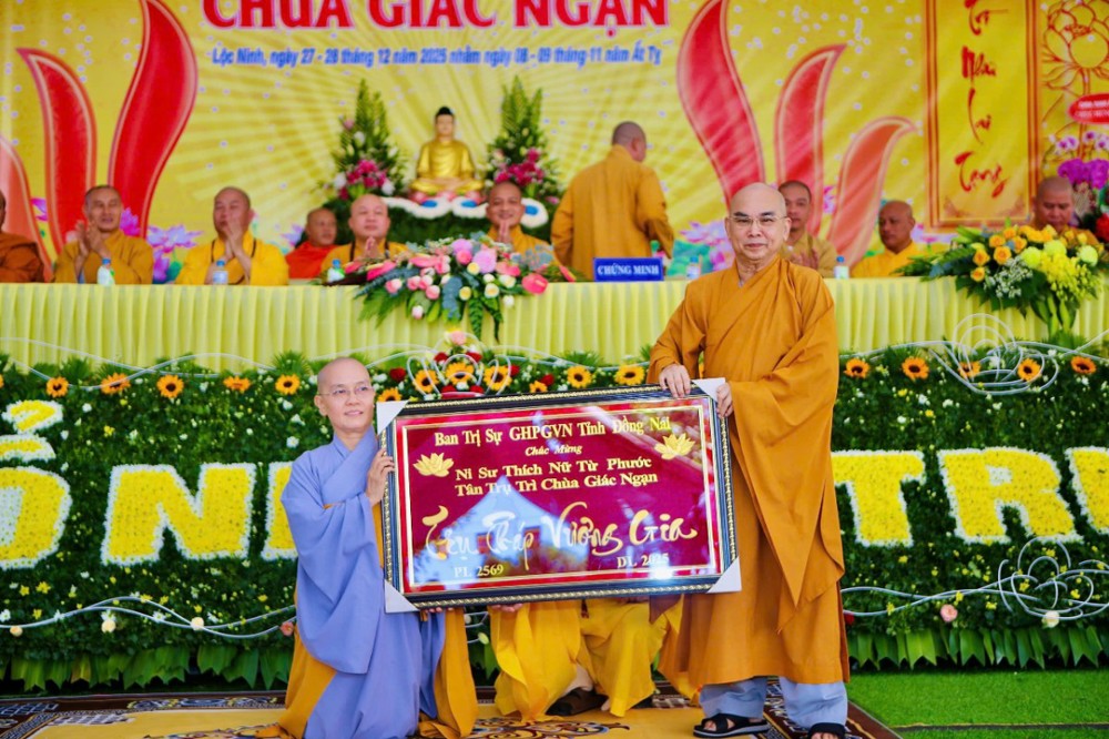 Thay mặt Ban Chứng minh, Hoà Thượng Thích Cường UV HĐTS, Phó trưởng ban Thường trực ban đạo từ, xin chúc mừng Ni Sư Thích Nữ Từ Phước chính thức có cơ sở hành đạo tại Chùa Giác Ngạn, xã Lộc Ninh. Hoà Thượng cũng gửi lời khuyến tấn đến Ni Sư Thích Nữ Từ Phước tân trụ trì, mong Ni Sư luôn đồng hành cùng chính quyền trong các công tác an sinh xã hội, tích cực hỗ trợ những hoàn cảnh khó khăn, góp phần xây dựng đời sống văn hóa, tinh thần tại khu dân cư nơi chùa Giác Ngạn tọa lạc. Đồng thời, Hoà thượng cũng bày tỏ mong muốn các cấp chính quyền tiếp tục quan tâm, hỗ trợ và tạo điều kiện thuận lợi để Ni Sư Thích Nữ Từ Phước hoàn thành tốt các Phật sự được giao.