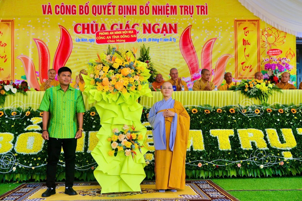 Sau lời đạo là phần chúc mừng Tân trụ trì chùa Giác Ngạn. Ni Sư Thích Nữ Từ Phước đã đón nhận những lẵng hoa tươi thắm từ Ban Trị sự GHPGVN tỉnh Đồng Nai, đại diện chính quyền các cấp và quý Phật tử gần xa gửi đến, thể hiện tấm lòng hoan hỷ và sự tin tưởng đối với trọng trách mới của Ni Sư Thích Nữ Từ Phước tại trú xứ Chùa Giác Ngạn này.