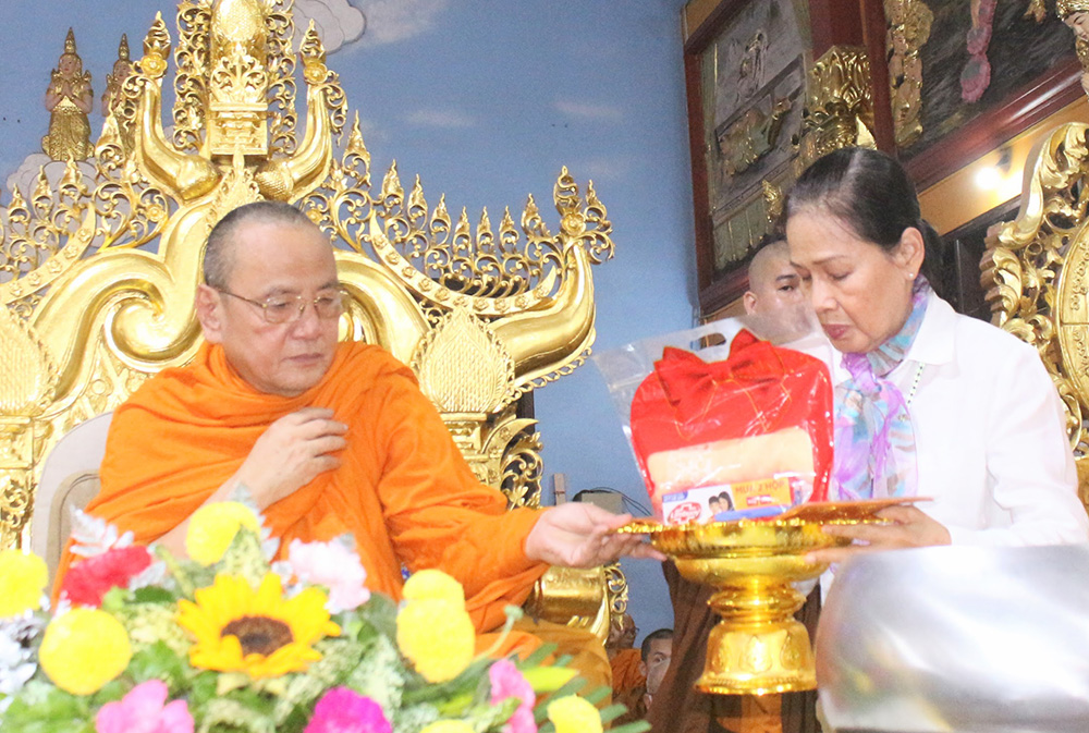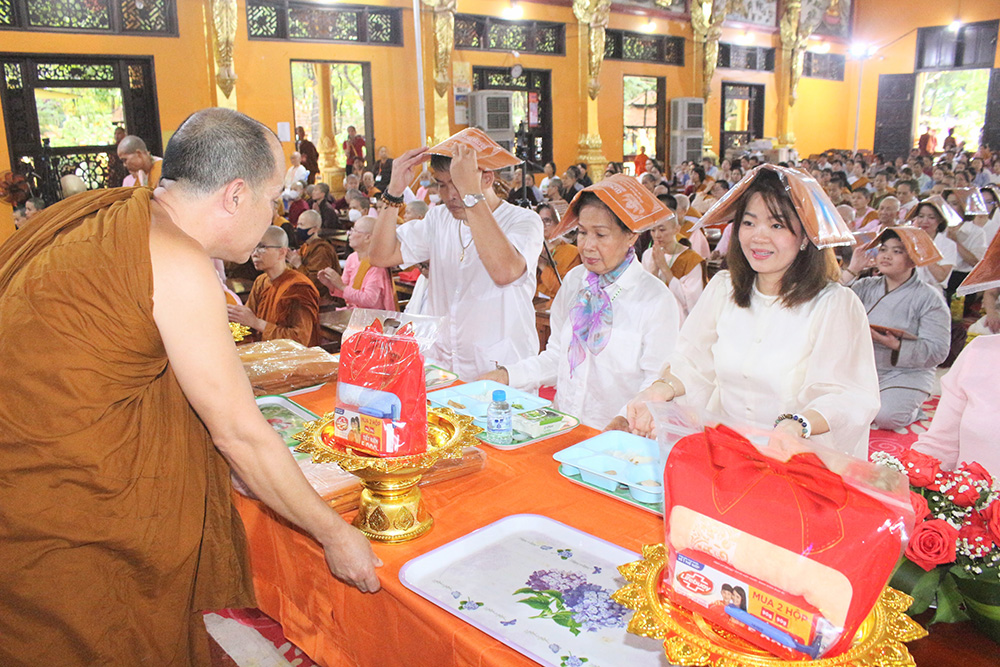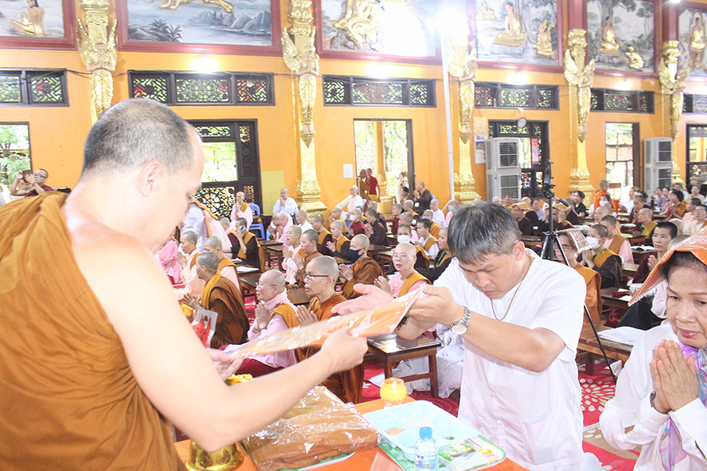 Sau 10p thiền, gia đình thí chủ Vy Hoàng Hồng dâng tứ sự và Vải Choàng Tắm Mưa lên Hòa thượng Viện chủ Thích Bửu Chánh và chư Tăng chứng minh.