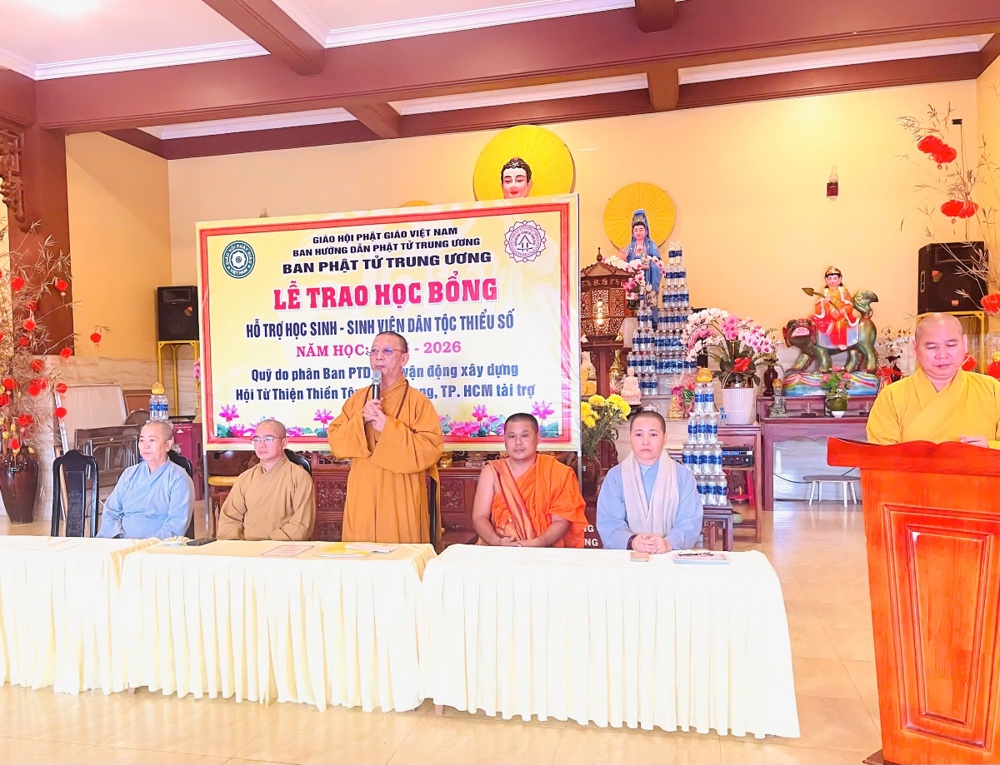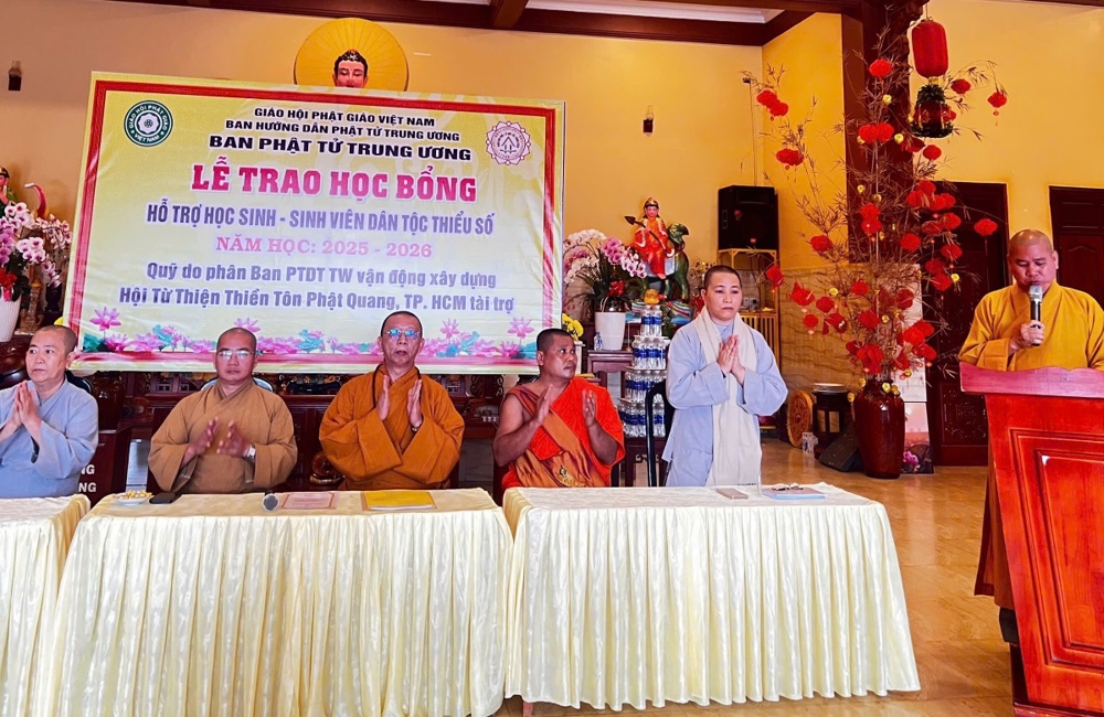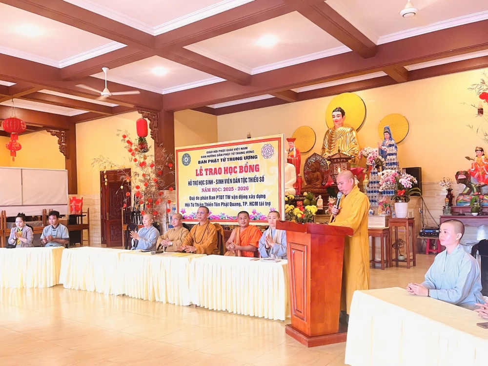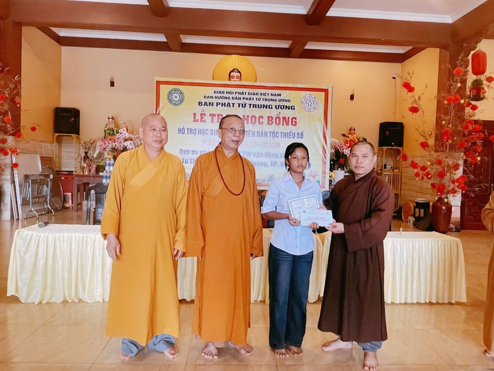 Sáng ngày 12 tháng 10 năm 2025 (tức ngày 21 tháng 8 năm Ất Tỵ), tại chùa Phổ Quang, xã Bù Đăng, tỉnh Đồng Nai, Phân ban Hướng dẫn Phật tử Dân tộc Trung ương (PTDT TƯ) đã tổ chức buổi lễ trao học bổng trang trọng.