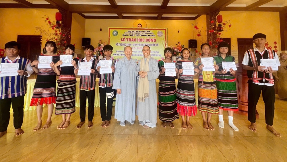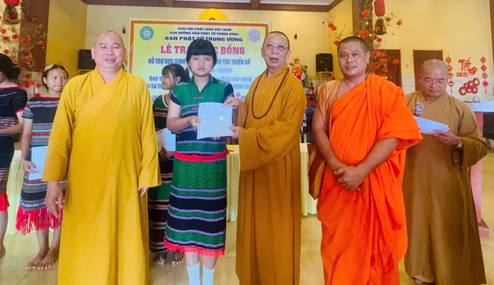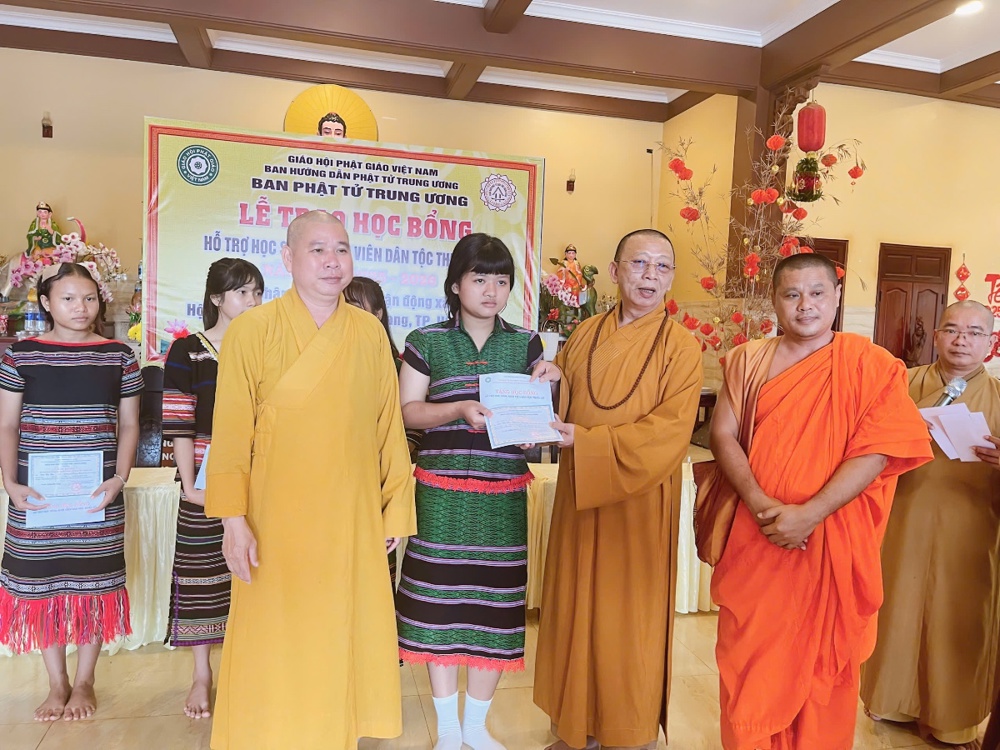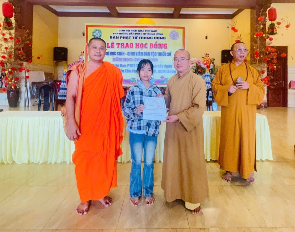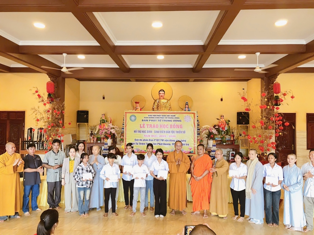 Tại buổi lễ, Ban Tổ chức đã tiến hành trao 20 suất học bổng ý nghĩa cho các em học sinh, sinh viên Phật tử thuộc đồng bào dân tộc S’tiêng và Khmer. Mỗi suất học bổng trị giá 3.000.000 đồng/em/năm, với tổng kinh phí do Hội Từ thiện Thiền Tôn Phật Quang tài trợ.