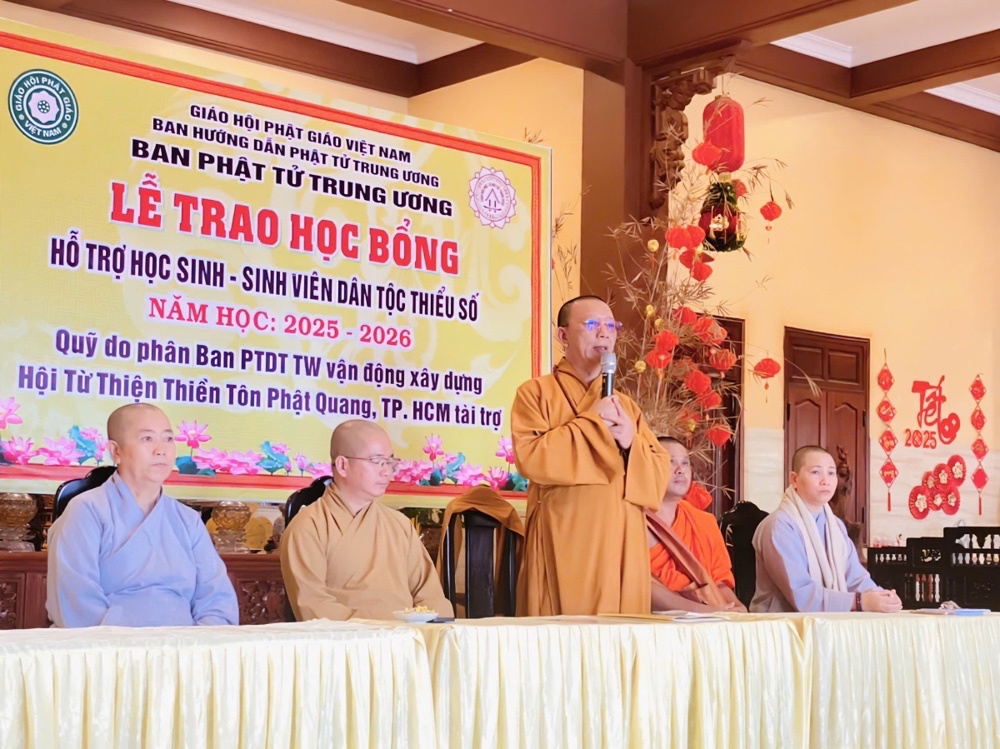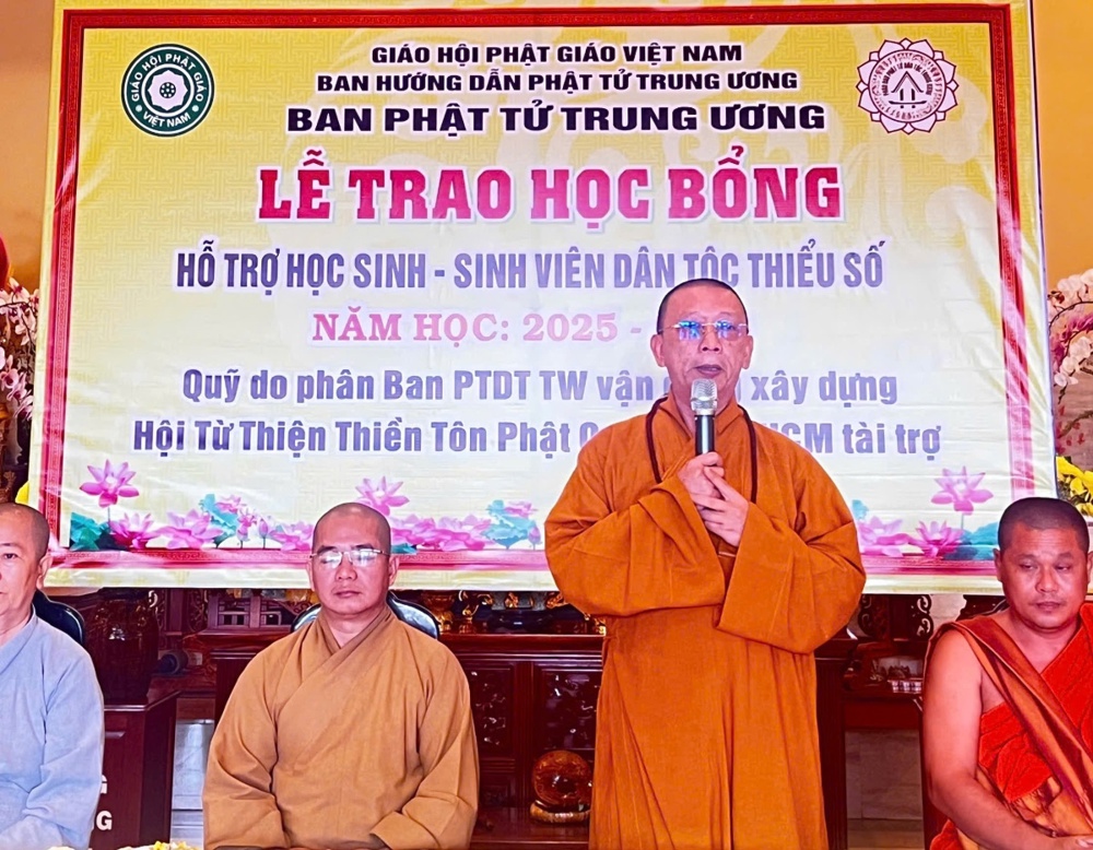 Phát biểu tại buổi lễ, Thượng tọa Thích Quảng Tuấn, Trưởng Phân ban PTDT TƯ, đã nhấn mạnh ý nghĩa của hoạt động này: “Việc khuyến học, khuyến tài là trách nhiệm của toàn xã hội. Các suất học bổng từ các tổ chức, tôn giáo, doanh nghiệp, mạnh thường quân thể hiện sự quan tâm sâu sắc của cộng đồng, góp phần lan tỏa những giá trị tích cực và xây dựng một xã hội học tập bền vững.”