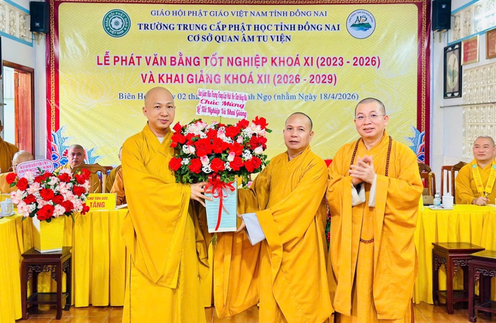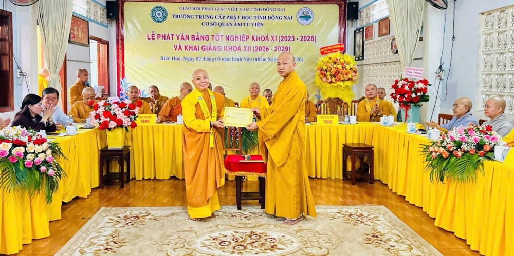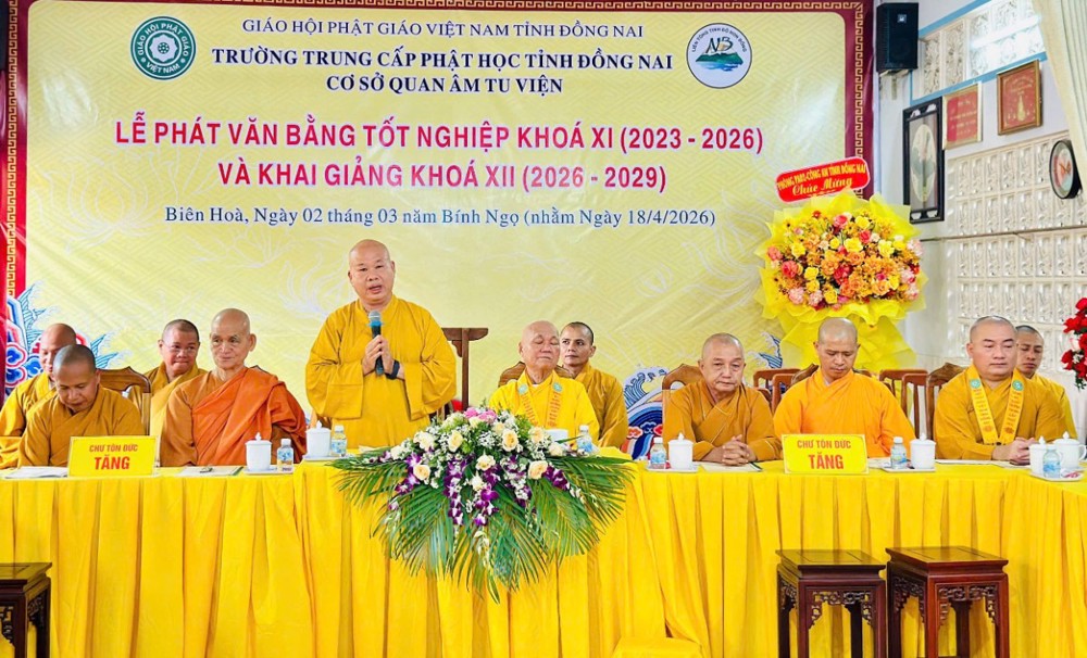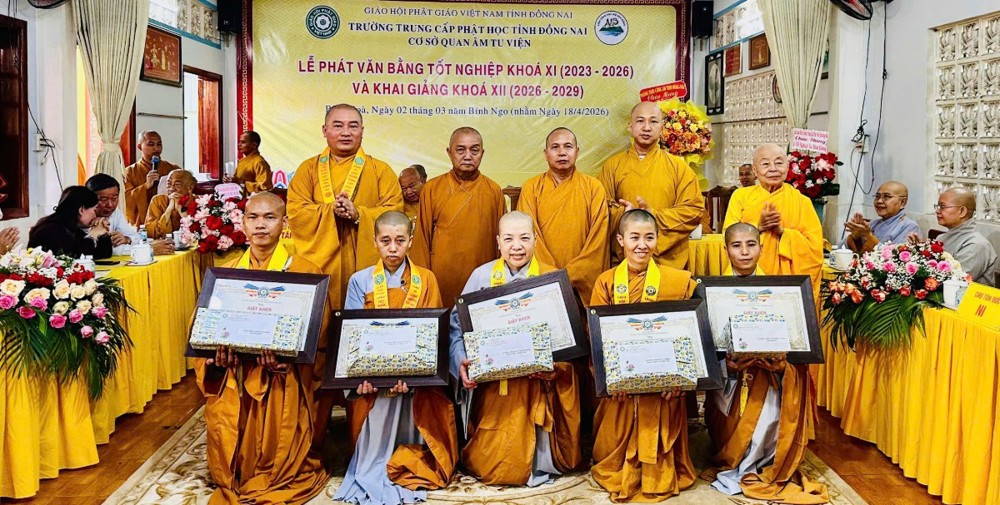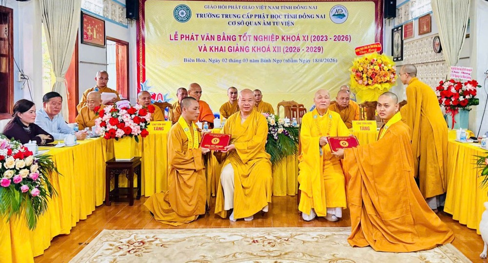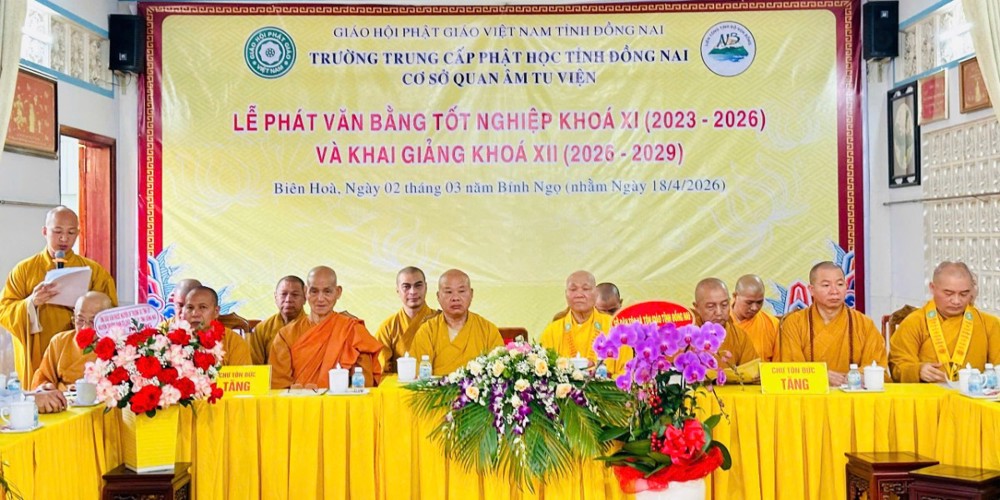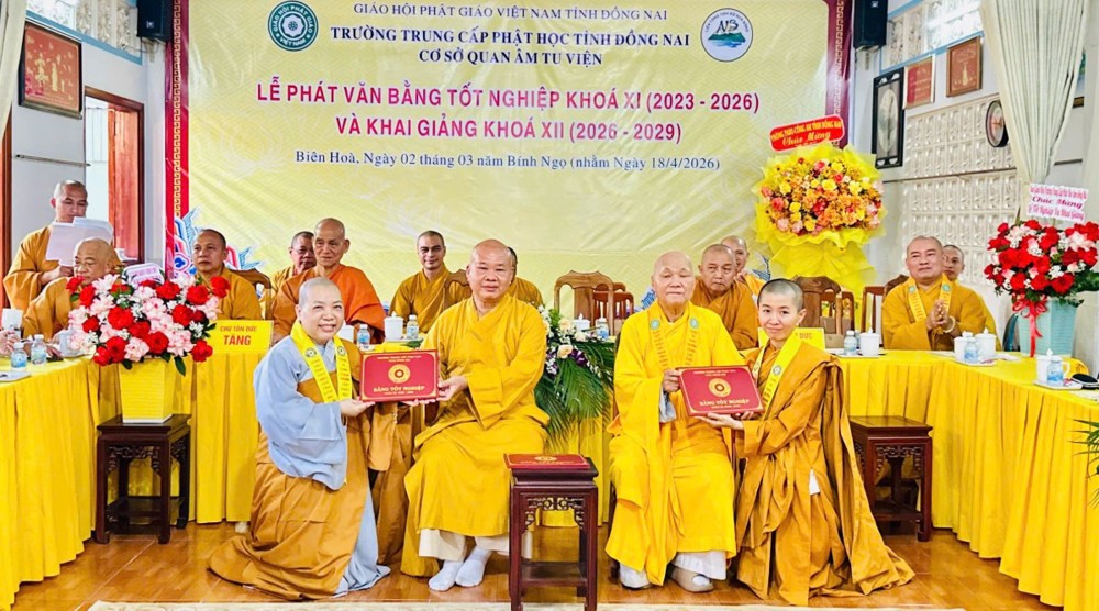 PSO - Sáng ngày 18/04/2026 (nhằm ngày 02/03 năm Bính Ngọ), tại Quan Âm Tu viện (tỉnh Đồng Nai) đã trang trọng diễn ra Lễ phát văn bằng Tốt nghiệp cho 34 Tăng Ni sinh khóa 11 (2023 – 2026) và Khai giảng khóa 12 (2026 – 2029) với sự tham dự của đông đảo chư Tôn đức giáo phẩm và đại diện chính quyền các cấp.