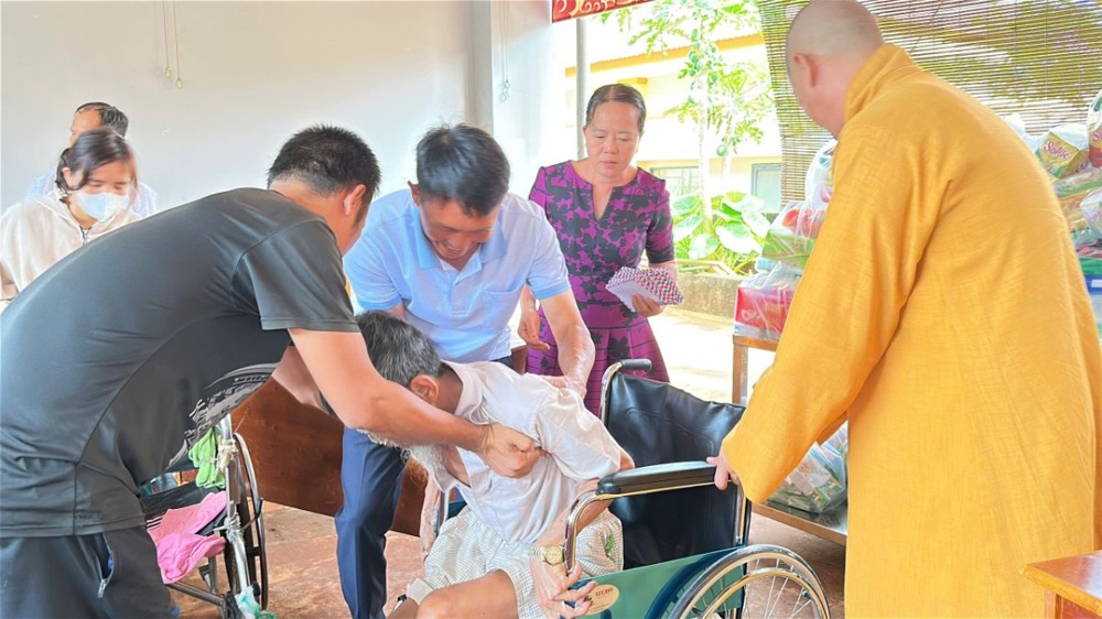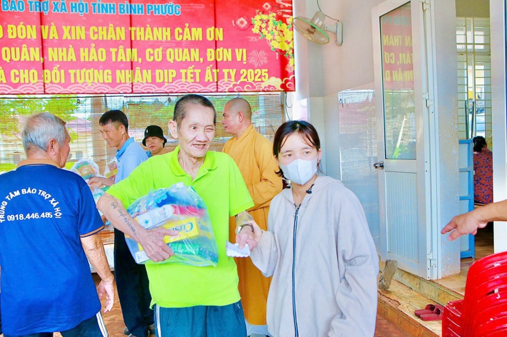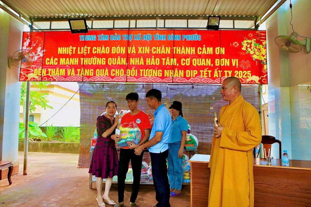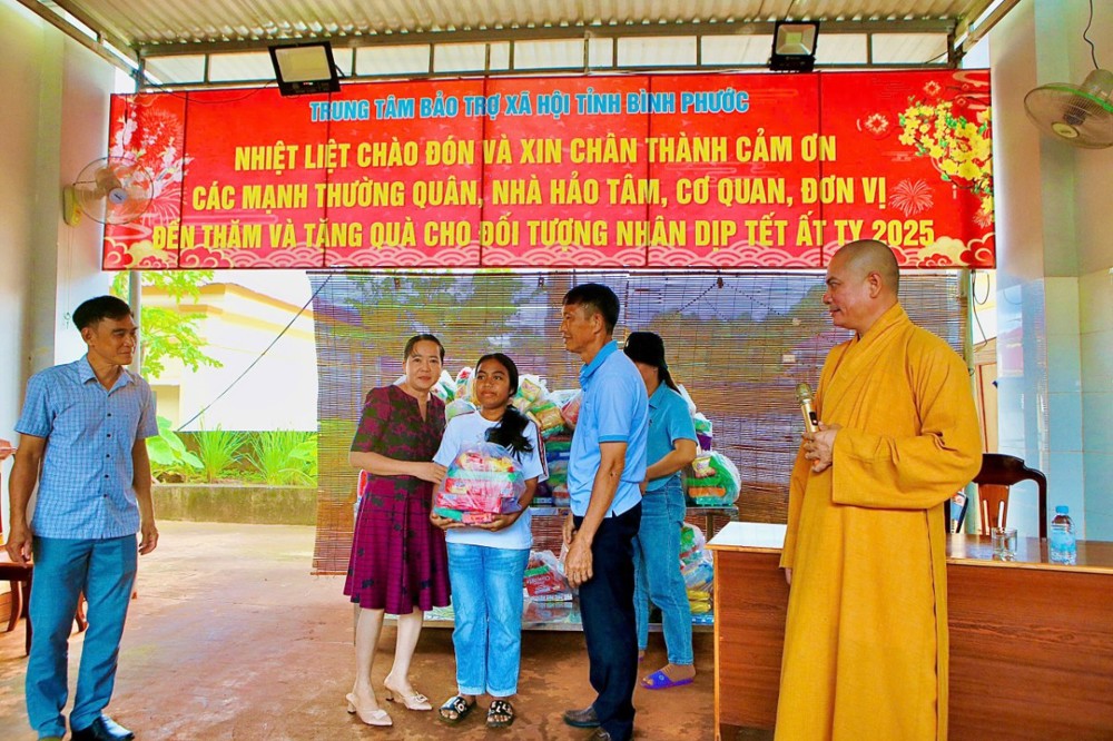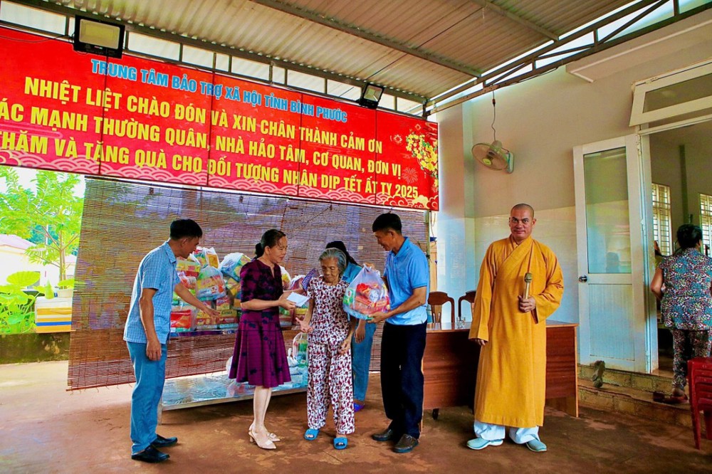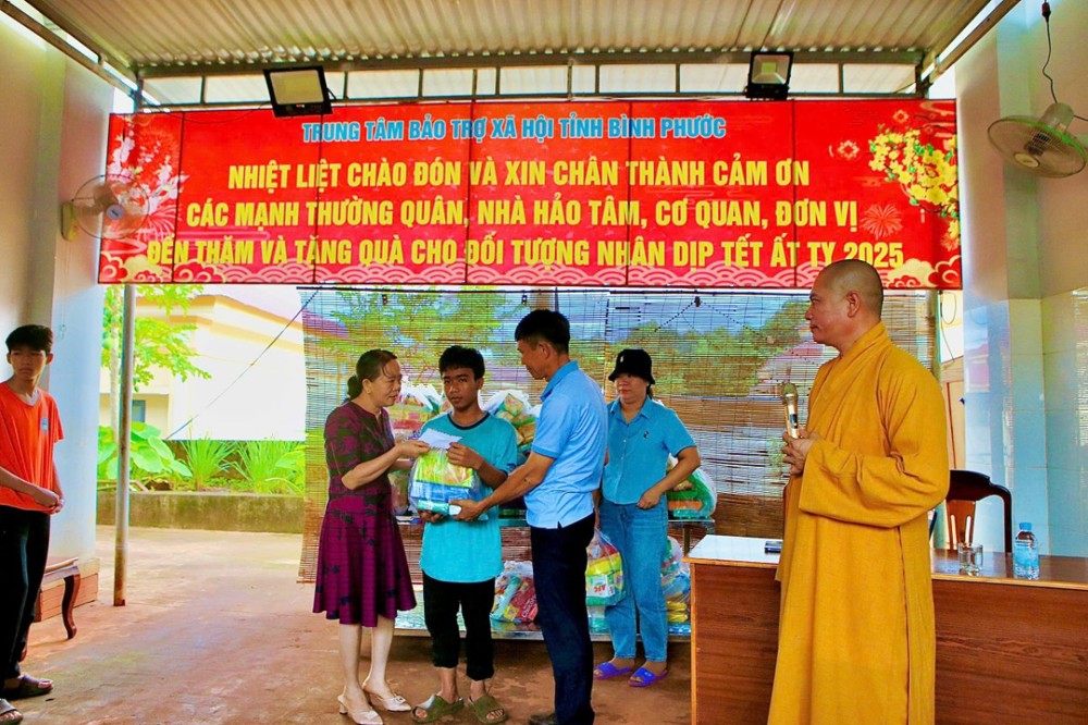 Tại buổi trao quà, Đại đức Thích Bửu Hòa đã gửi lời tri ân đến Ban Giám đốc Trung tâm Bảo trợ xã hội Bình Phước đã tạo điều kiện để đoàn được thăm hỏi, giao lưu và chia sẻ yêu thương. Đồng thời Đại đức cũng ân cần thăm hỏi từng cụ già, từng em nhỏ và trao những phần quà tuy mộc mạc nhưng chứa đựng trong đó là cả tấm lòng của người con Phật, khởi phát từ tâm từ bi và tinh thần “phụng sự nhân sinh, tốt đời đẹp đạo”.