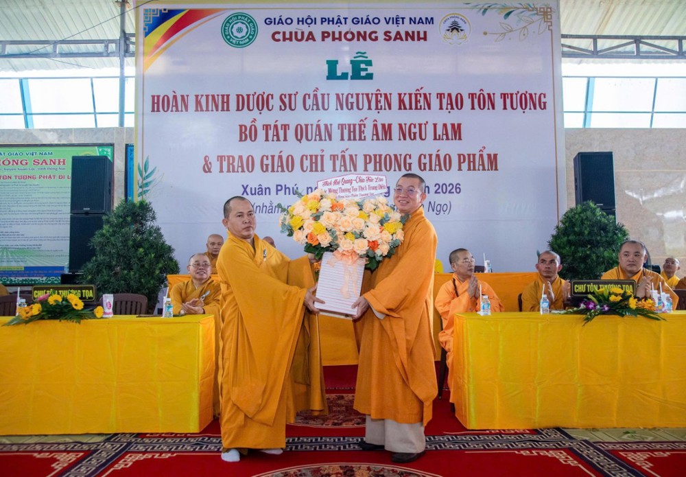 PSO - Sáng ngày 12/4/2026 (nhằm ngày 25/02 năm Bính Ngọ), tại chùa Phóng Sanh (xã Xuân Phú, tỉnh Đồng Nai) đã trang nghiêm diễn ra Lễ trao Giáo chỉ tấn phong giáo phẩm Thượng tọa đến Thượng tọa Thích Trung Điền.