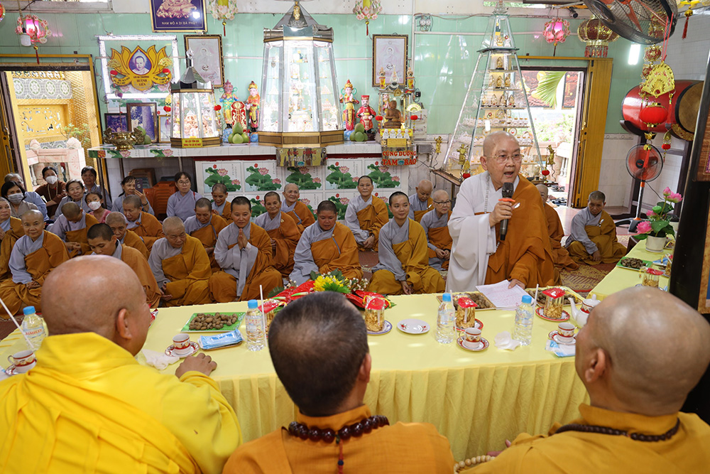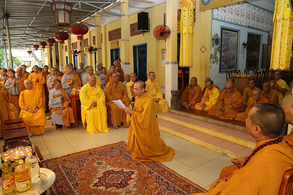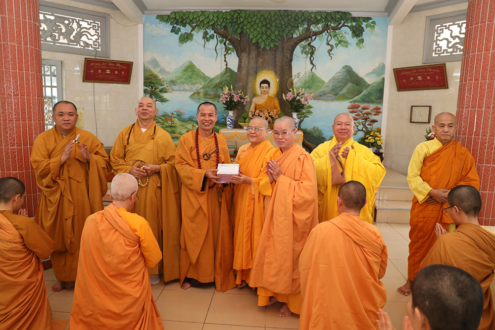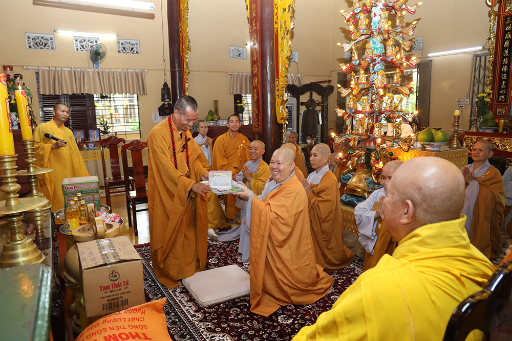 Đoàn Thường trực BTS GHPGVN Tp.Biên Hòa thể hiện sự quan tâm và cúng dường tịnh tài, tịnh vật lên chư Tăng Ni nơi hạ trường và khuyến tấn chư Tăng Ni giữ nghiêm hạ trường, thanh lọc thân tâm đúng Giới - Định - Tuệ.