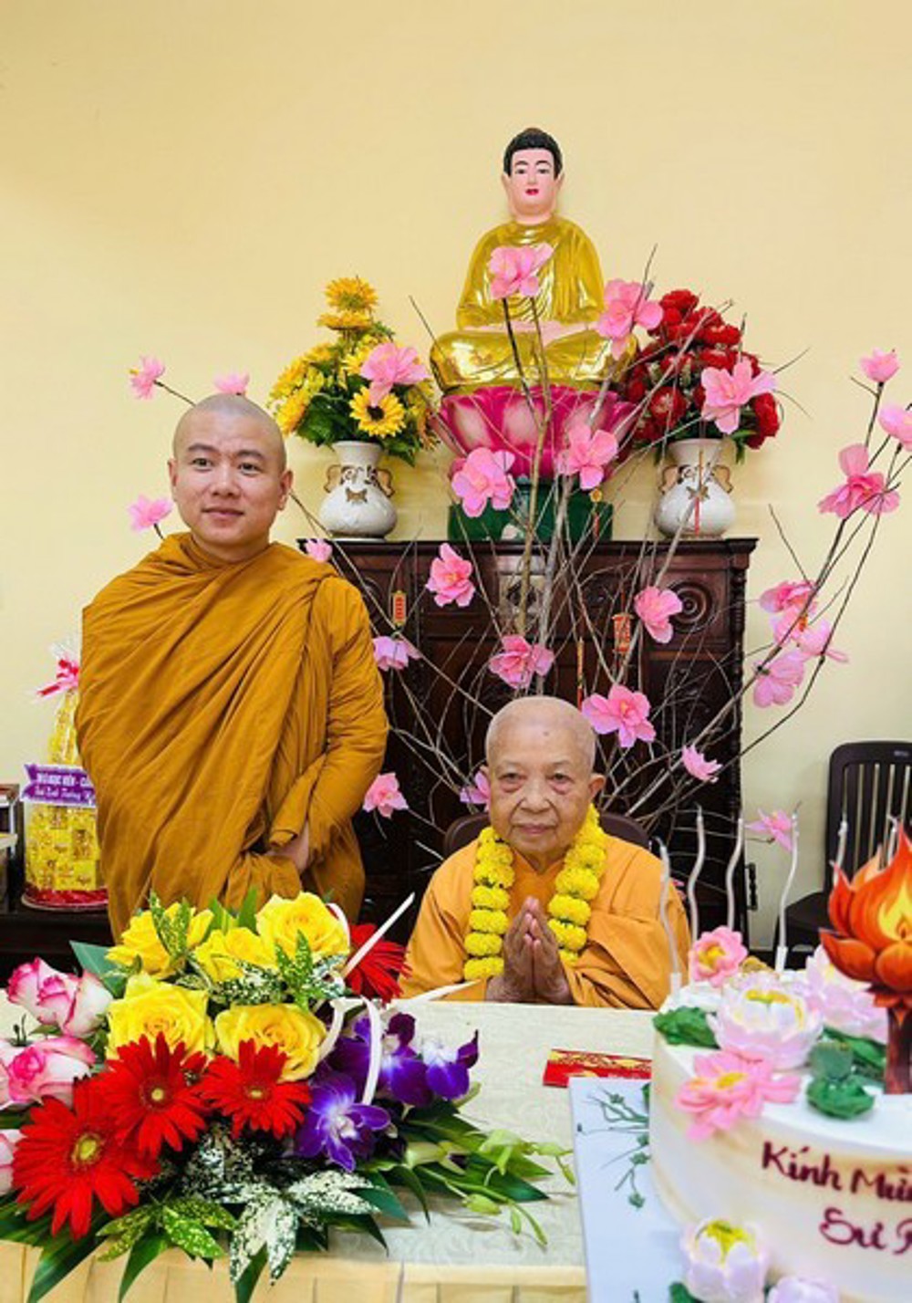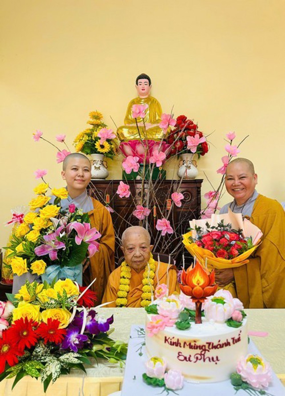 Trong buổi lễ, hai Sư cô Cầu Liên, Bảo Liên ở tuổi thượng thọ cũng được Ni sư Trụ trì thân tặng những đóa hoa tươi chúc mừng trong không khí ấm áp và thân tình. Món quà nhỏ nhưng chan chứa sự quan tâm và khích lệ, như lời chúc các Sư cô luôn giữ vững đạo tâm, an nhiên tu học và tiếp tục đồng hành cùng đại chúng trong nếp sống thiền môn thanh tịnh.