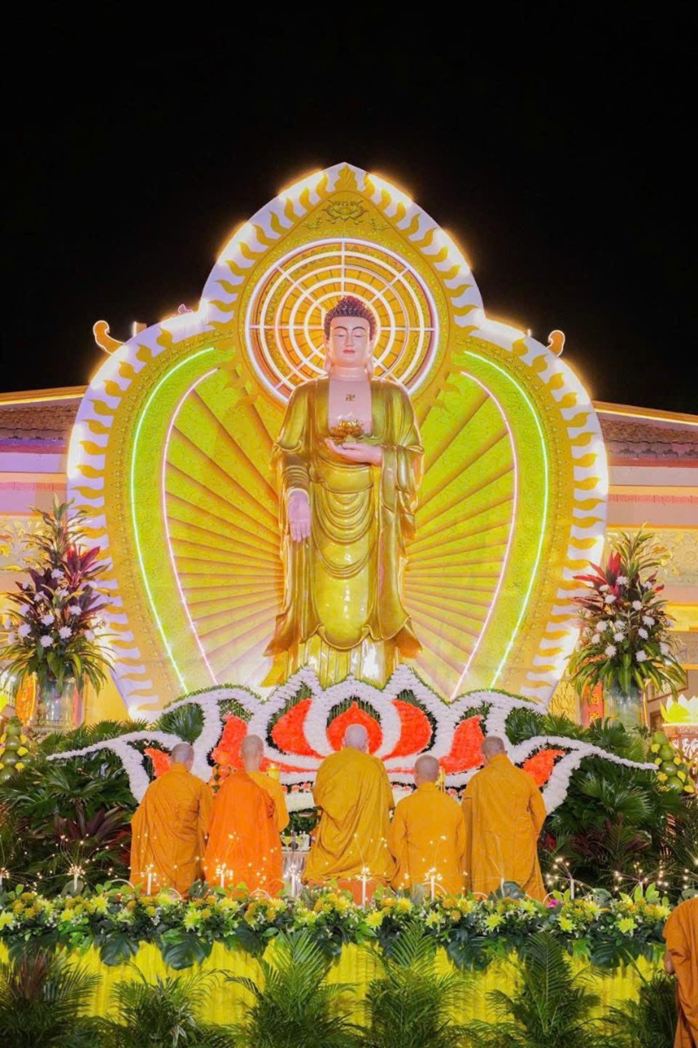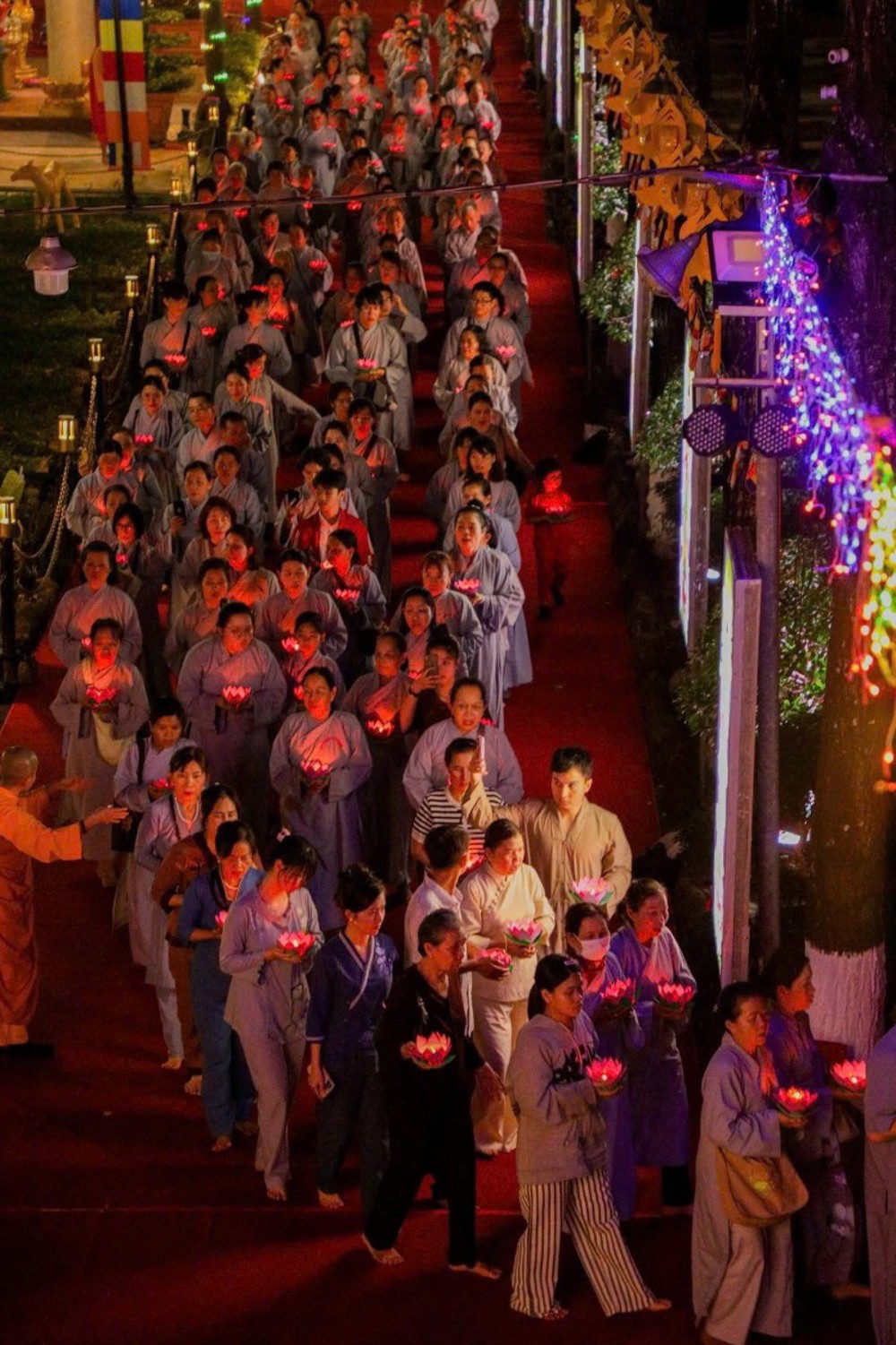 Dưới bầu trời đêm tĩnh lặng, trong không gian cổ kính của già lam, hàng ngàn ngọn hoa đăng được thắp sáng lung linh, tượng trưng cho ánh sáng trí tuệ và lòng từ bi vô lượng của Đức Phật A Di Đà. Mỗi ngọn đèn là một tâm niệm thanh tịnh, một lời cầu nguyện chí thành dâng lên Đức Phật Đạo sư tiếp dẫn chúng sanh về cõi an lạc.