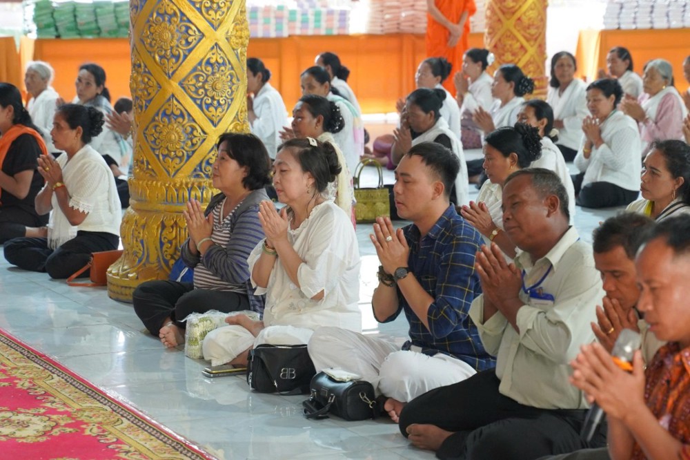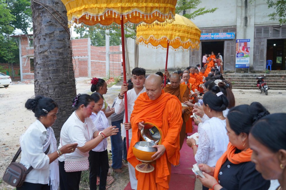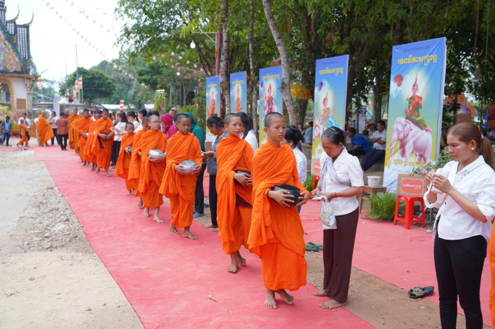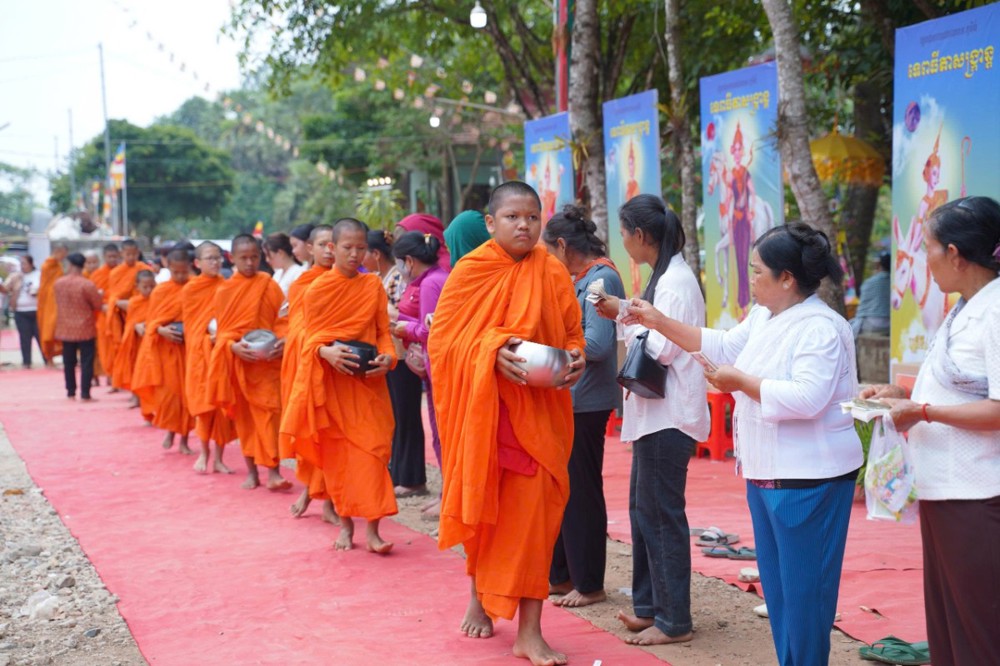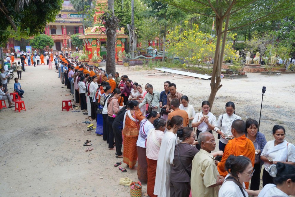 Sau nghi thức rước chư thiên, đại chúng tiếp tục trang nghiêm cử hành lễ đặt bát (dâng cơm) đến 50 vị chư Tăng. Đây là nét đẹp văn hóa tâm linh đặc trưng trong dịp Tết cổ truyền của đồng bào Khmer. Với lòng thành kính, bà con Phật tử đã chuẩn bị các món ăn truyền thống, dâng lên chư Tăng, thể hiện tâm niệm gieo trồng phước báu, tri ân và hộ trì Tam bảo.