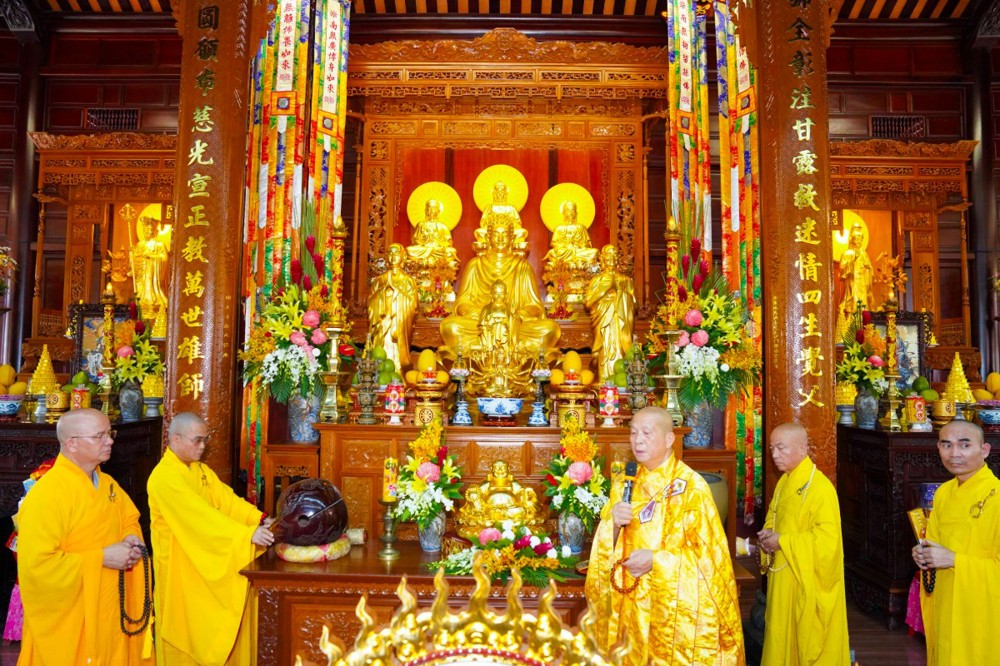 Tiếp đó, trong niềm thành kính, đạo tràng trang nghiêm cung nghinh Hòa thượng Thích Pháp Đăng cùng chư Tôn đức Tăng quang lâm Đại Hùng Bửu Điện cử hành nghi thức Lễ Thượng Nguyên.