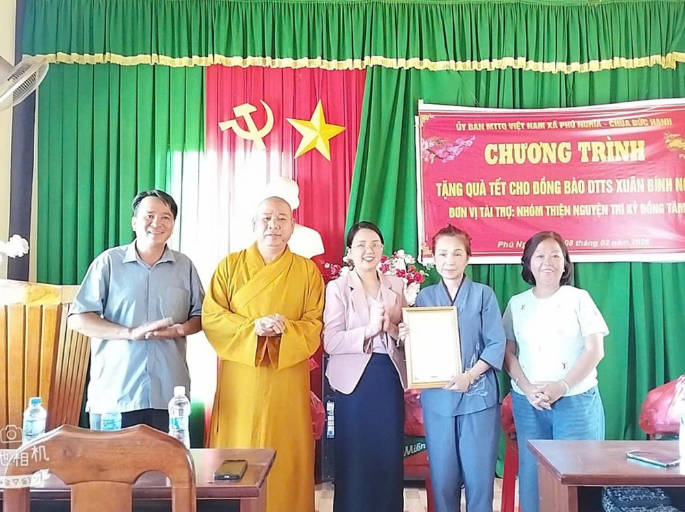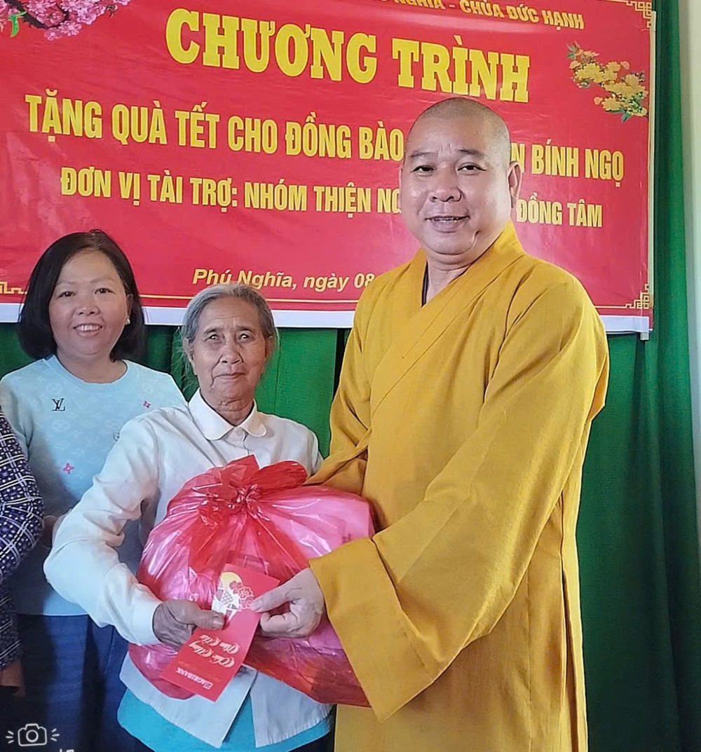 Sáng ngày 8/2/2026, tiếp nối hành trình sẻ chia yêu thương, ĐĐ. Thích Minh Hậu phối hợp cùng chánh quyền xã Phú Nghĩa hướng dẫn nhóm Tri Kỷ Đồng Tâm (TP.HCM), do cư sĩ Trần Thị Nga làm Trưởng đoàn đến thôn Đăk Son 1, xã Phú Nghĩa, trao 50 phần quà Xuân cho các hộ nghèo. Mỗi phần quà trị giá 500 nghìn đồng, góp phần giúp bà con đón Tết thêm ấm áp, vơi bớt nhọc nhằn. Tổng kinh phí cho hoạt động này là 25 triệu đồng.