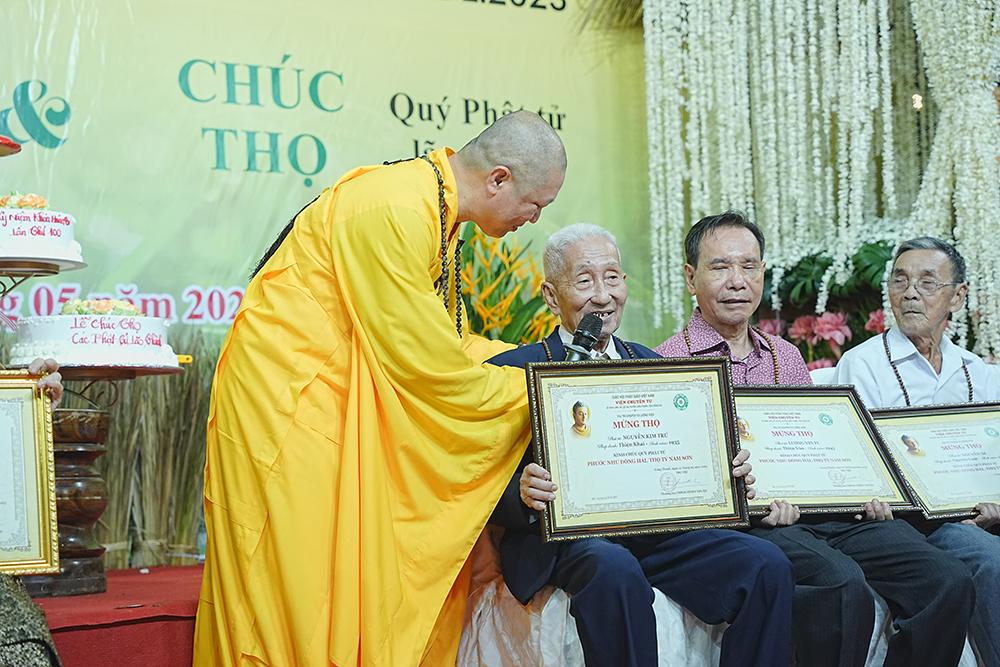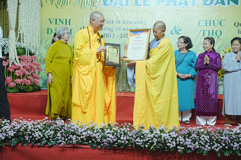 Dịp này, có 65 chư hành giả được Thầy trụ trì vinh danh và tặng kỷ niệm chương, 92 vị cao niên được trao tặng chuỗi đeo, giấy mừng thọ. Điều này thể hiện sự tri ân của Thượng tọa trụ trì đối với quý Phật tử vì có nhiều đóng góp trên chặng hành trình 10 năm xây dựng đạo tràng tại vùng đất mới Lộc An, Đồng Nai.