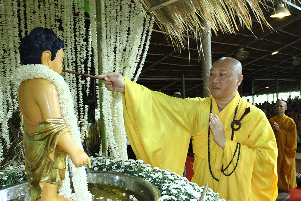 Tại đây, lễ đài tắm Phật được chư Tăng và Phật tử Viện Chuyên Tu gia công thực hiện. Các nghi thức tắm Phật diễn ra trang nghiêm, thành kính và hỷ lạc. Mọi người lần lượt múc nước hoa thơm rưới lên vai tôn tượng Thế Tôn hài nhi trong tiếng kinh cầu đầy cảm xúc: “Con nay được tắm cho Như lai. Trí tuệ quang minh công đức lớn. Được thấy trần gian hiện pháp thân…”.