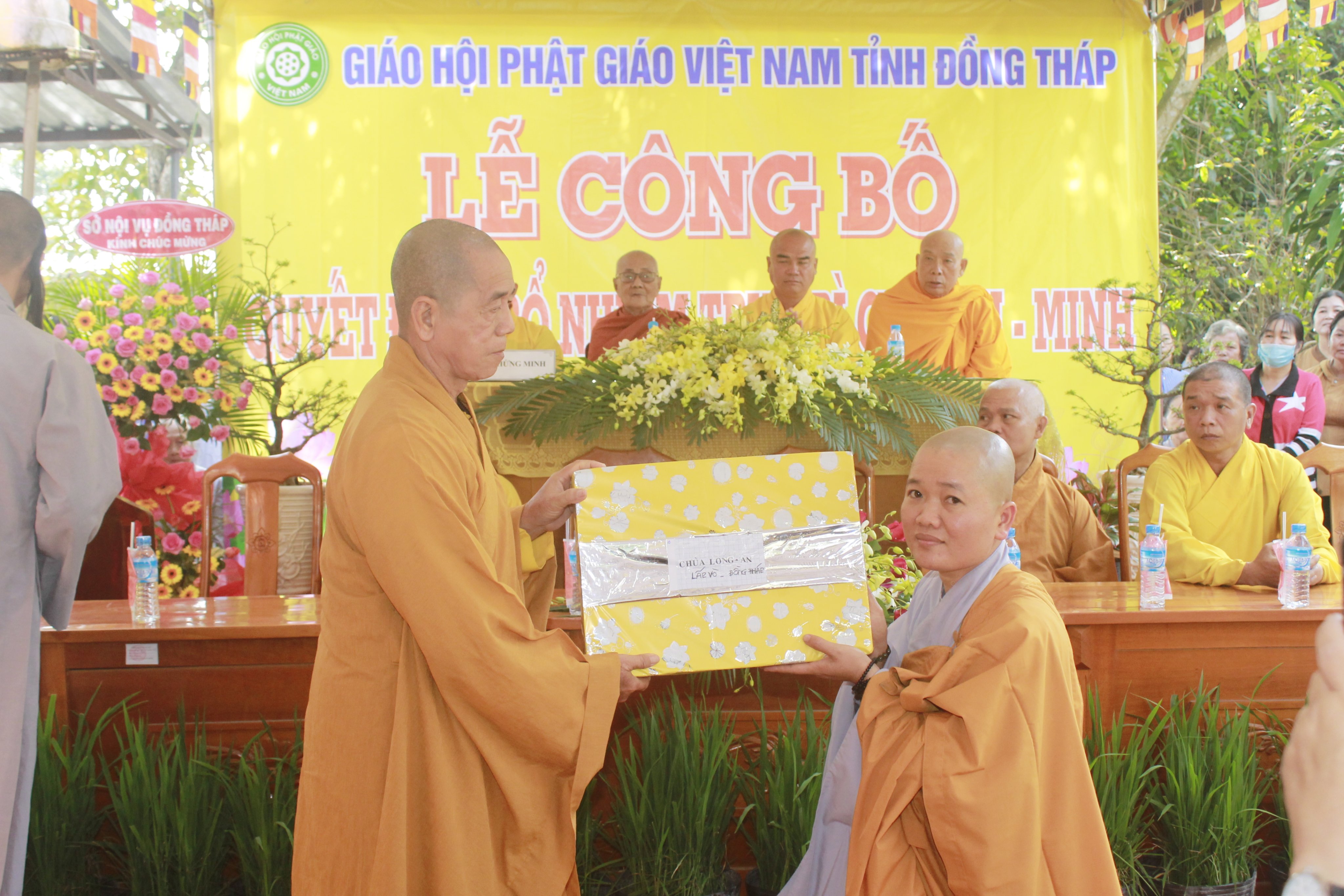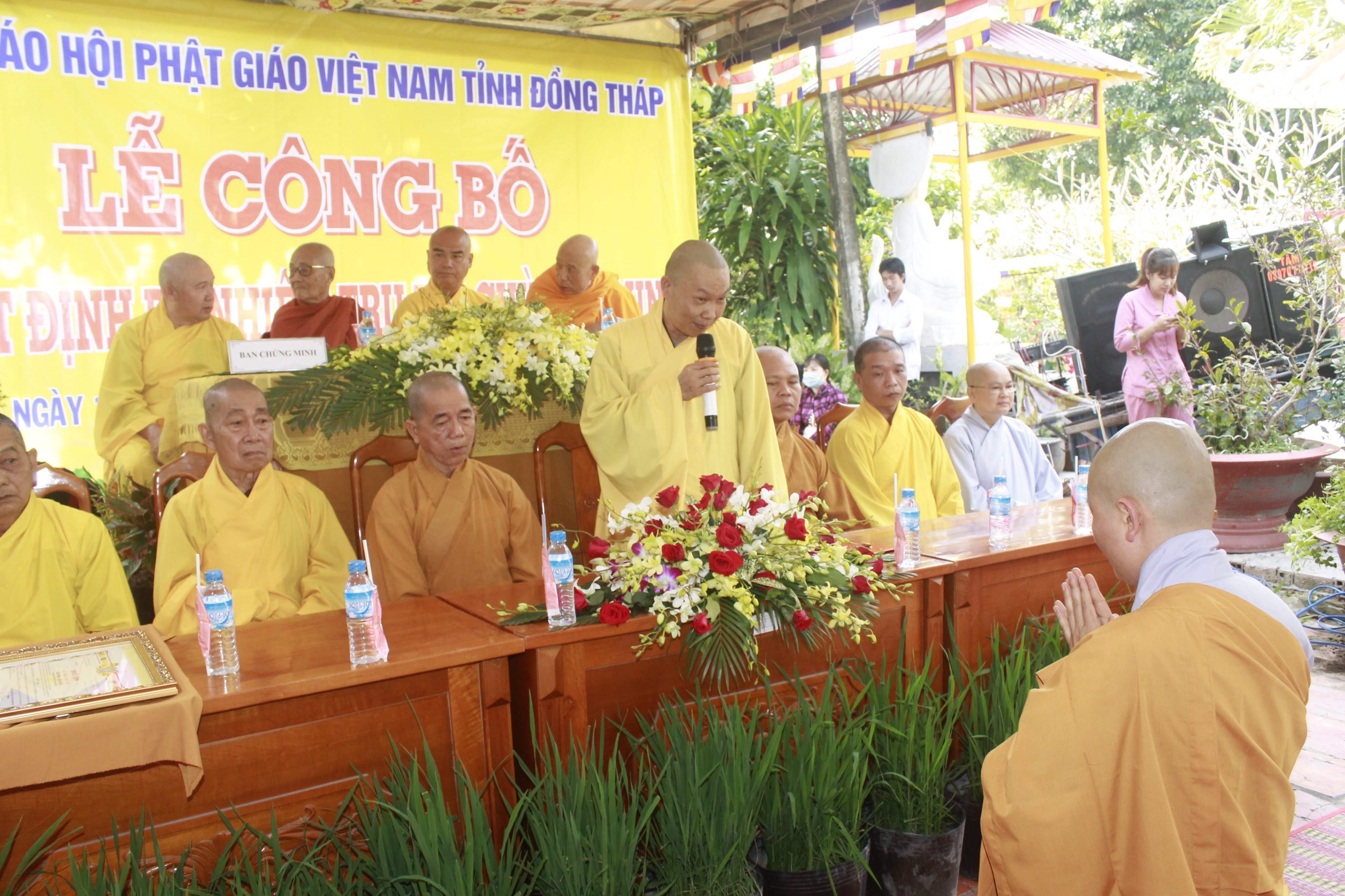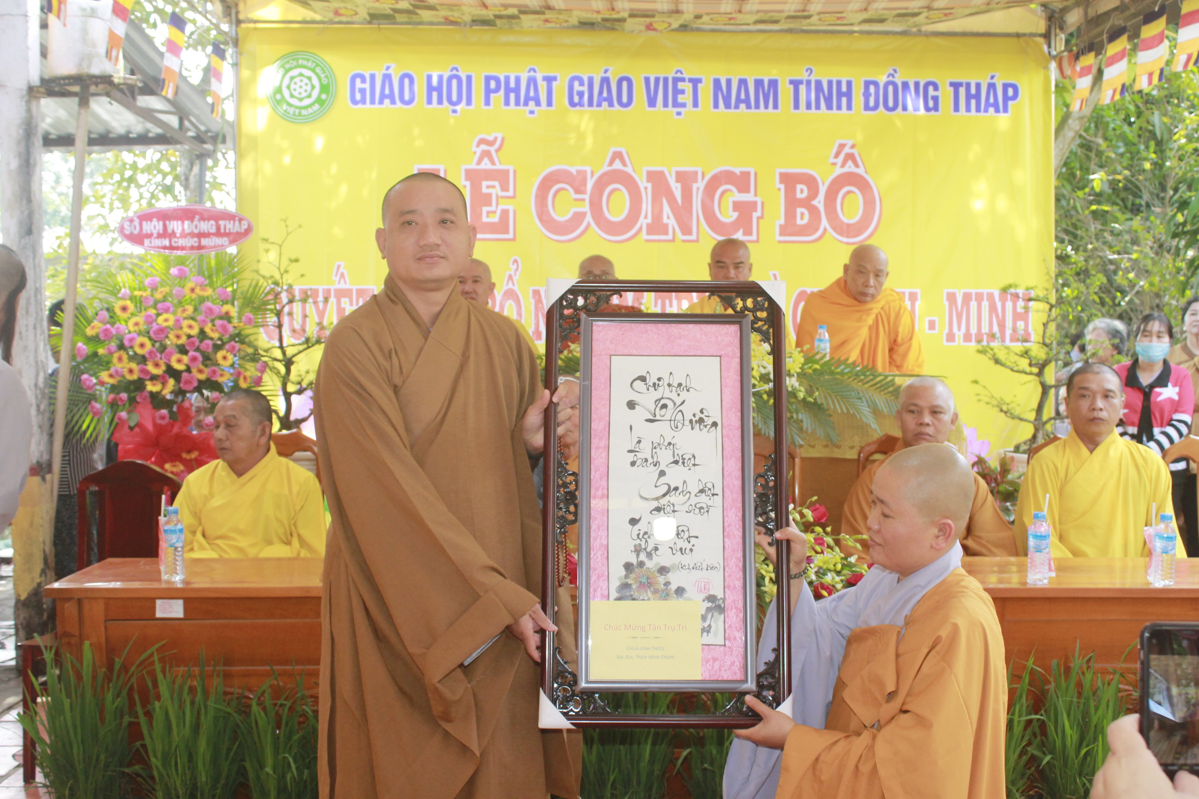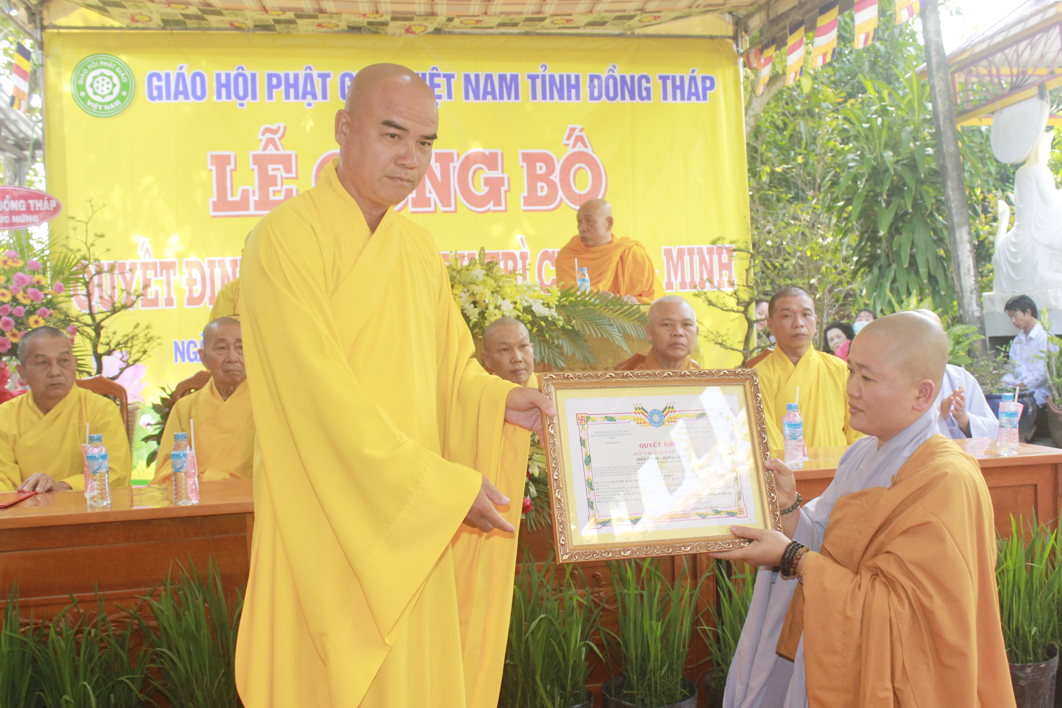 Đối trước chư Tôn đức chứng minh và chư vị khách quý cùng toàn thể Phật tử, Sư cô Thích nữ Tâm Như đã đón nhận Quyết định từ TT. Thích Tĩnh Triệt - Phó BTS GHPGVN tỉnh Đồng Tháp. Trong không khí trang nghiêm của buổi lễ, Sư cô Tân trụ trì xin phát nguyện làm tròn nhiệm vụ cao cả của sứ giả Như Lai, hoằng pháp lợi sanh, thực hiện đúng tinh thần Hiến chương GHPGVN và pháp luật nhà nước, phụng đạo giúp đời với phương châm “Đạo pháp và Dân tộc”.