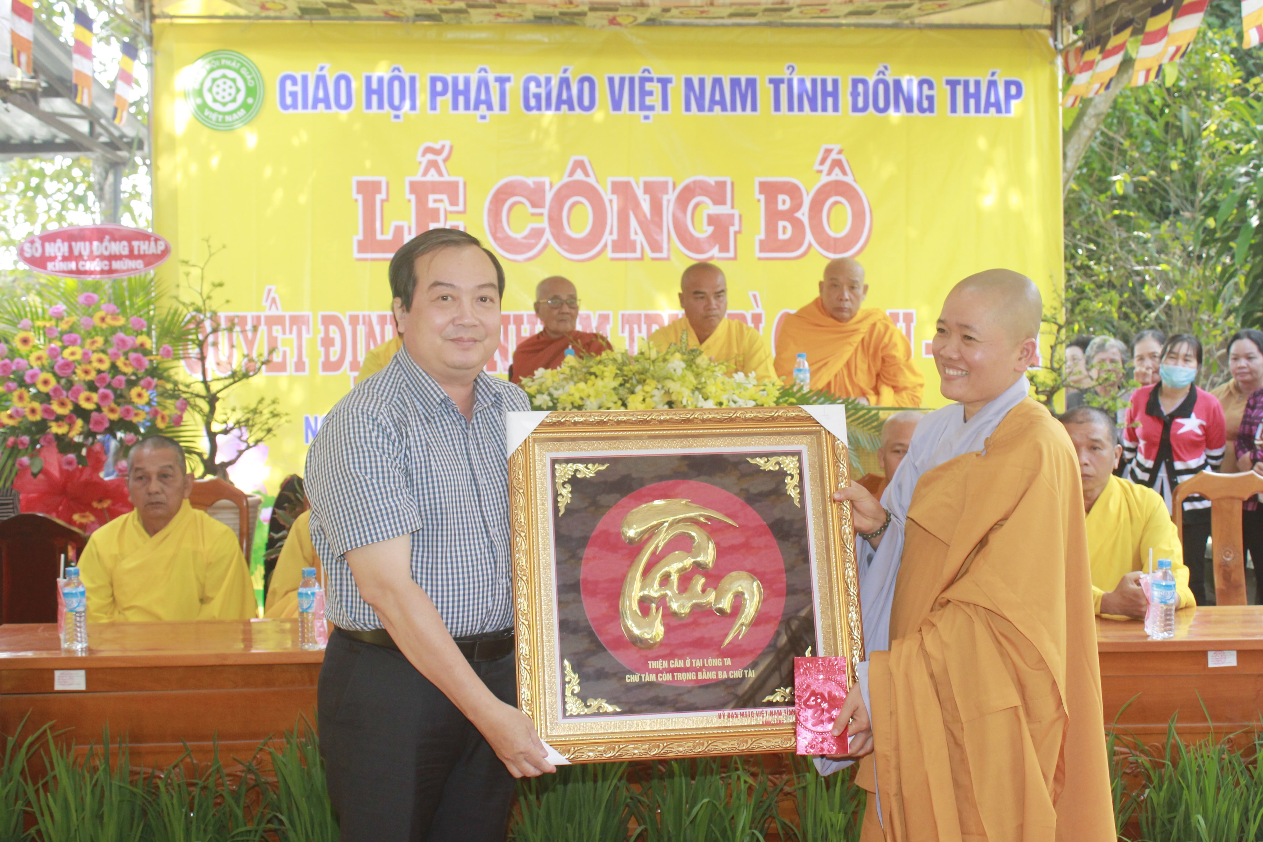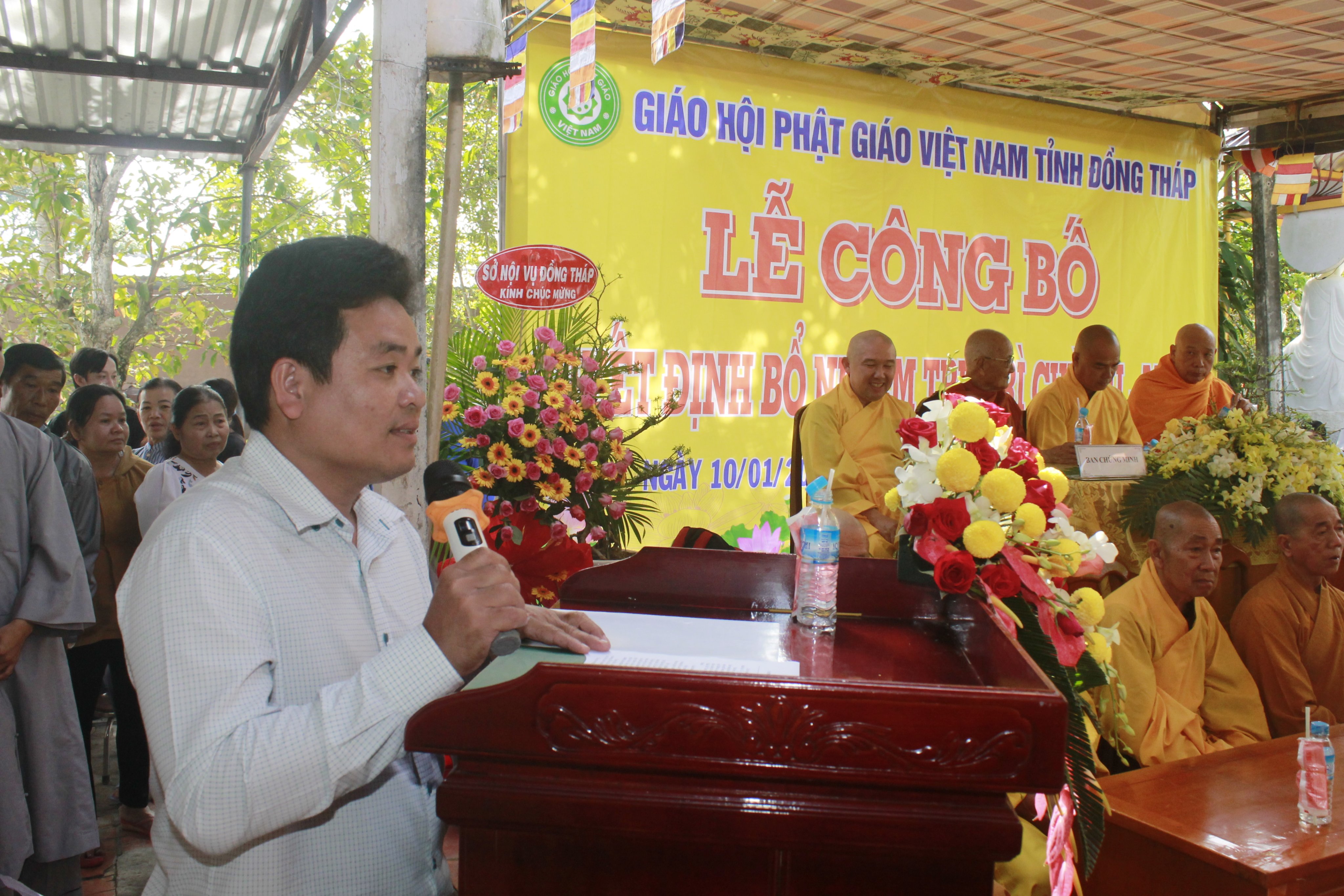 Thay mặt lãnh đạo chính quyền các cấp, ông Nguyễn Dung Thạch - Bí thư Đảng ủy, Chủ tịch UBND xã Long Hưng A đã phát biểu chúc mừng và chia sẻ niềm vui với Sư cô Tân trụ trì, mong rằng Sư cô phát huy đạo hạnh, đoàn kết hoà hợp tốt trong mọi Phật sự, hướng dẫn Phật tử tu học đúng Chánh pháp, đúng phương châm “Đạo pháp – Dân tộc –Xã hội Chủ nghĩa”.