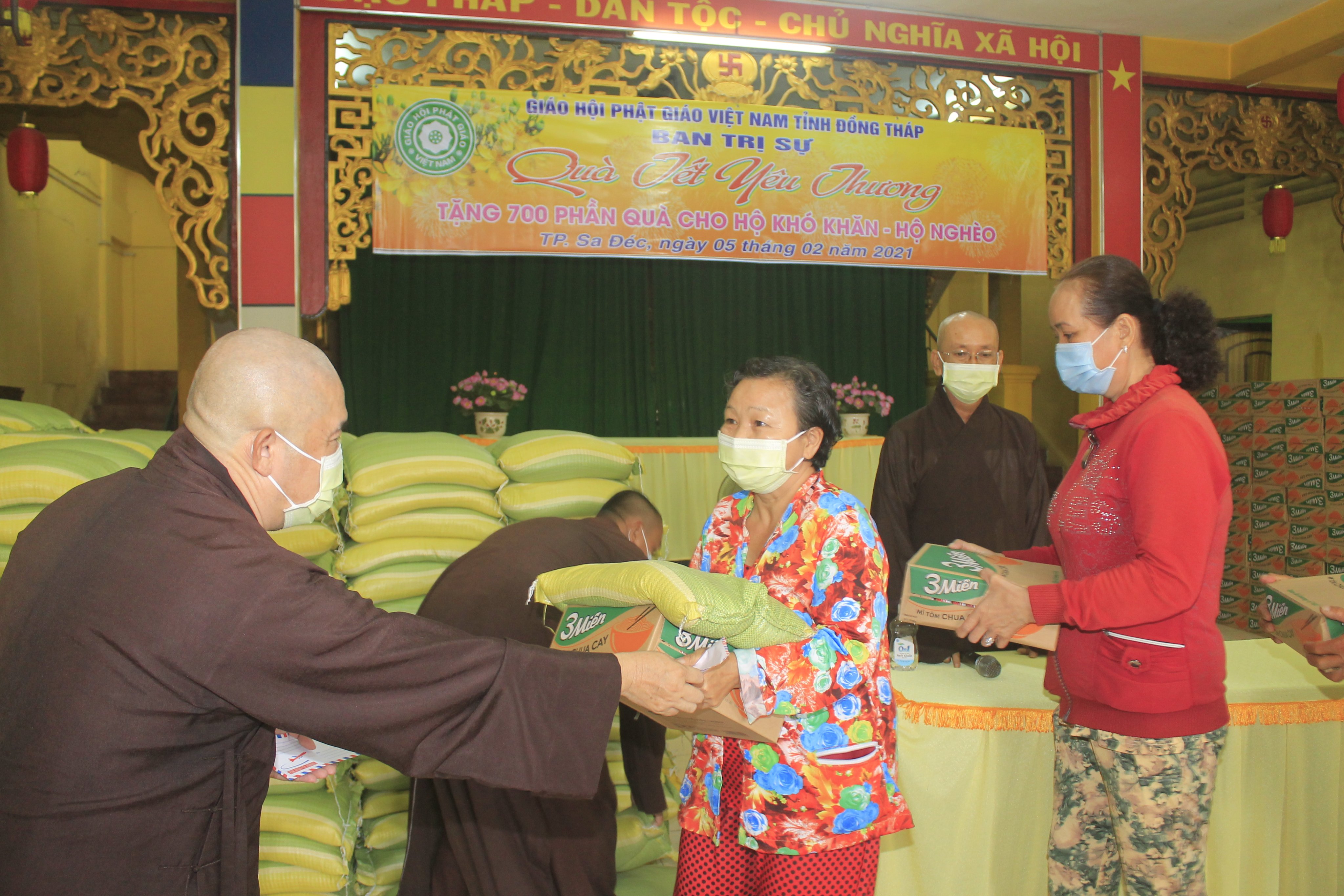 PSO - Hướng tới Tết Nguyên đán Tân Sửu 2021, BTS Phật giáo tỉnh Đồng Tháp đã triển khai nhiều hoạt động ý nghĩa vì người nghèo, giúp họ vượt qua khó khăn, đón Tết đầm ấm, an vui. Vào sáng ngày 05/02/2021, Phật giáo tỉnh Đồng Tháp đã tổ chức tặng 700 phần quà cho hộ khó khăn, hộ nghèo tại Văn phòng Ban Trị sự - chùa Bửu Quang (phường 01, TP. Sa Đéc), đồng thời gửi tặng 100 phần quà đến cán bộ biên phòng các tuyến biên giới thuộc tỉnh Đồng Tháp đang làm nhiệm vụ chốt chặn biên giới phòng chống Covid-19.