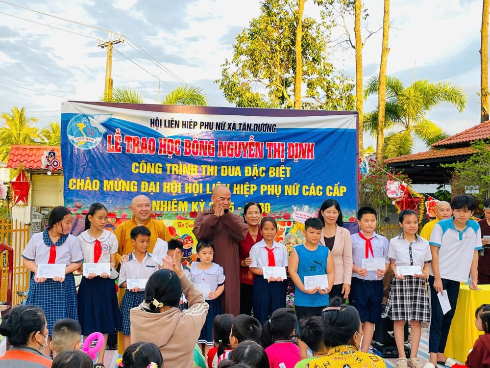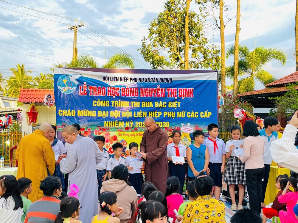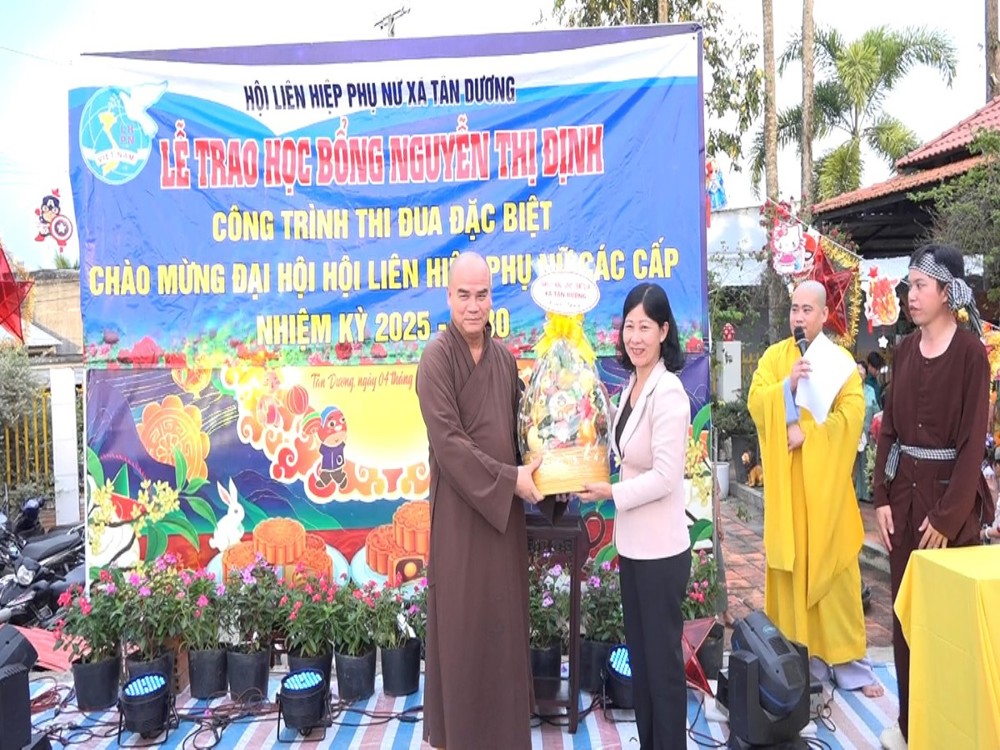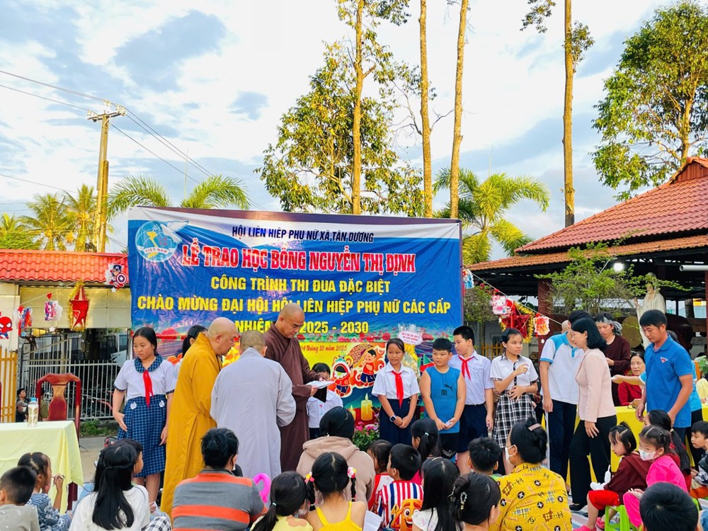 Sau đó là 1.500 phần quà trung thu mỗi phần trị giá 150 nghìn đồng cũng như 20 suất học bổng mang tên “Nguyễn Thị Định”, mỗi suất trị giá 500 nghìn đồng được chư Tôn đức, quý quan khách trao tận tay đến các em thiếu nhi trở về tham dự.