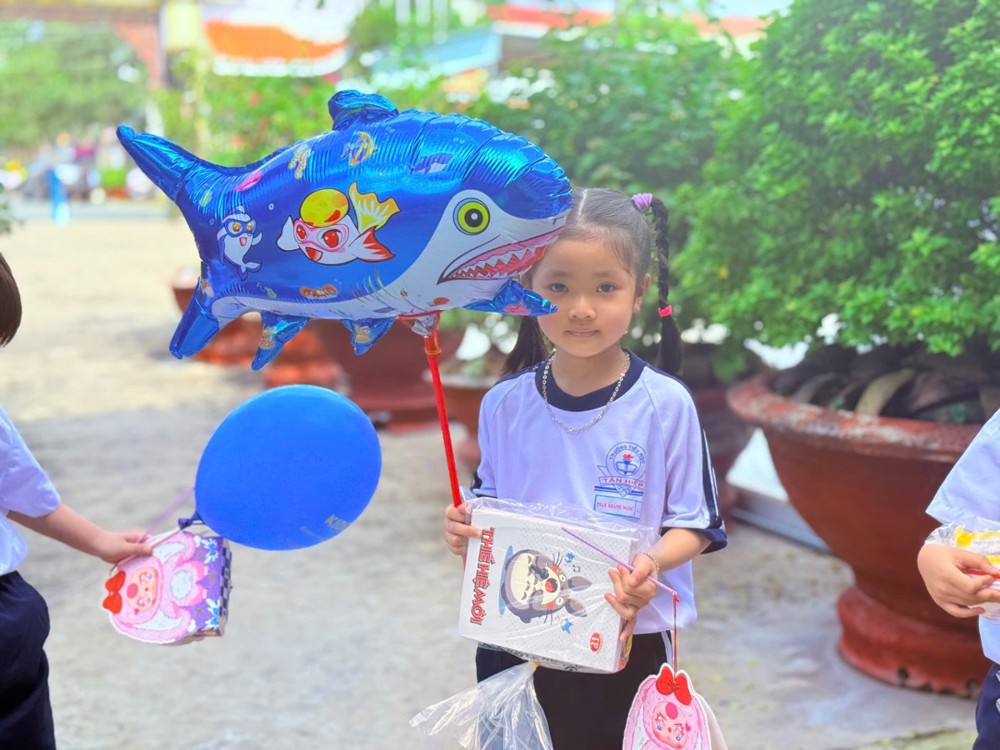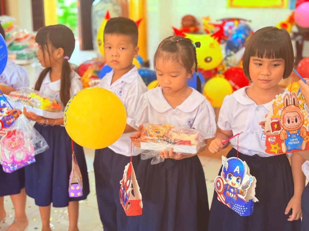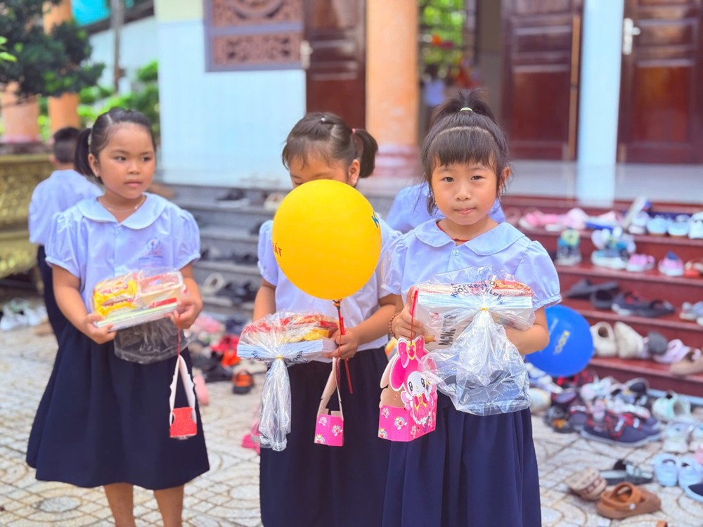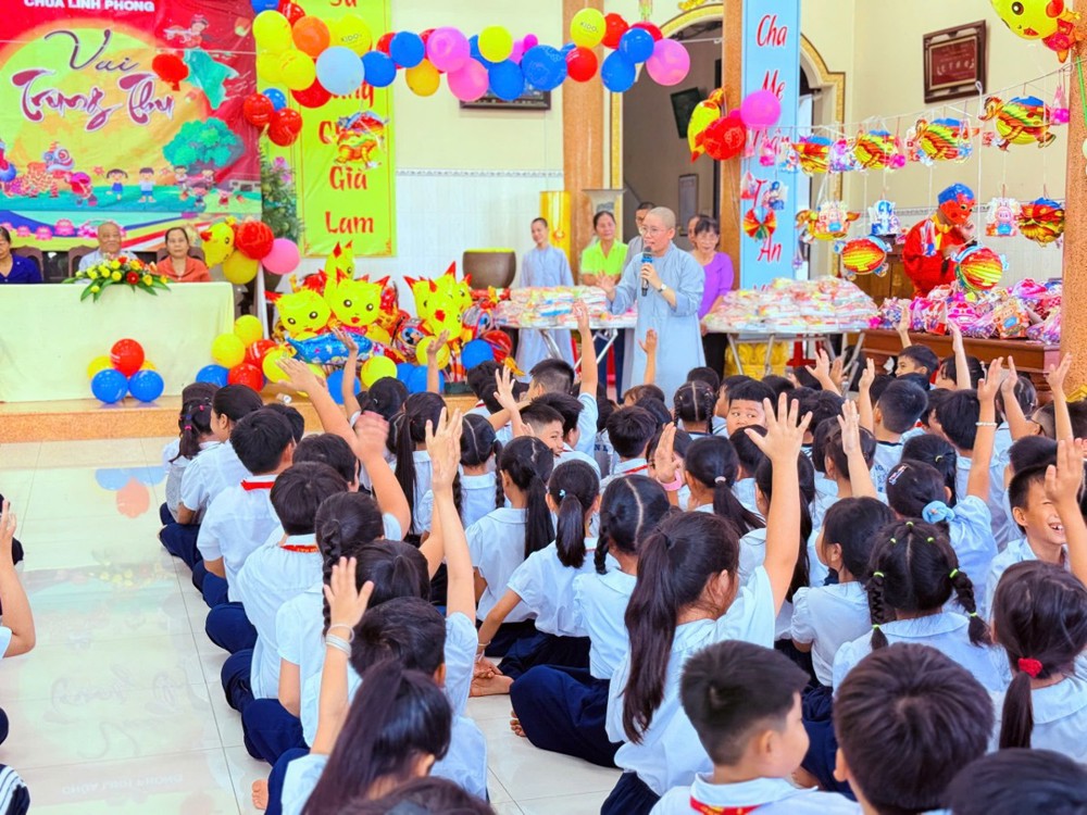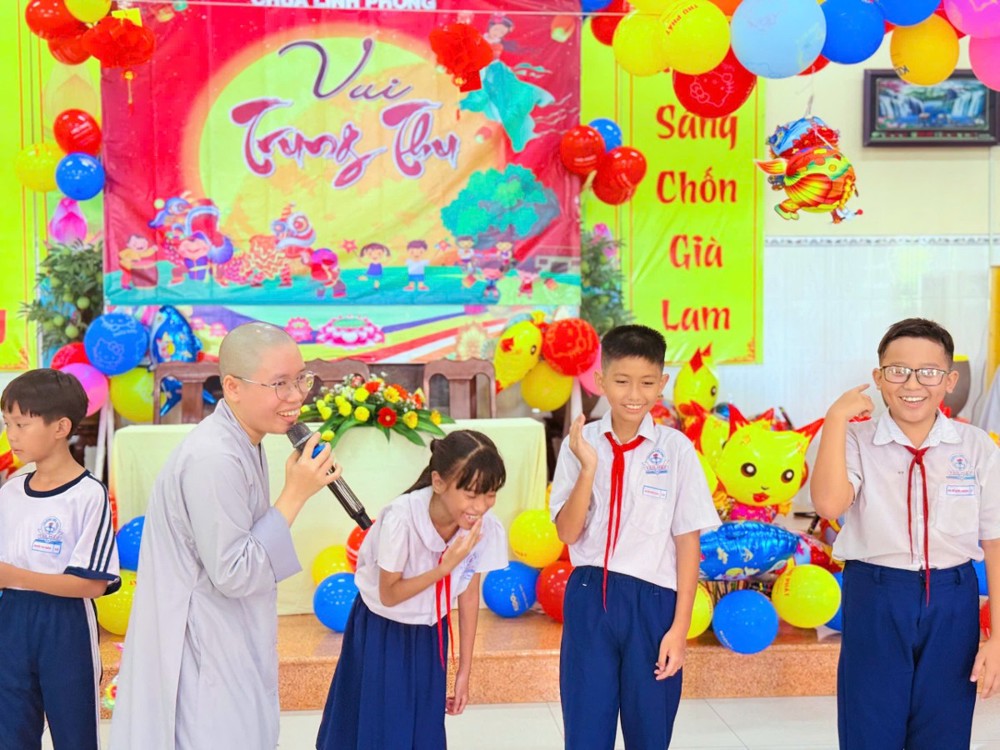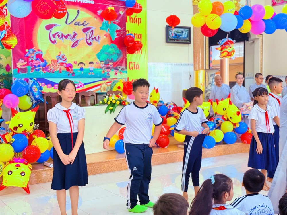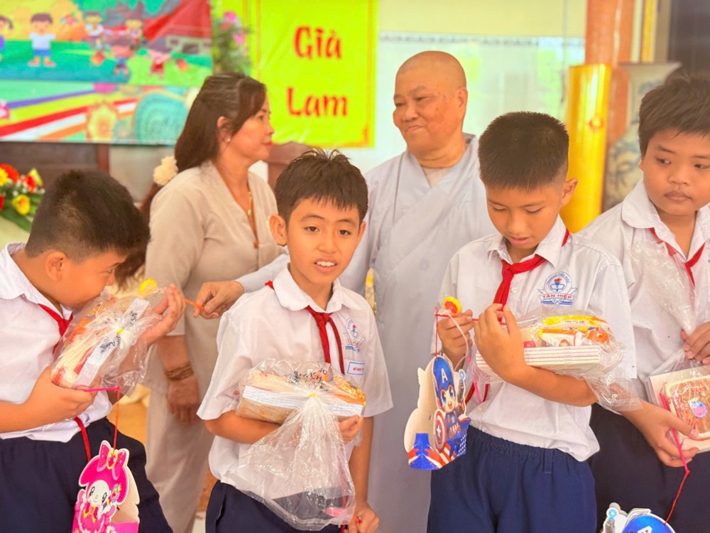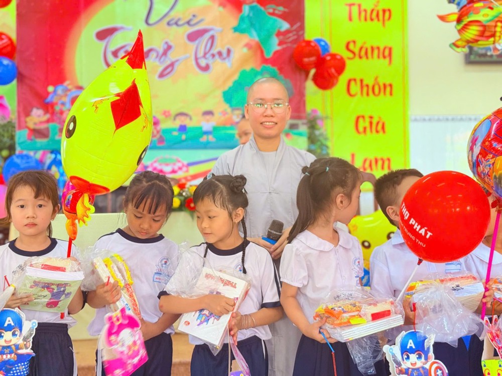 Cuối chương trình, Ni trưởng cùng với các Phật tử trao những phần quà bánh, lồng đèn trung thu, tập viết và bong bóng. Món quà tuy nhỏ nhưng chứa đựng tình cảm sâu sắc của nhà chùa gửi đến các em trong mùa Trung thu ấm áp.