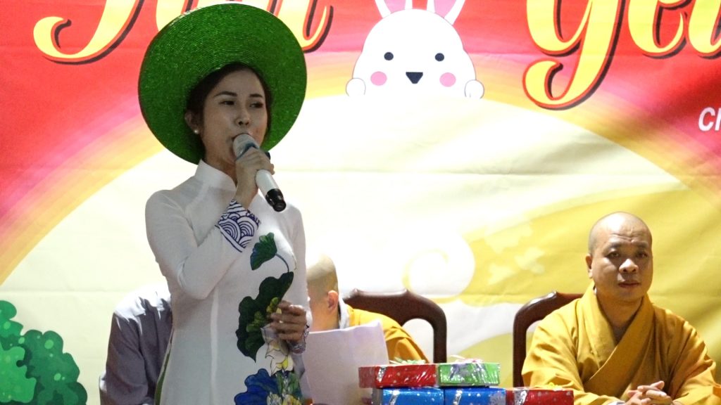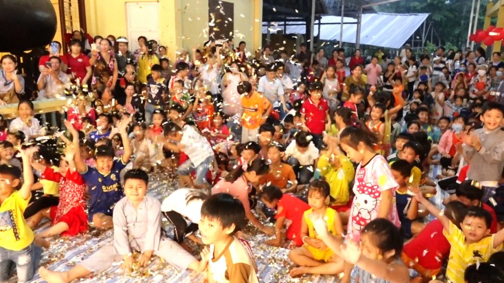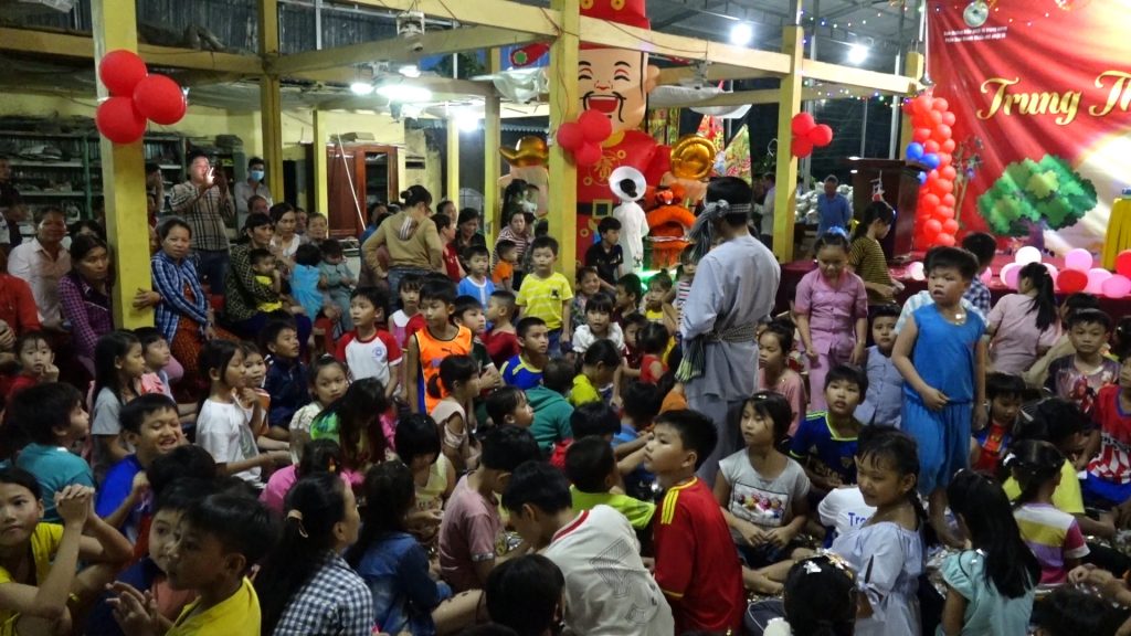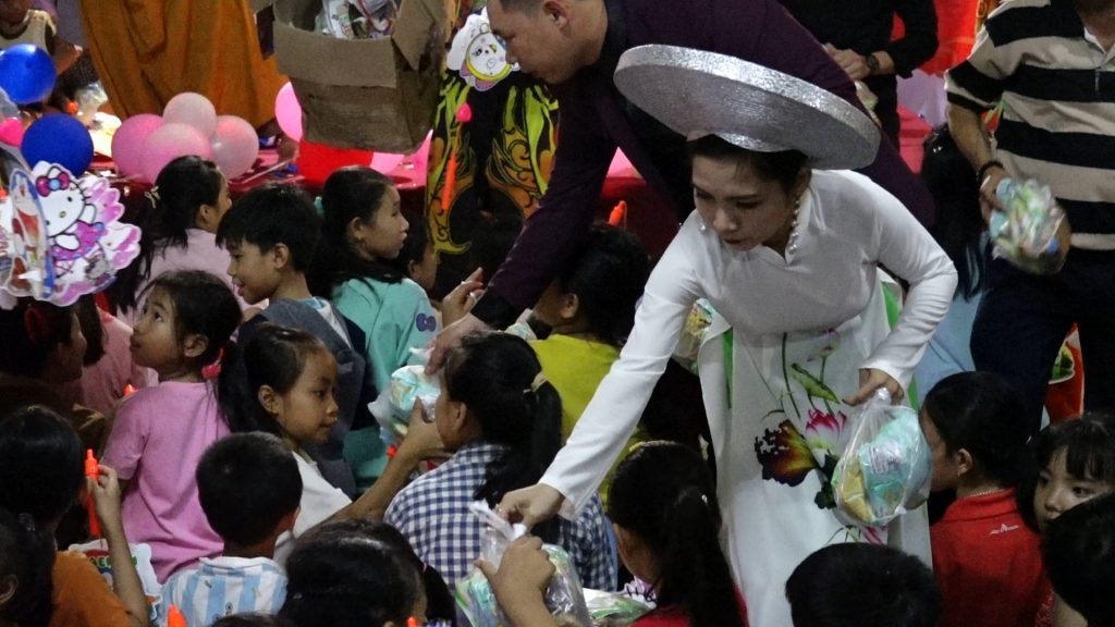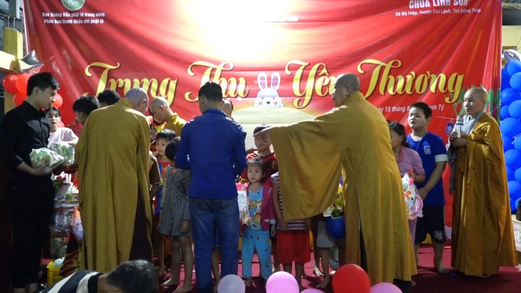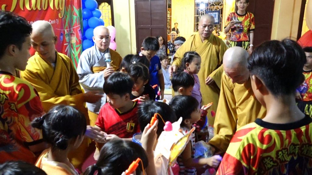 Cuối chương trình, quý chư Tôn đức cùng các bạn Phật tử thiện nguyện đã trao 300 phần quà đến cho các em thiếu nhi, mỗi phần quà gồm: bánh, kẹo, đèn lồng… trị giá cho mỗi phần quà gần 100 ngàn đồng.